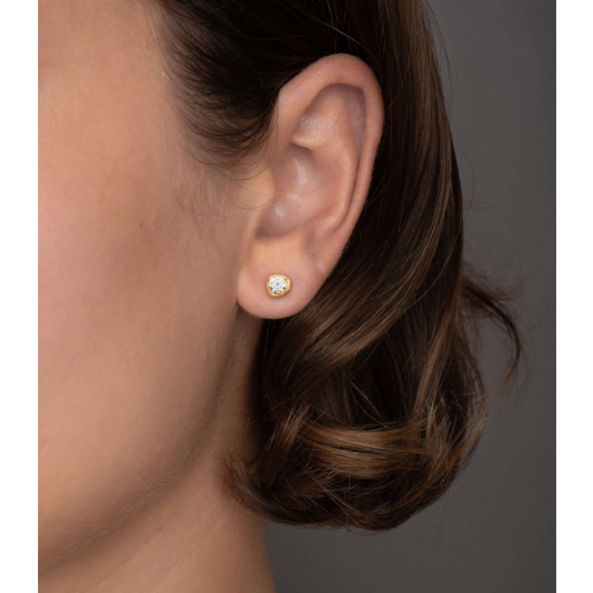 Med deres stjernelignende glans synes diamanterne at løfte sig og svæve i den bløde, organiske krans af børstet guld. Designet skaber en illusion af en flydende bevægelse, hvor diamanterne skinner med intensitet samtidig med, at de lægger sig yndefuldt mod øret.