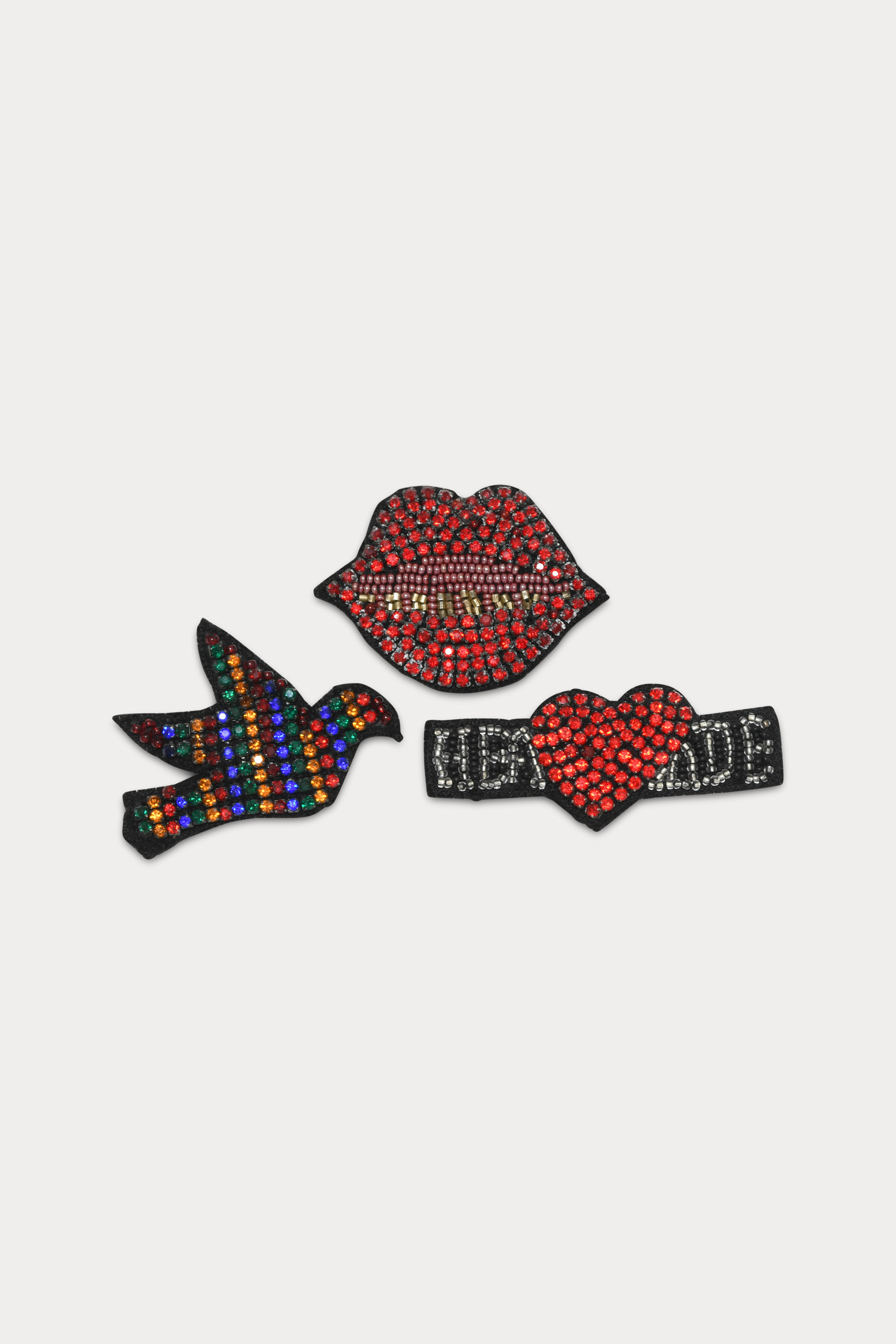 Gemmy badges er et sæt af tre brocher dekoreret med farverige sten i forskellige designs. Tilføj et sjovt og personligt touch til dit outfit.