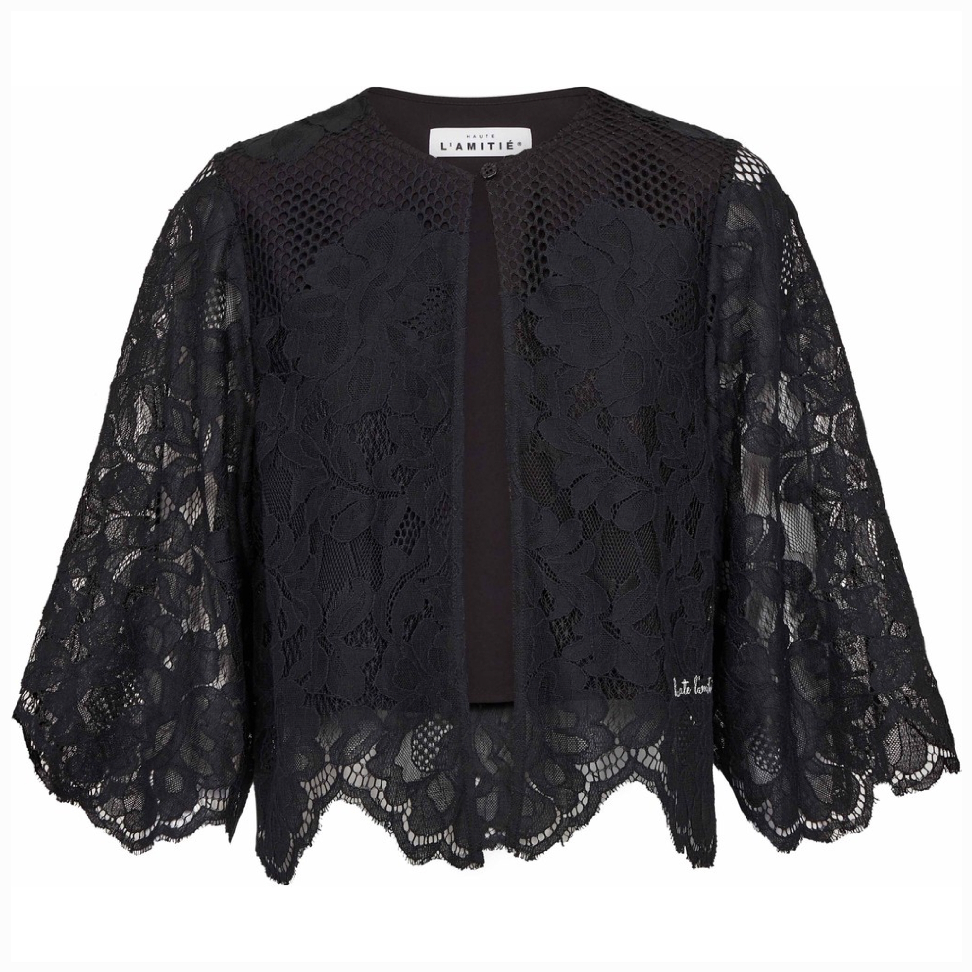 Curvey Lace Hem Bolero fra Haute L’Amitié. Fremstillet i delikat sort blonde med fine blomsterdetaljer og et raffineret, buet søm, kombinerer denne bolero klassisk femininitet med moderne sofistikering.