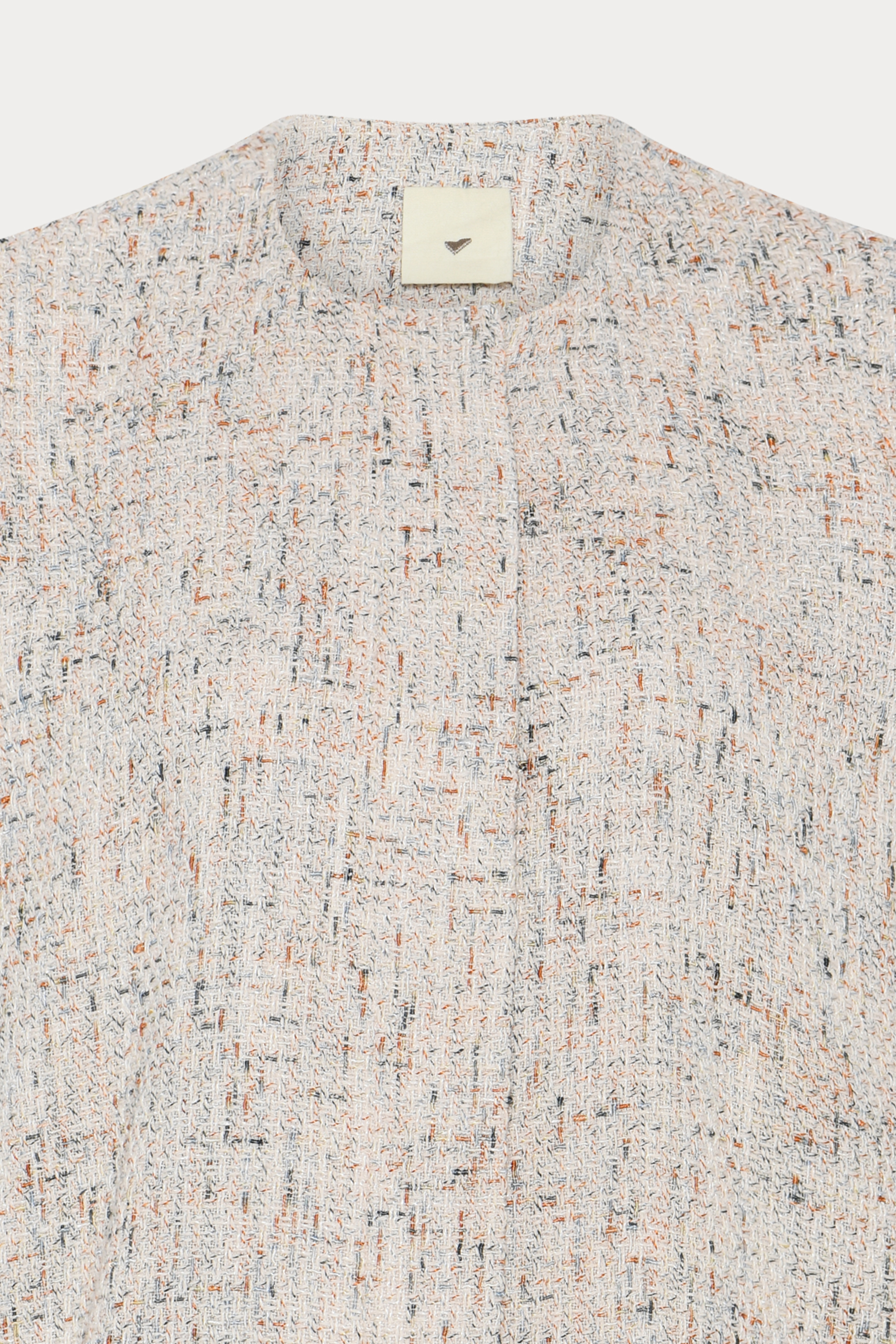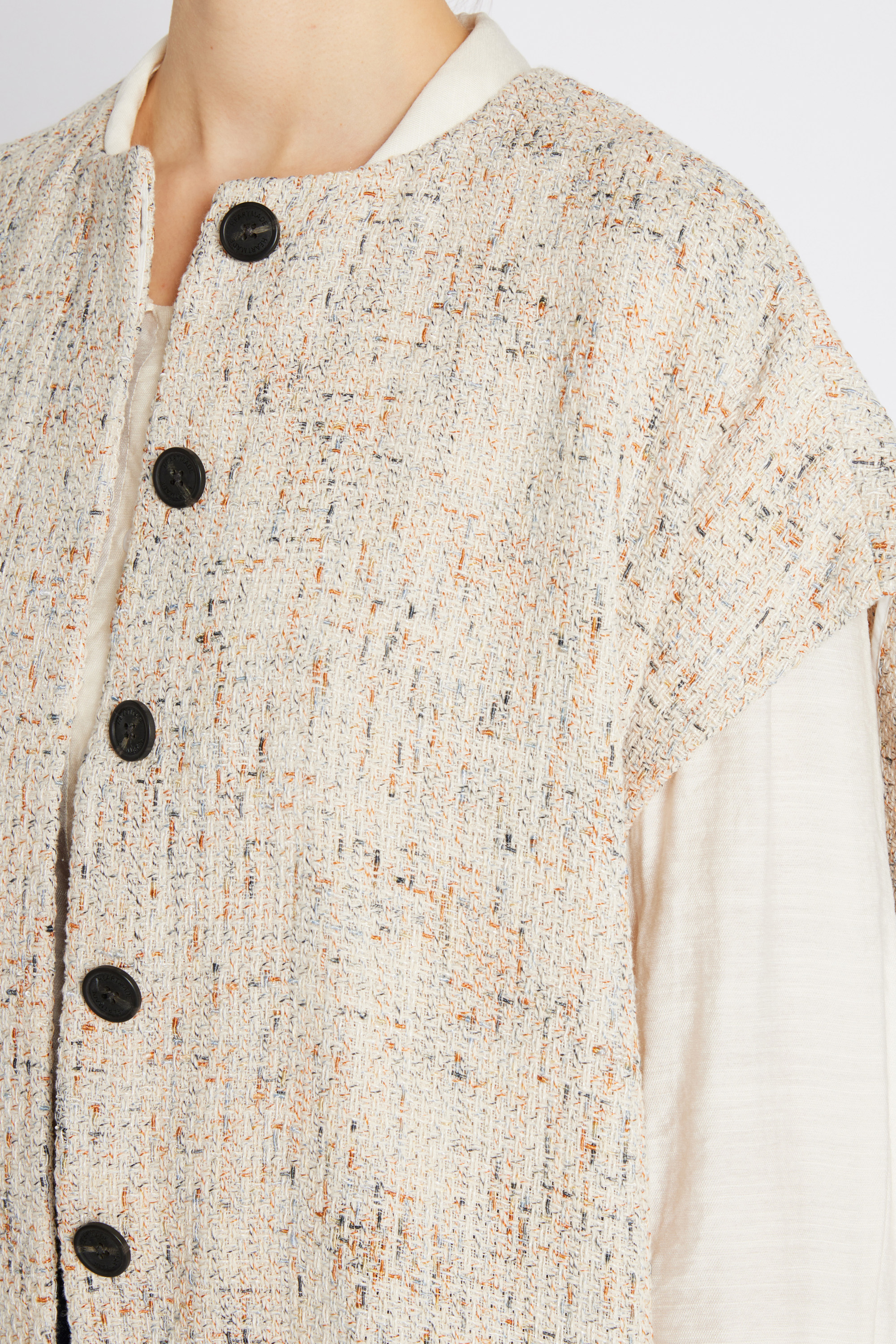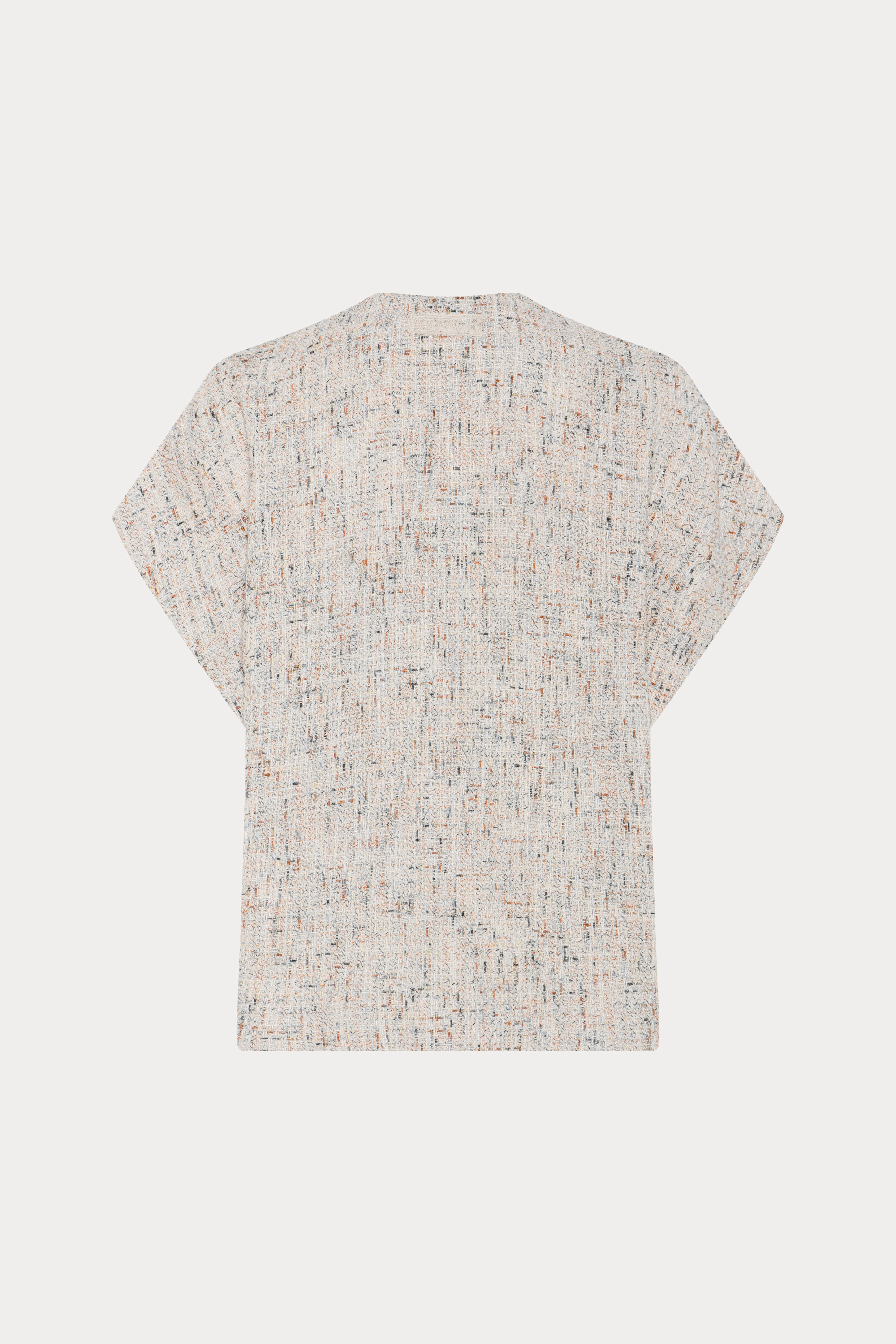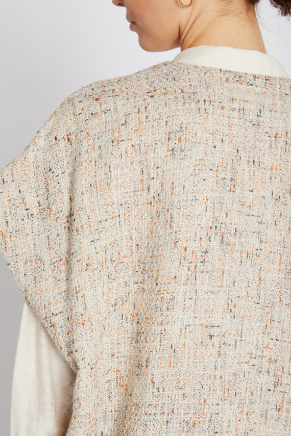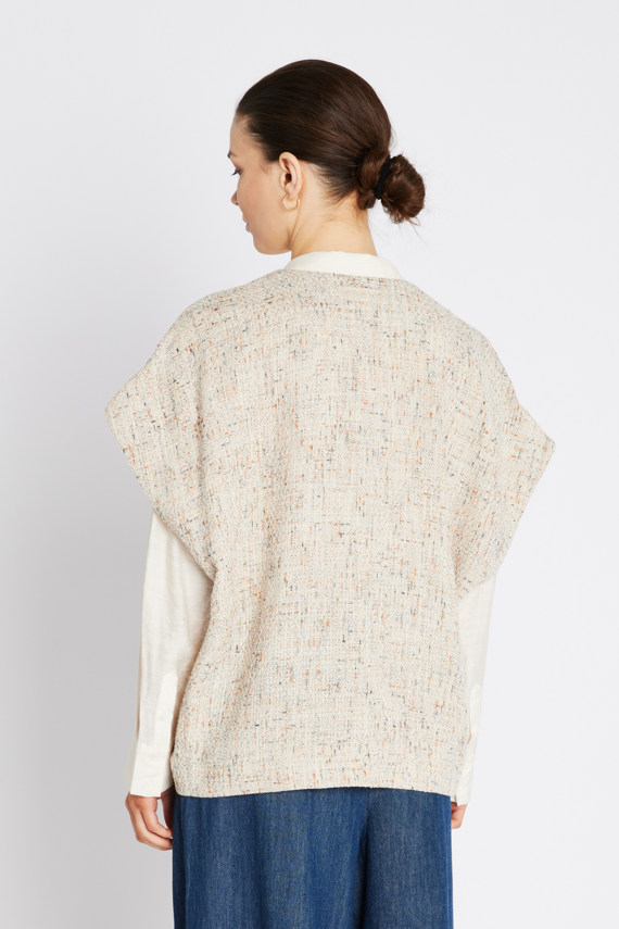 322HMBecca er en kort, ærmeløs vest med rund halsudskæring og skjult lukning foran. Fremstillet i en eksklusiv broderet kvalitet, der giver et kunstnerisk og elegant udtryk.