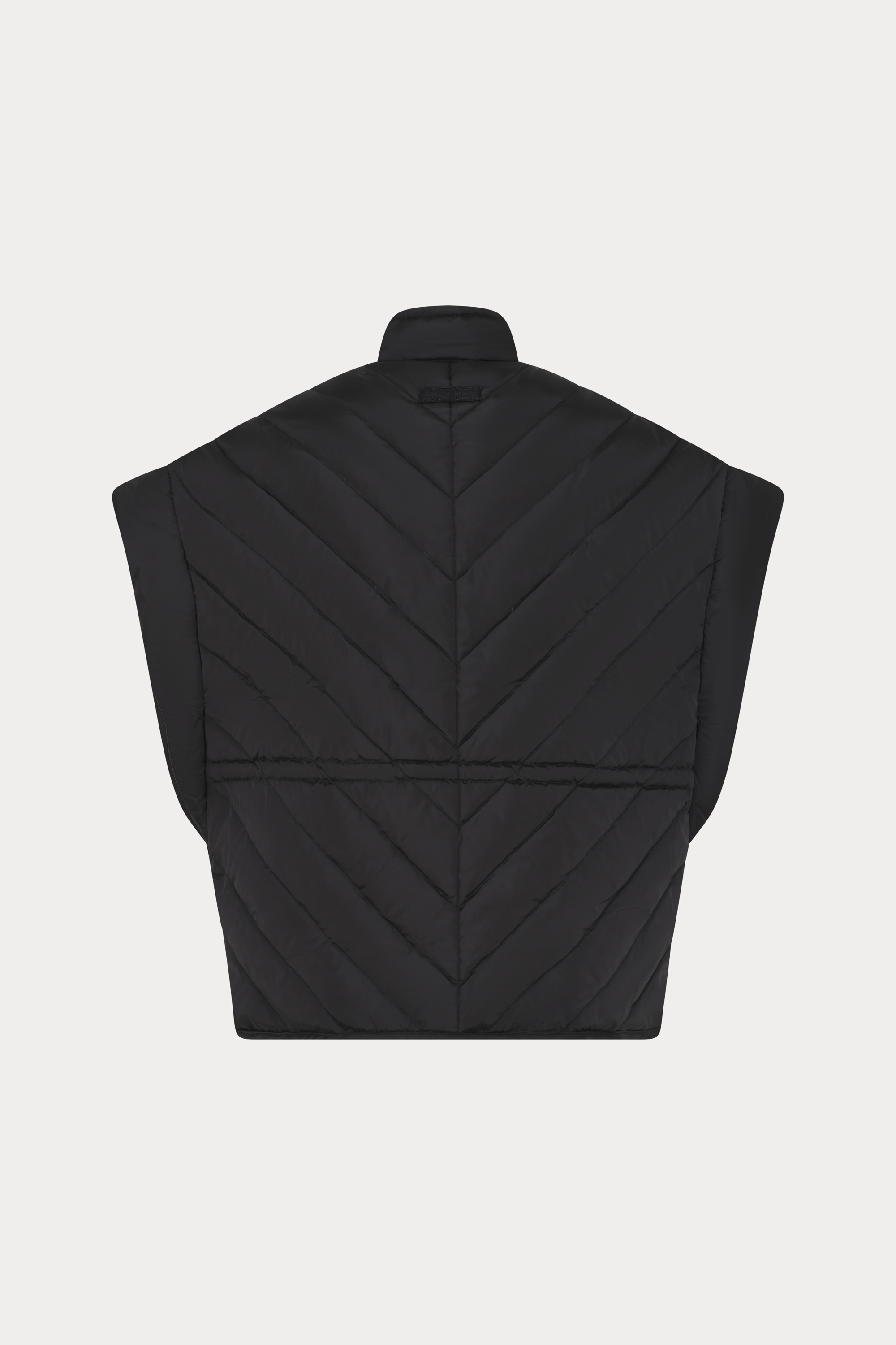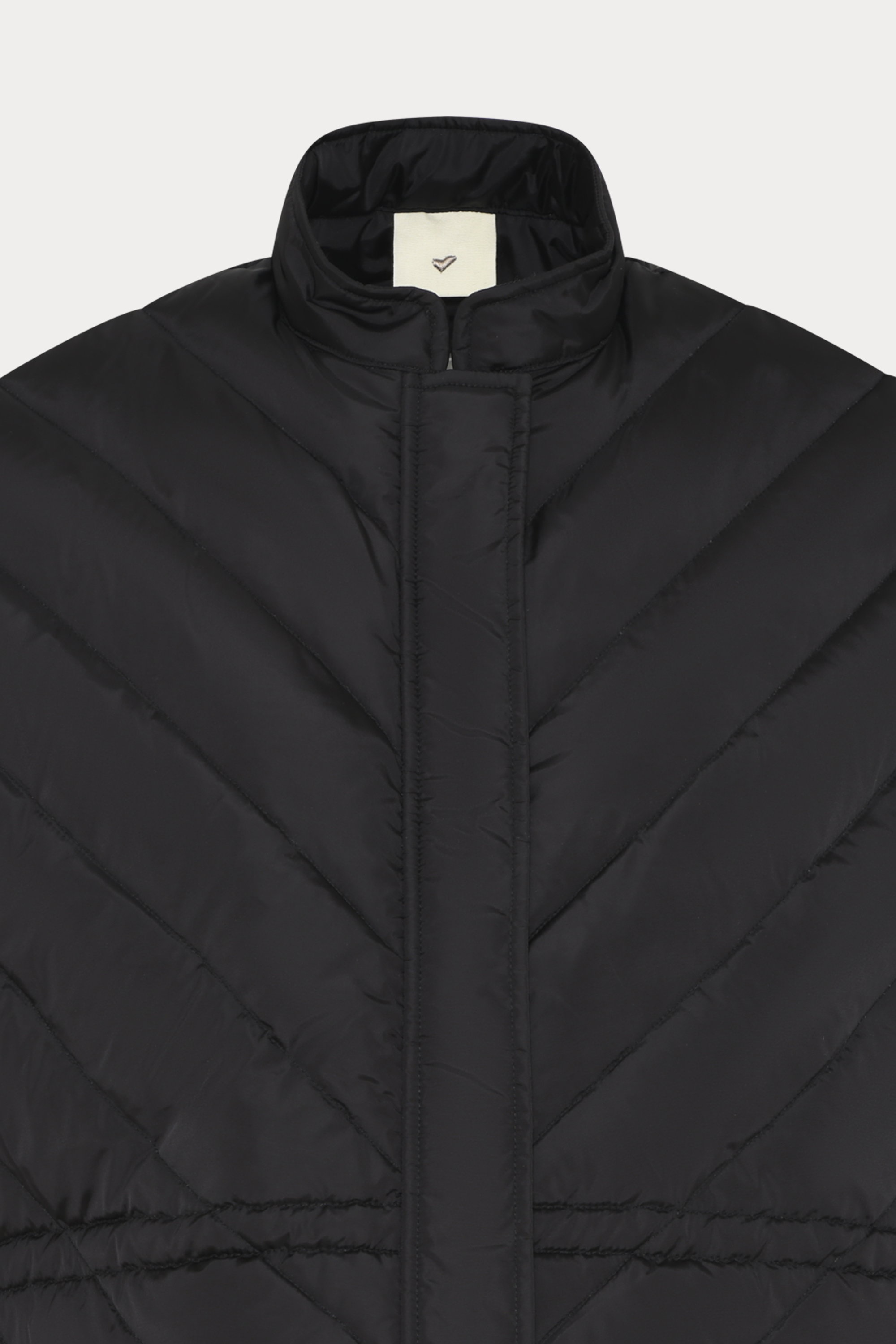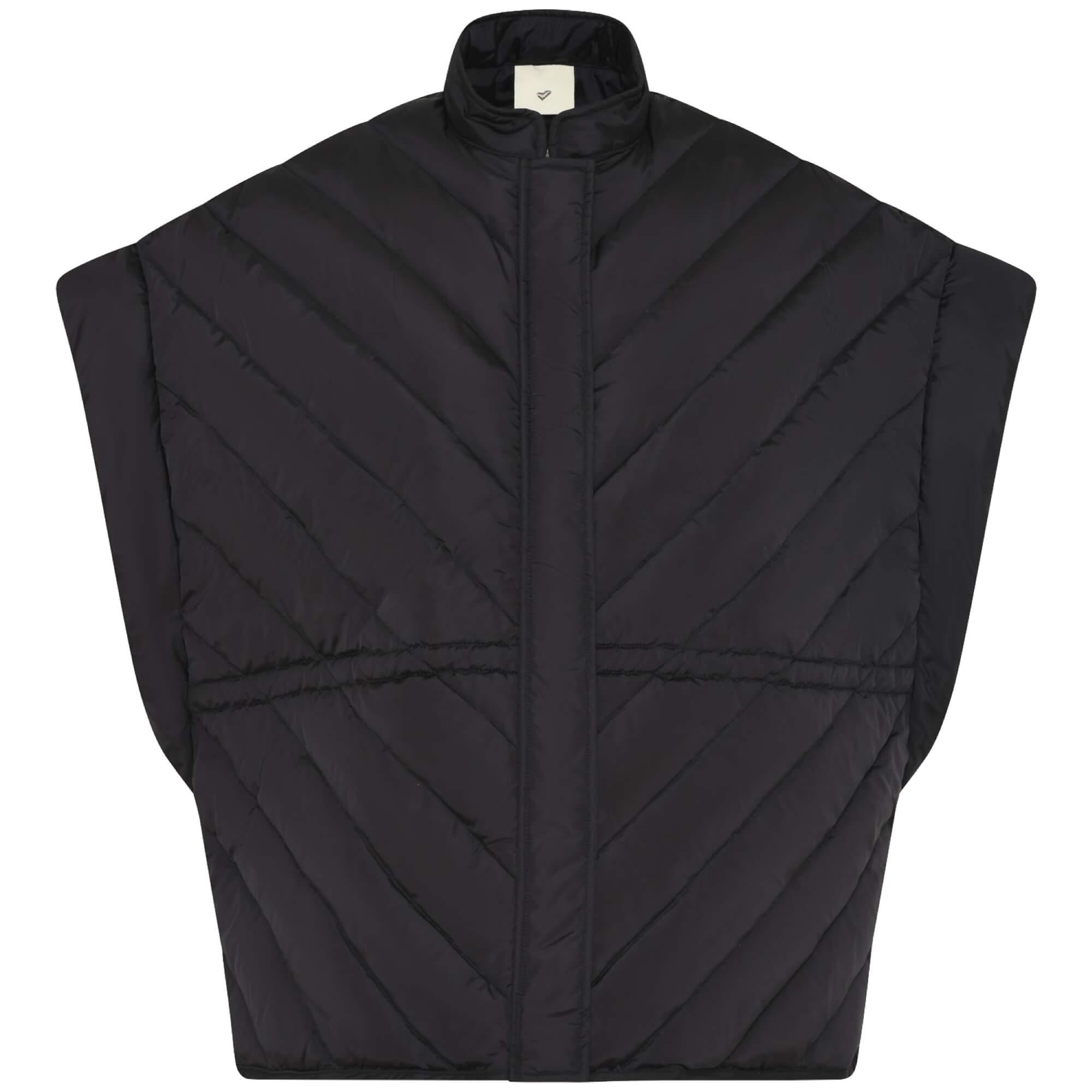 HMBila kappe er en voluminøs, ærmeløs kappe med defineret skulder og høj krave. Det diagonale quilt mønster tilfører struktur og tyngde.