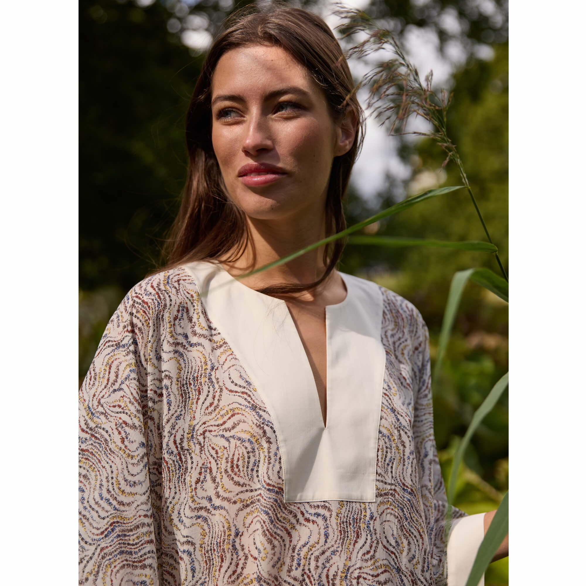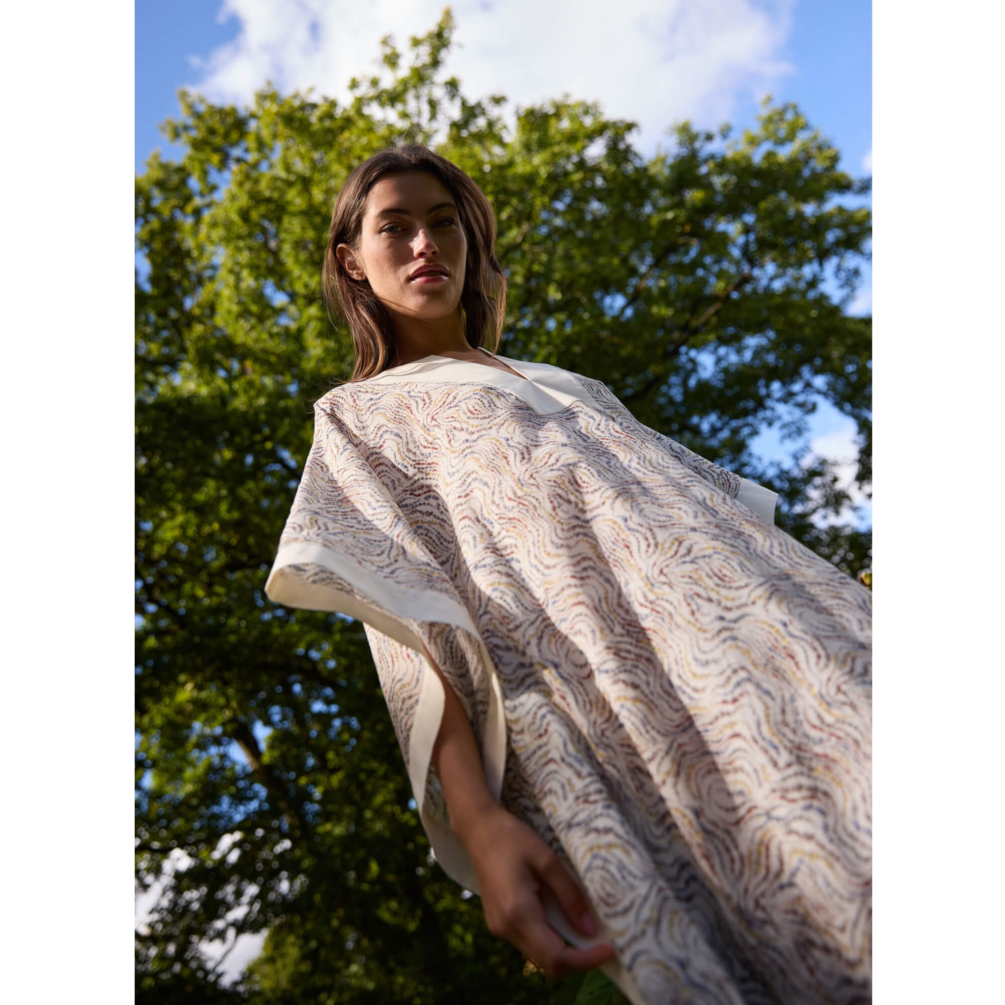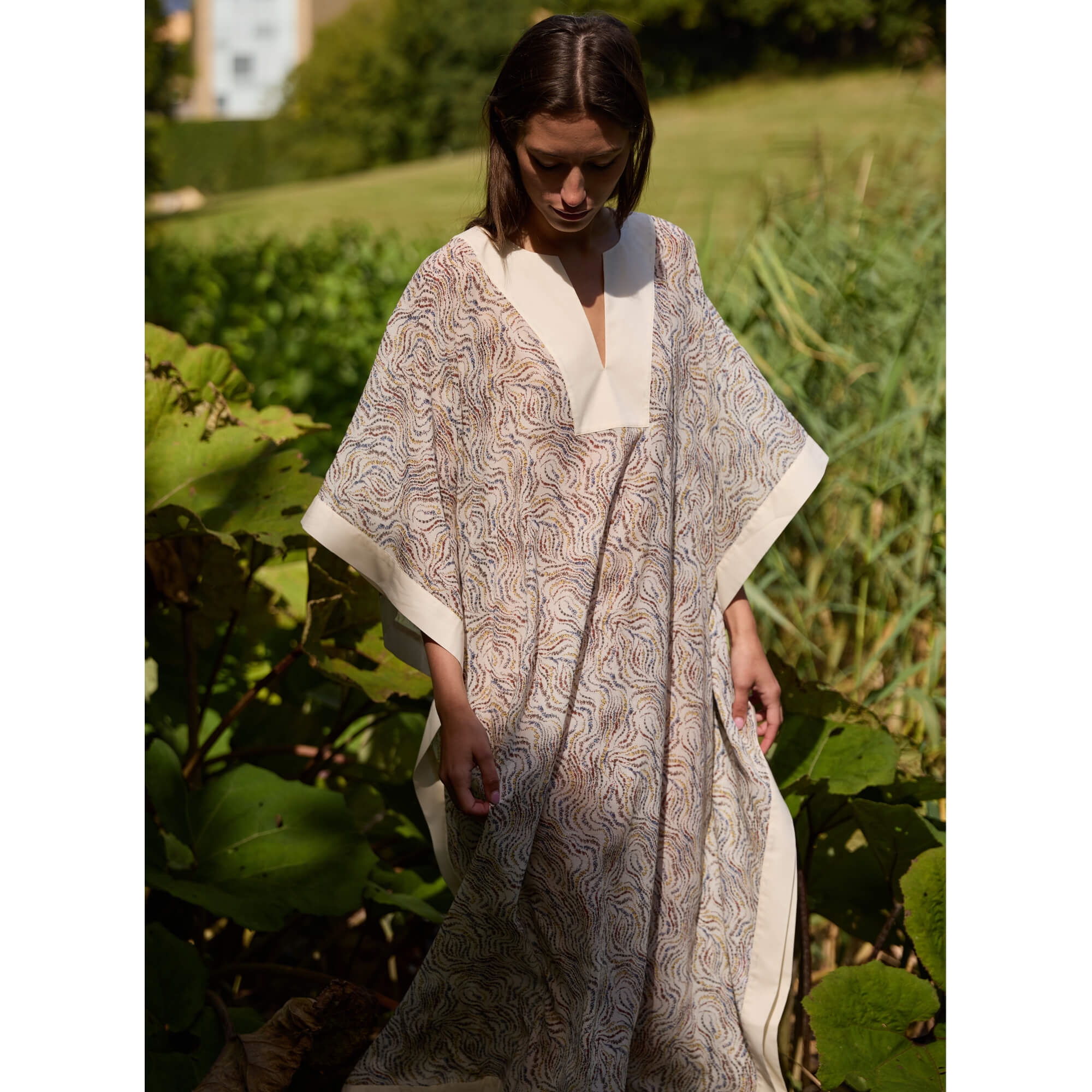 Kjolen er inspireret af kaftan-stilen med en V-udskæring og brede, løse ærmer. Kjolen har de fineste kontrastdetaljer ved hals, ærmer og kant og den lette og bløde kvalitet gør den behagelig at have på. En perfekt kjole til de varme dage. Brug den med sandaler for et afslappet sommerlook, eller style den med hæle og smykker, hvis du vil gøre den mere elegant.