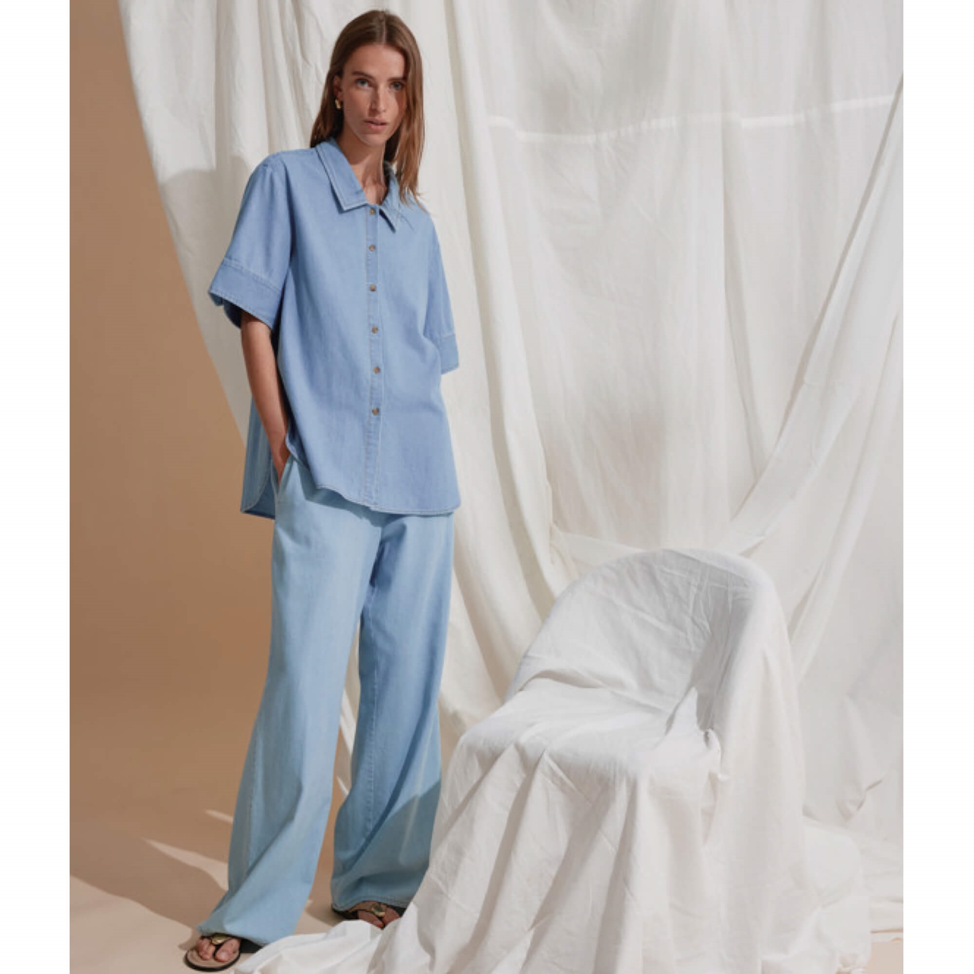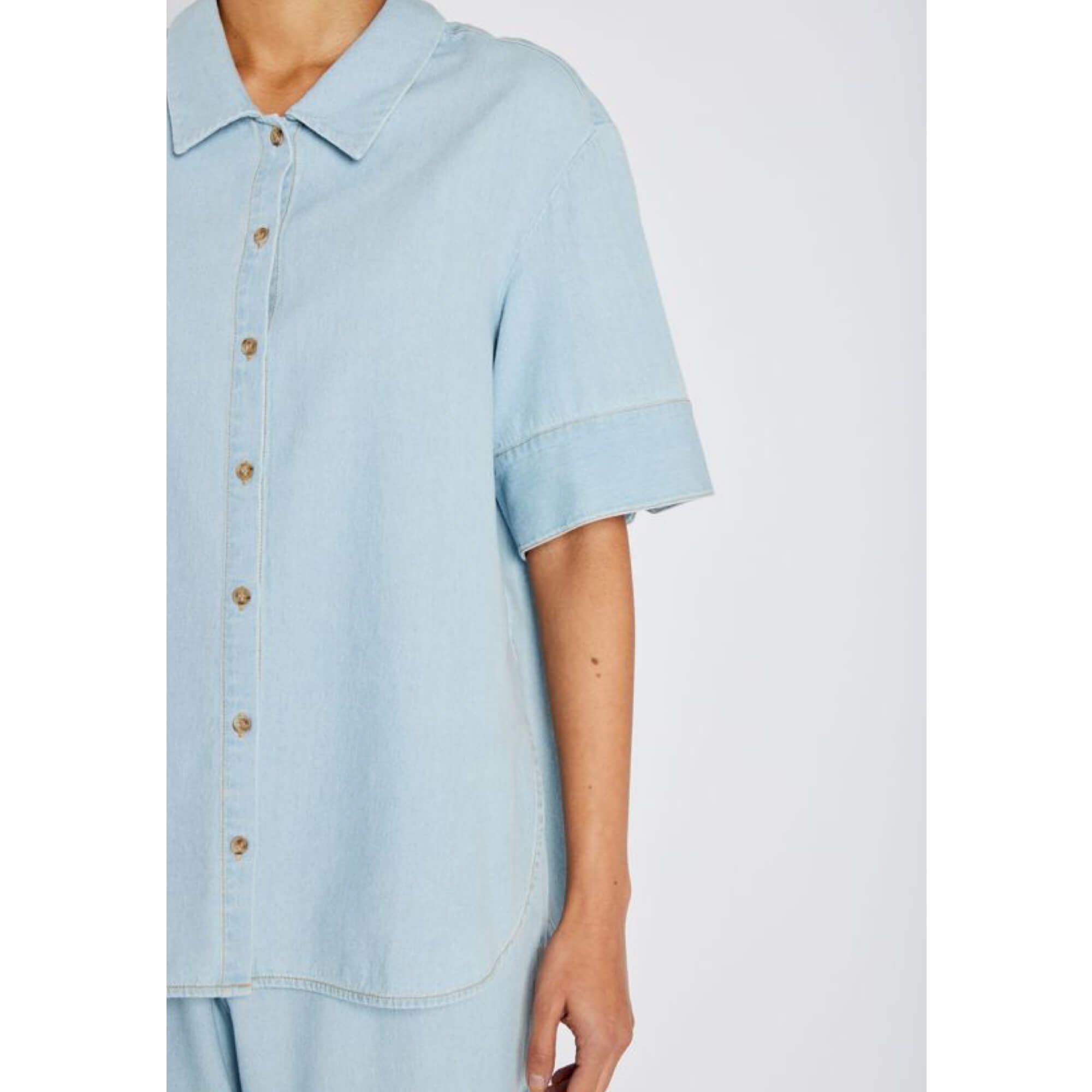 Den smukke HMMatea skjorte er en afslappet denimskjorte med bred krave, korte ærmer og afrundet kant, der giver et let og ubesværet udtryk. Style den med brede denimbukser for et tone-i-tone look, eller kombiner den med en enkel nederdel for en blød kontrast i silhuetten.