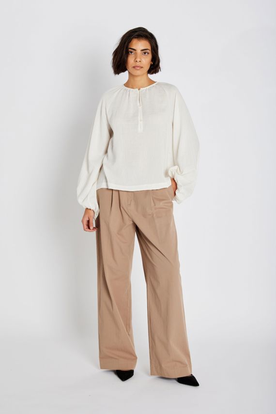415HMNista pants are relaxed, straight-leg trousers in a soft neutral tone, making them easy to style across seasons. The clean silhouette balances structure in the front with comfortable elasticity at the back waist.
