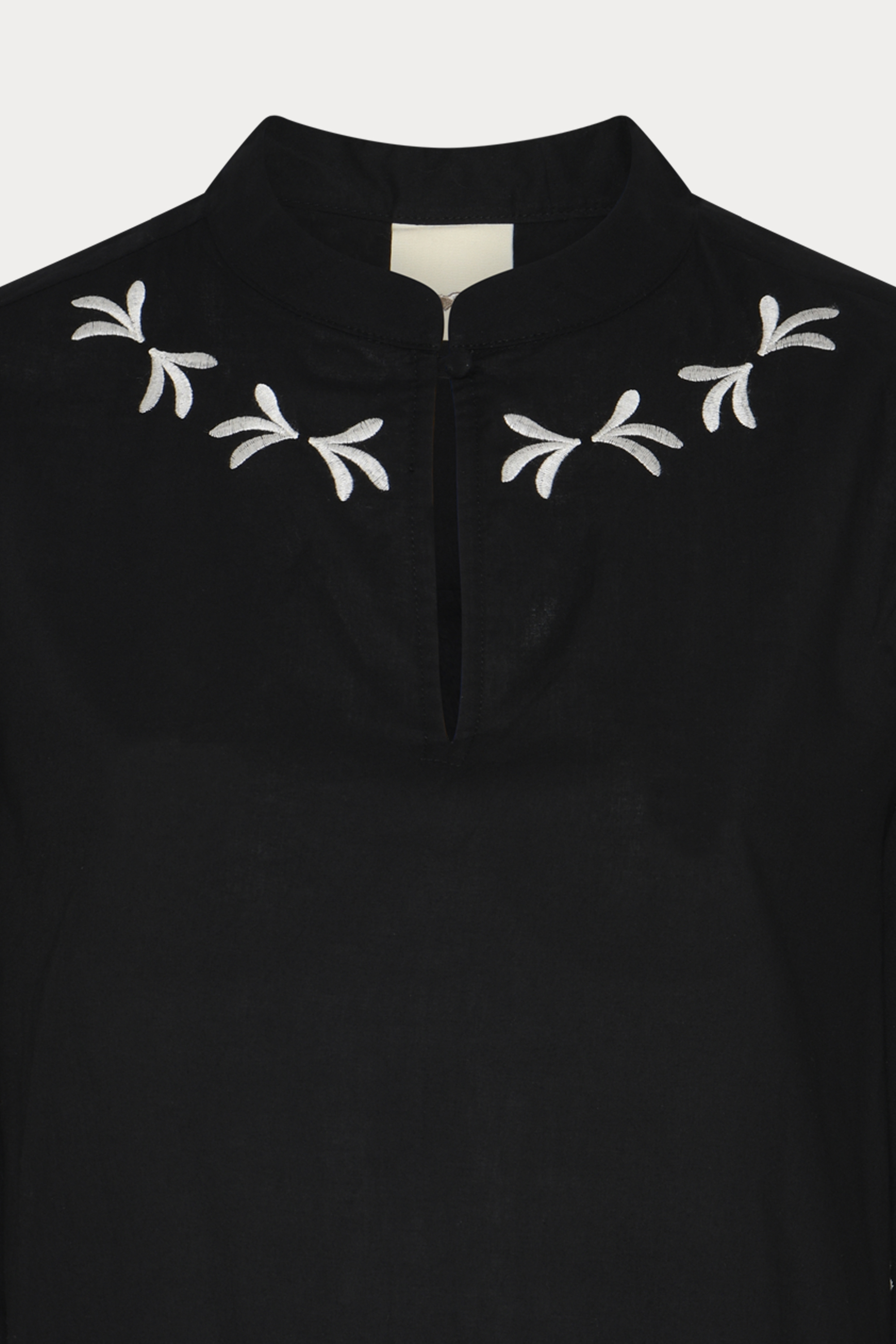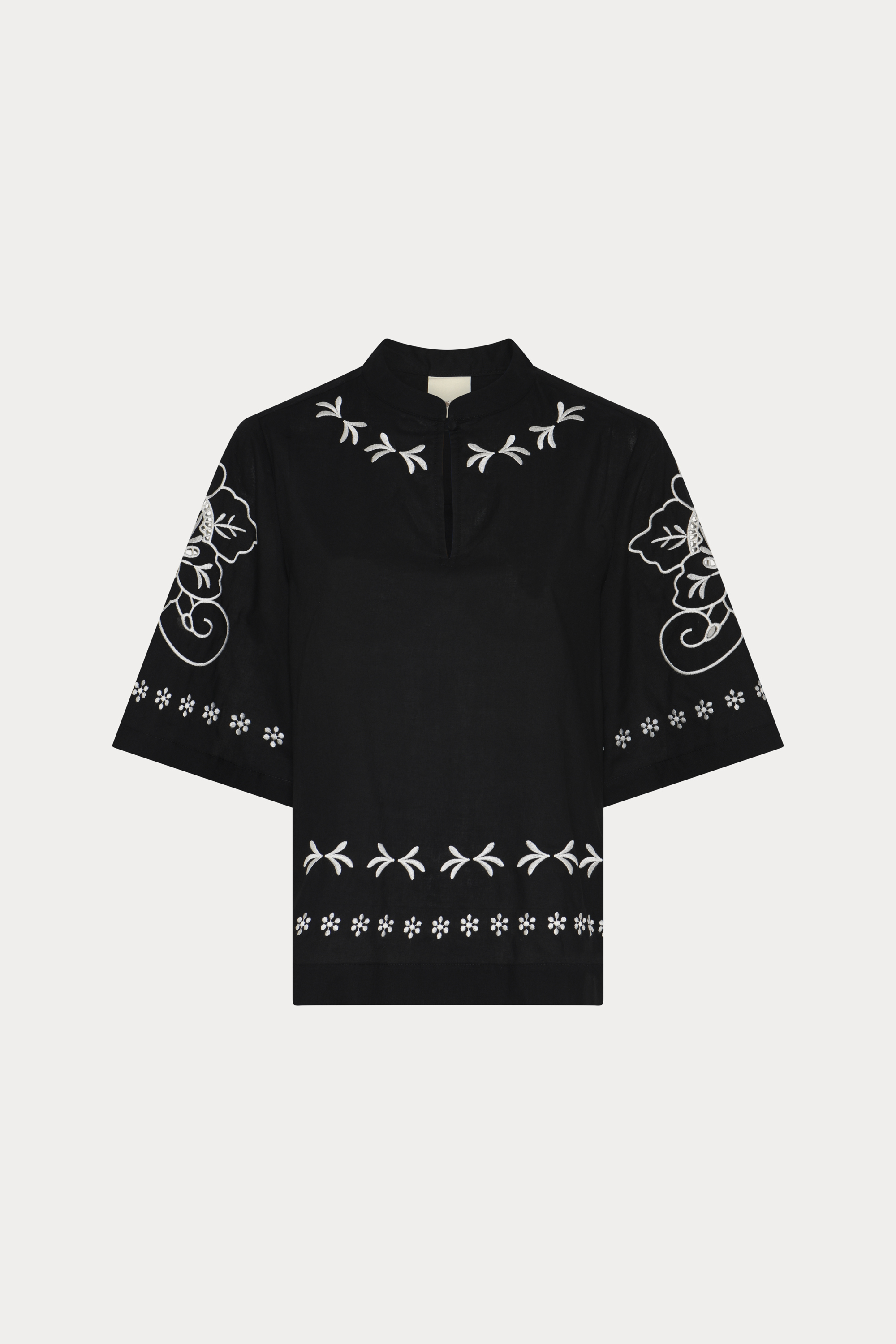Style blusen med enkle bukser for at lade broderierne træde tydeligt frem, eller bær den som et koordineret sæt med den matchende kjole for et harmonisk og helstøbt silhuetudtryk. En elegant og alsidig bluse, der løfter både hverdags- og occasion-garderoben.