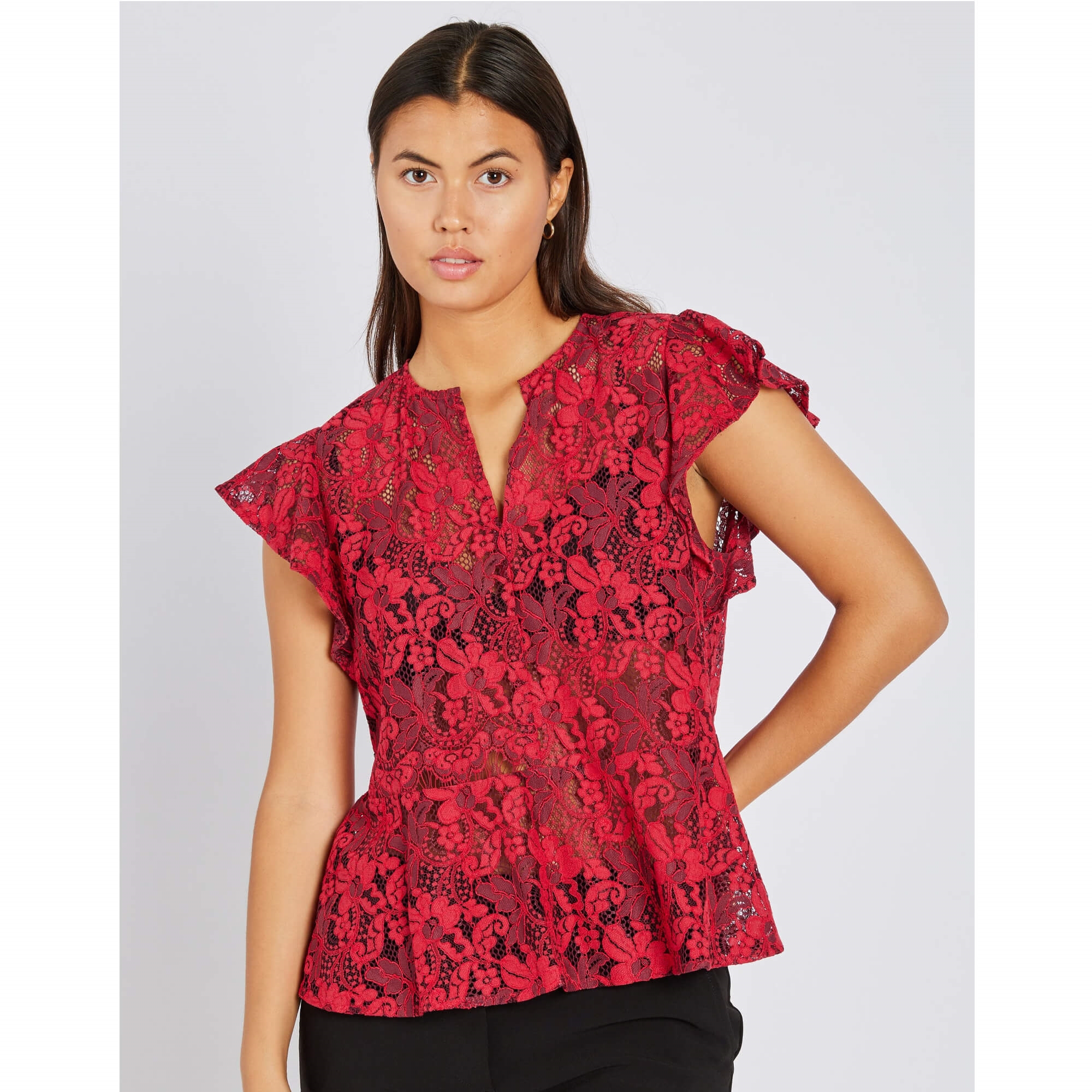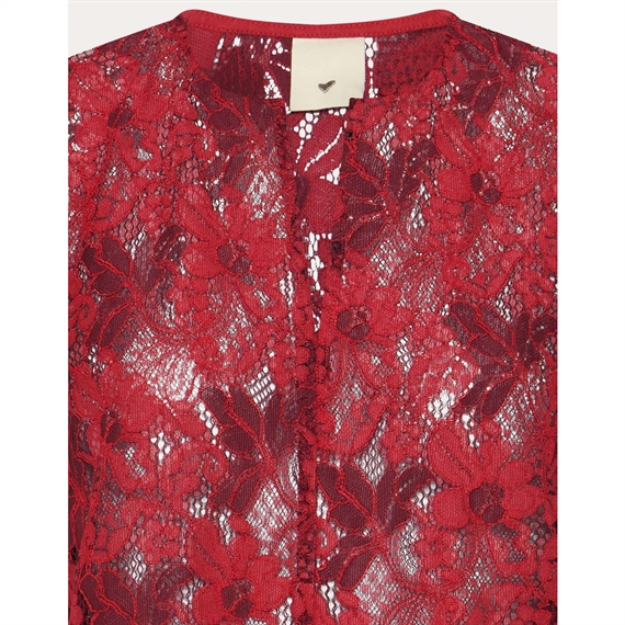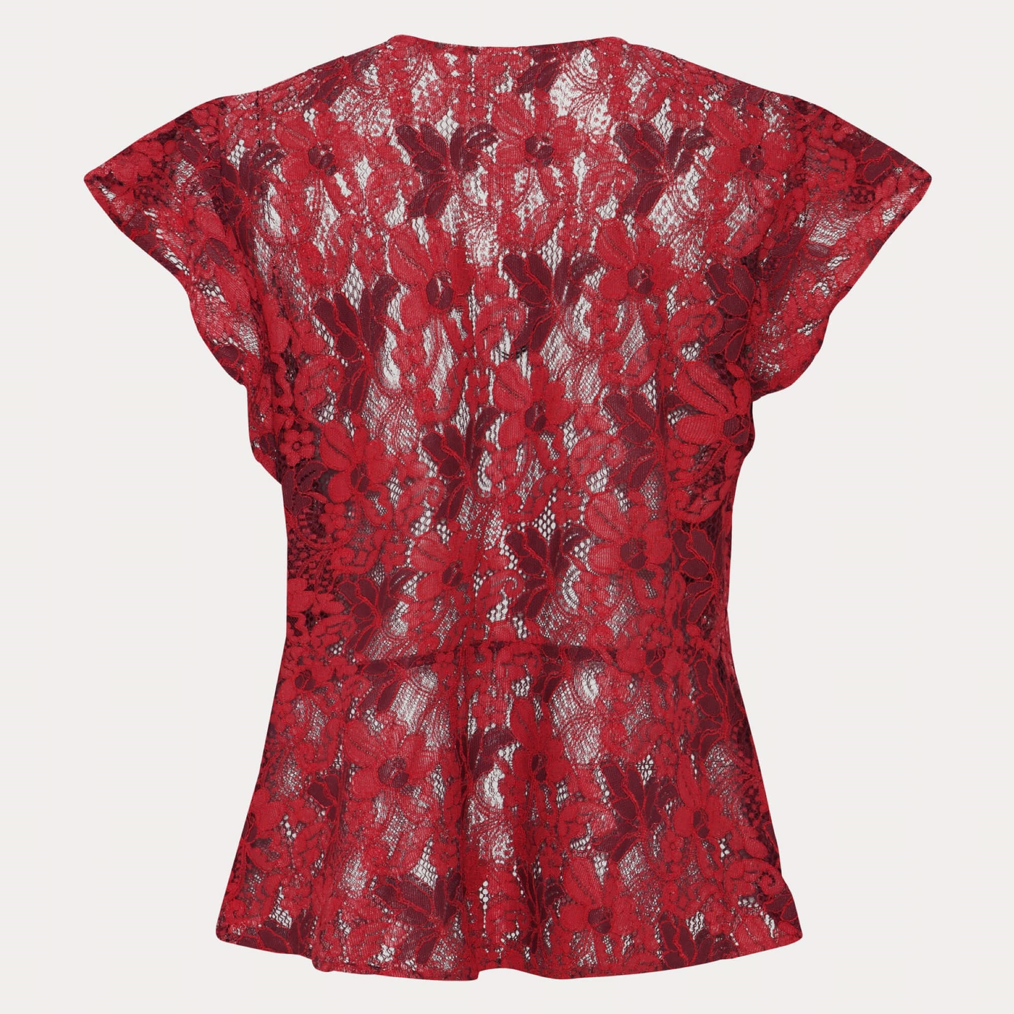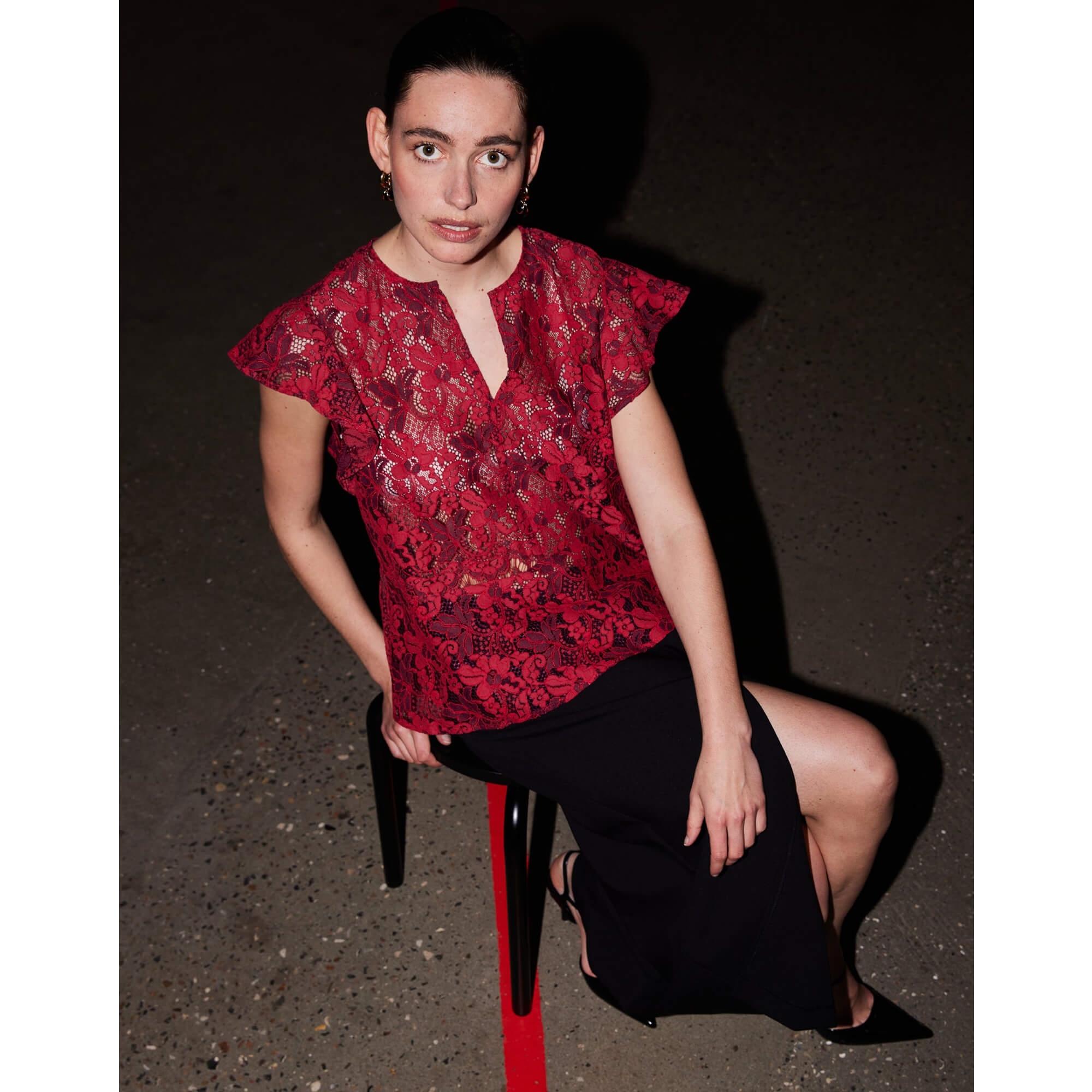 Den smukke HMTuea top er en feminin blondetop i dyb rød med V-udskæring, korte flæseærmer og en let taljeret pasform. Den gennembrudte blonde fremhæver farvens intensitet og skaber et markant, elegant udtryk. Style den med sorte bukser og hæle for en smuk kontrast, eller bær den under en enkel blazer for et sofistikeret og balanceret look.