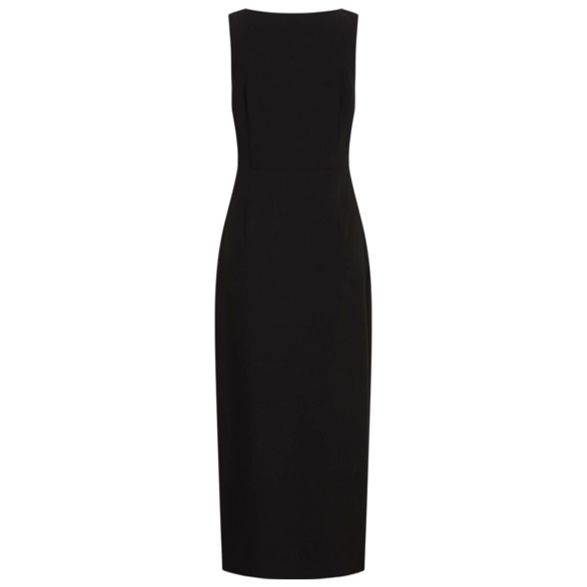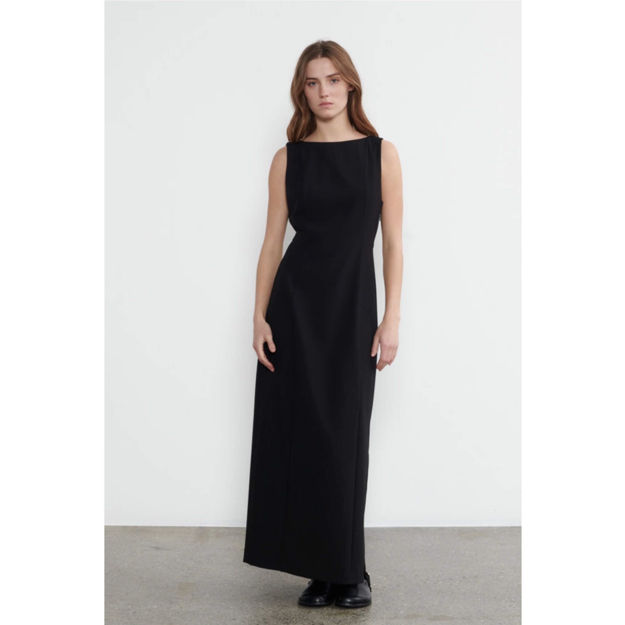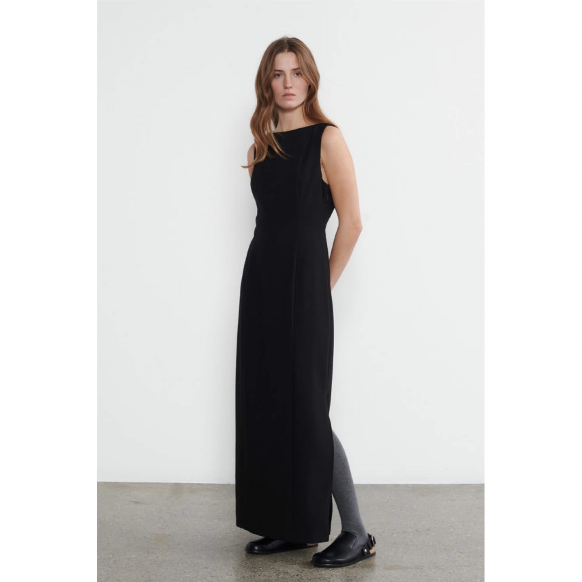 Vadana kjolen er en elegant, taljeret kjole, der fremhæver figuren med sin lange, strømlinede silhuet.
