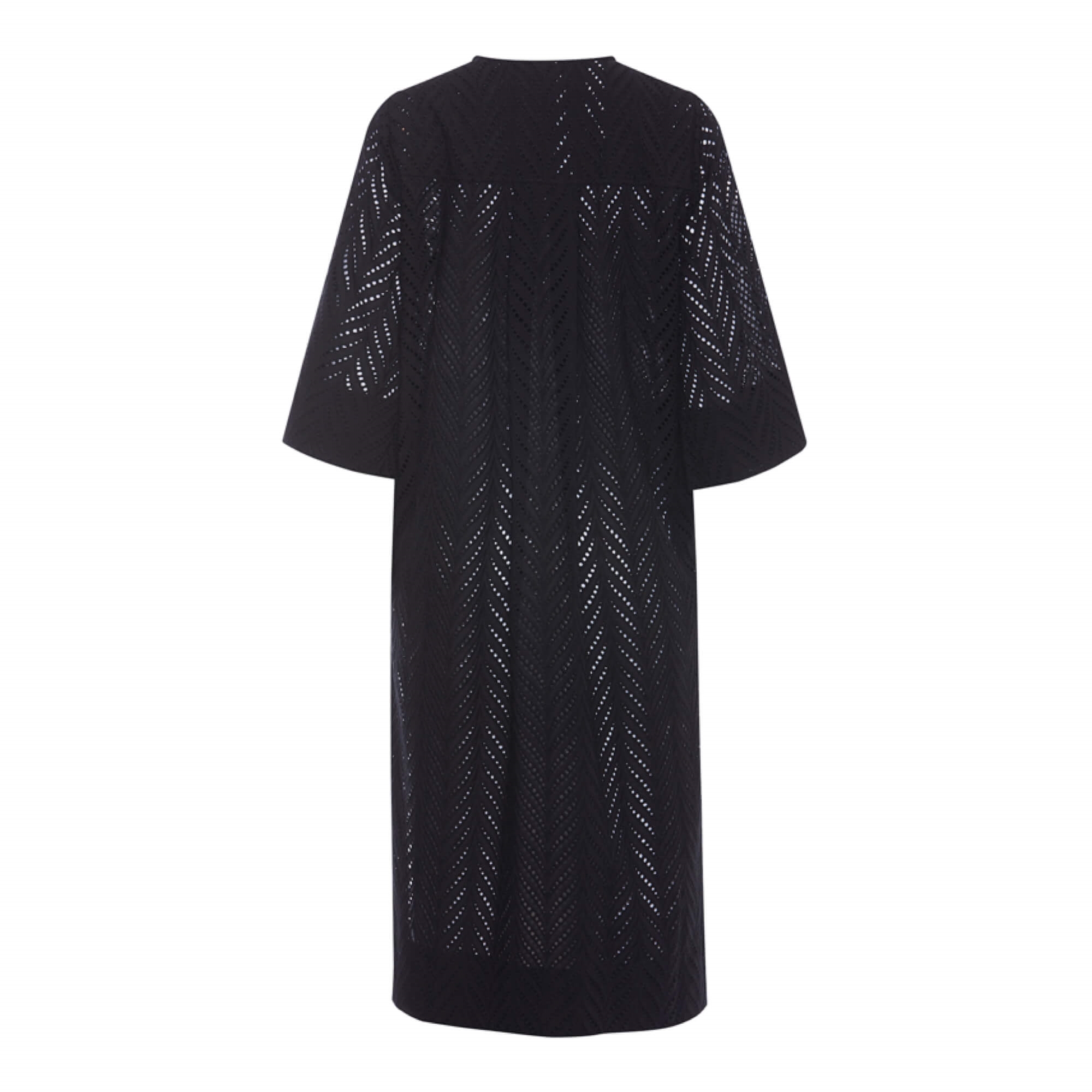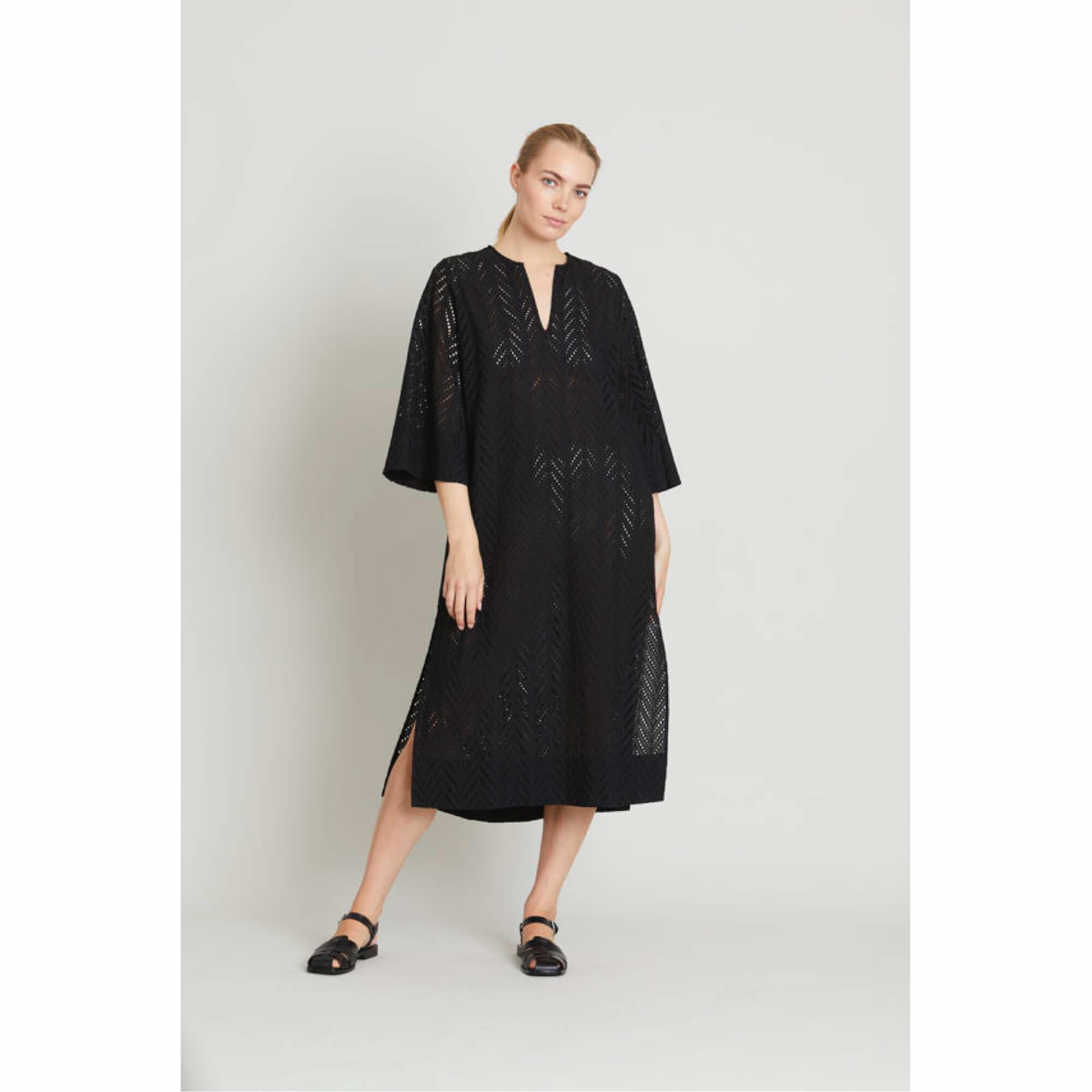 VALLY kjolen er en løstsiddende kjole i en unik stofkvalitet, der giver et karakteristisk udtryk. Kjolen har en rundet halsudskæring med et V-snit, der tilføjer et subtilt og feminint touch til designet.