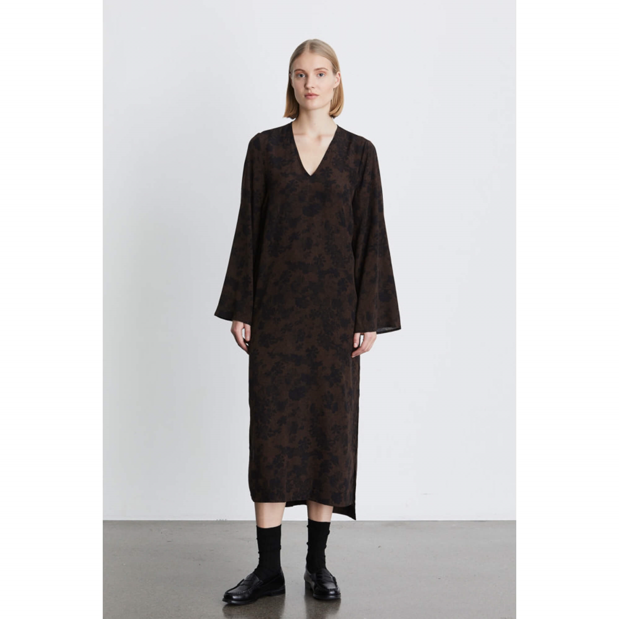 Vasila kjolen er en løs, figursyet kjole med brede og løse flagermusærmer, der giver et dramatisk og elegant udtryk. Slidseffekten ved kroppen tilføjer et moderne touch, mens kjolen er let krøllet for ekstra tekstur og karakter.