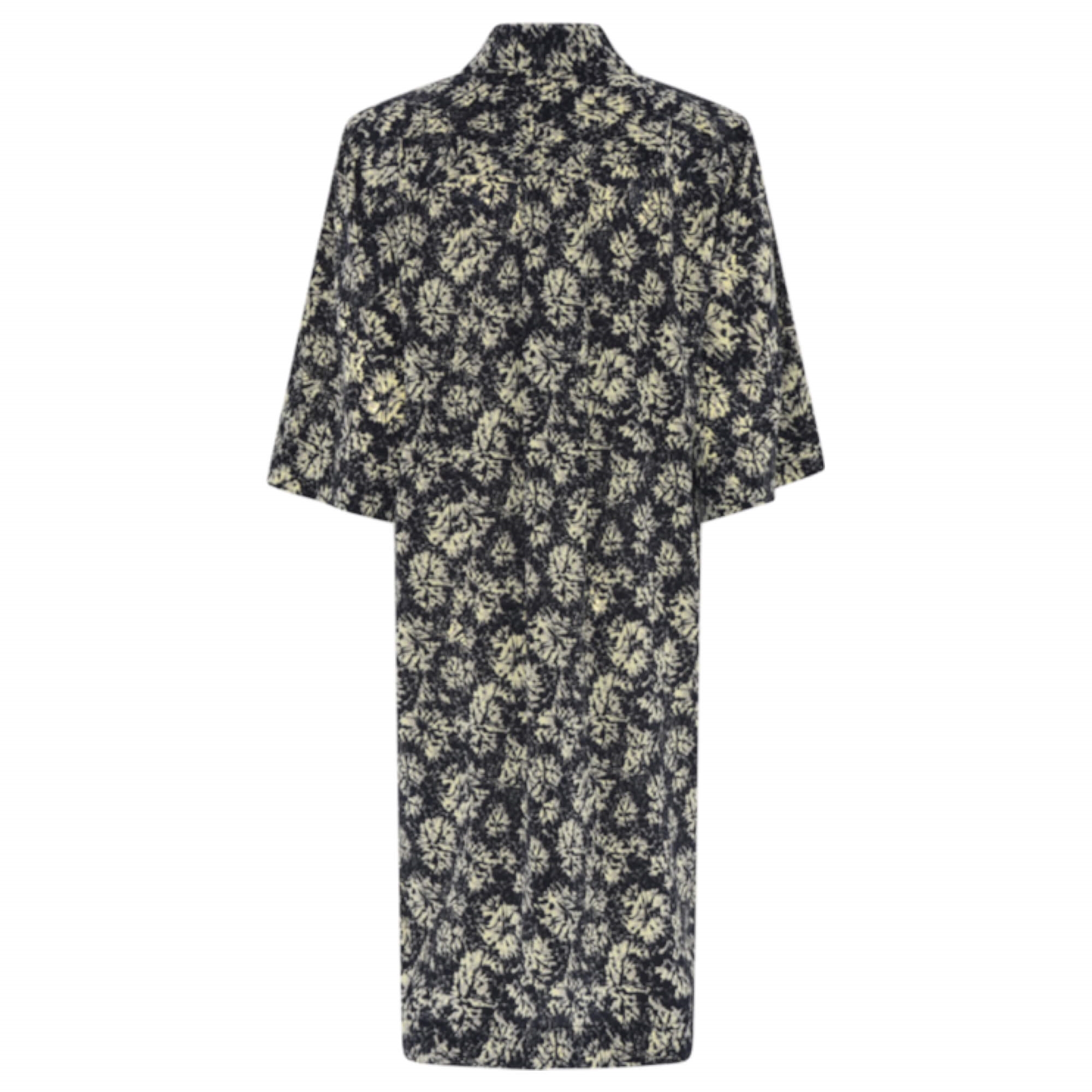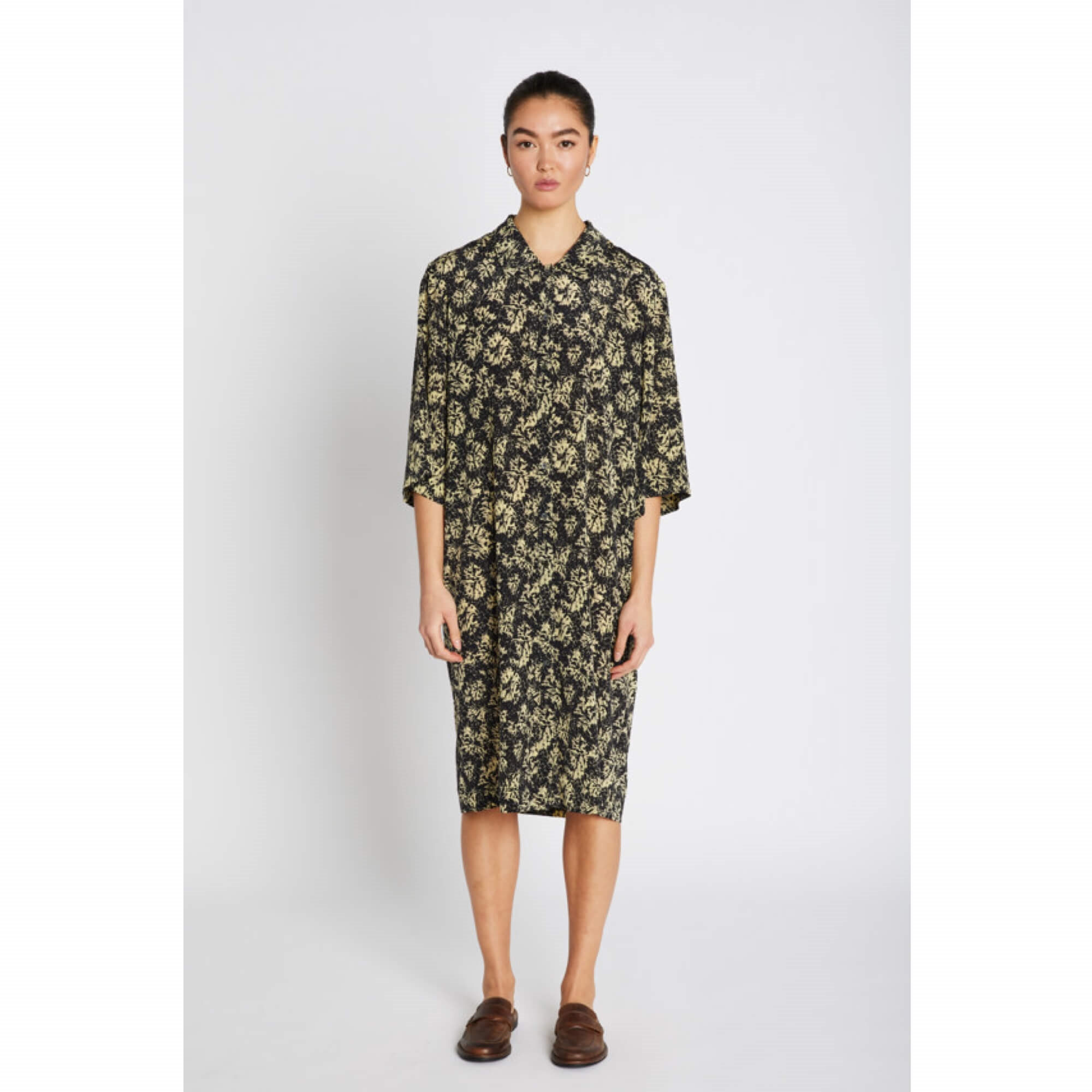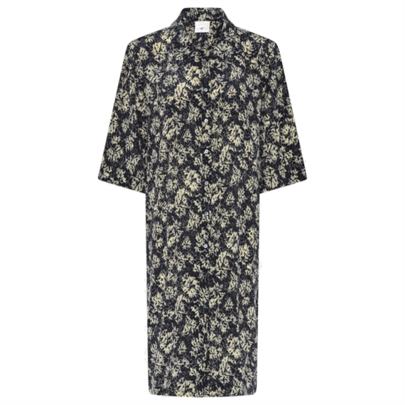 Vatura kjolen er en skjortekjole med en løs, lige pasform, der kombinerer komfort og elegance. De brede ærmer og den klassiske skjortekrave tilføjer et tidløst udtryk, mens den dybe halsudskæring foran skaber et moderne og sofistikeret look.