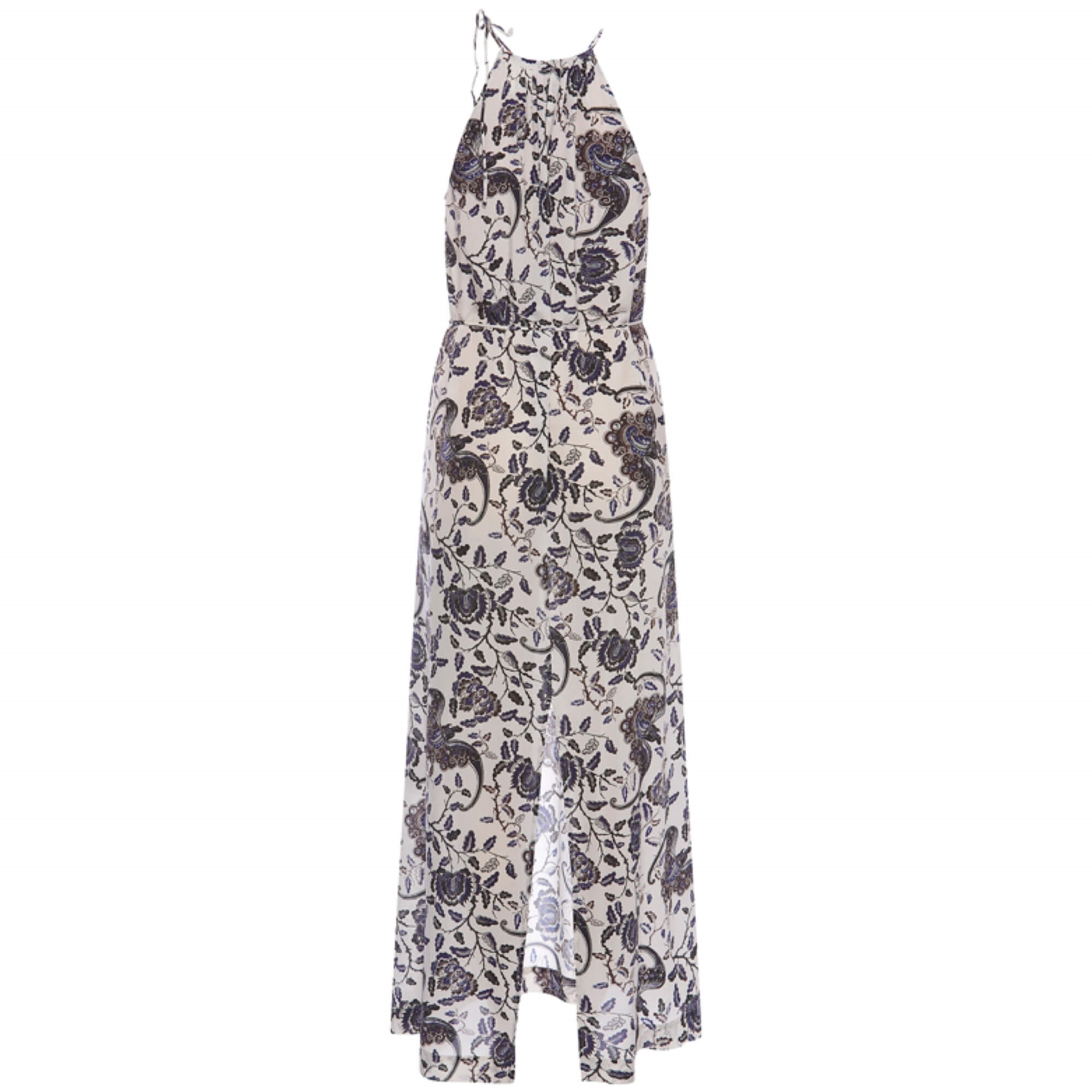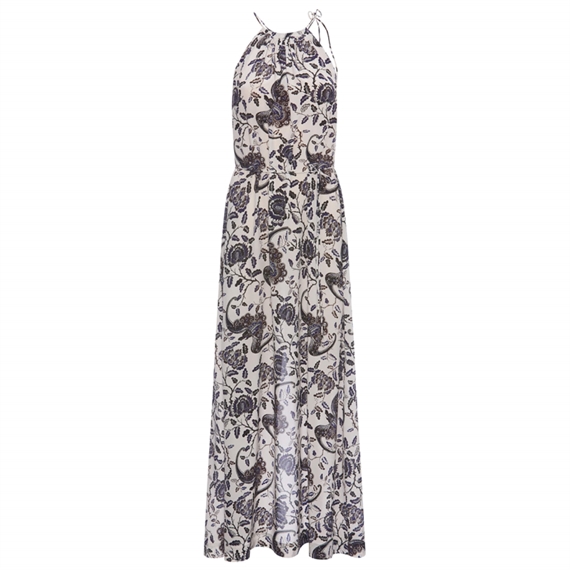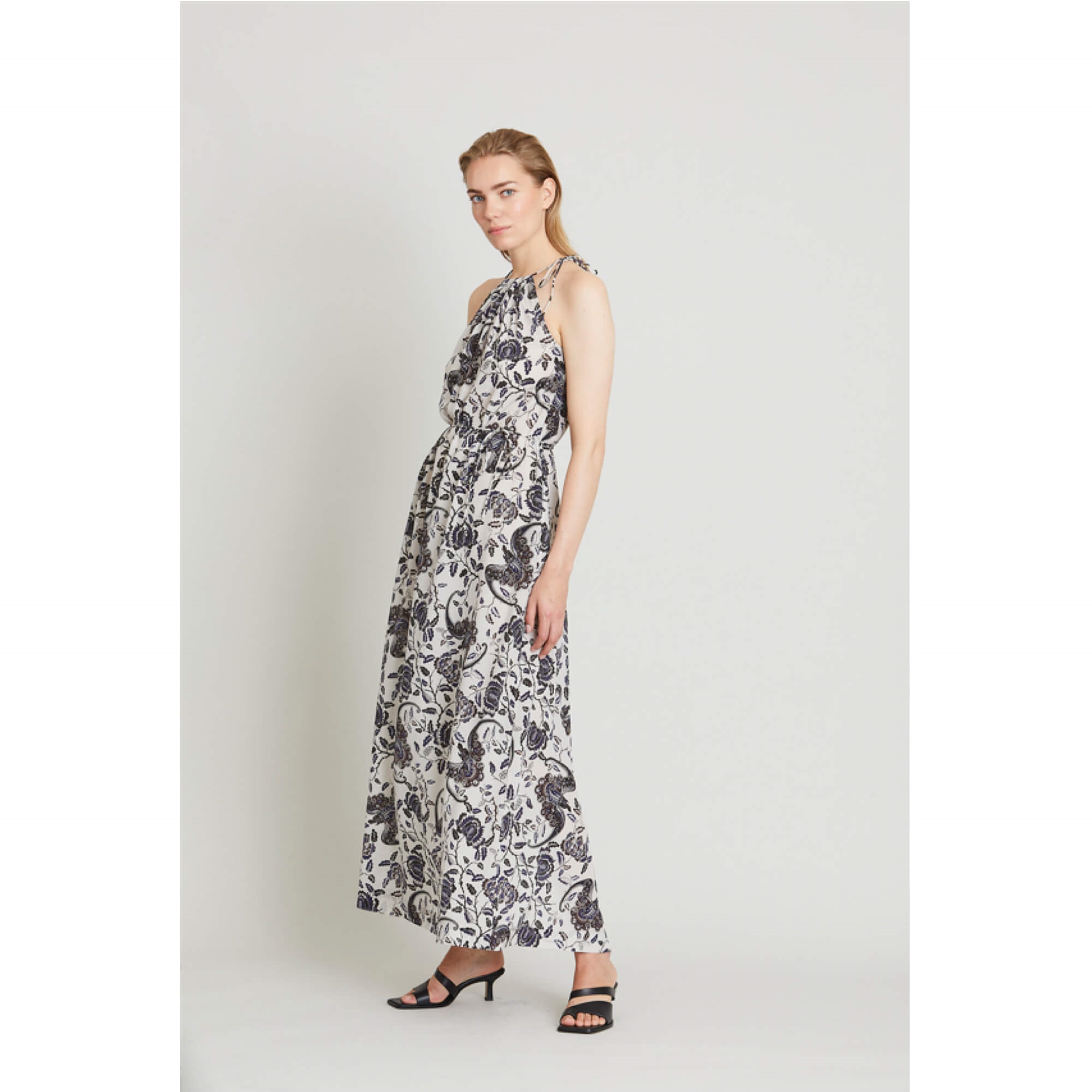 VINNI kjolen er en lang, løstsiddende halterneck kjole, der kombinerer elegance med komfort. Den har fine binde snor-detaljer, der tilføjer et subtilt og feminint touch til designet, samt en slidse foran, der giver bevægelsesfrihed og et dynamisk udtryk.
