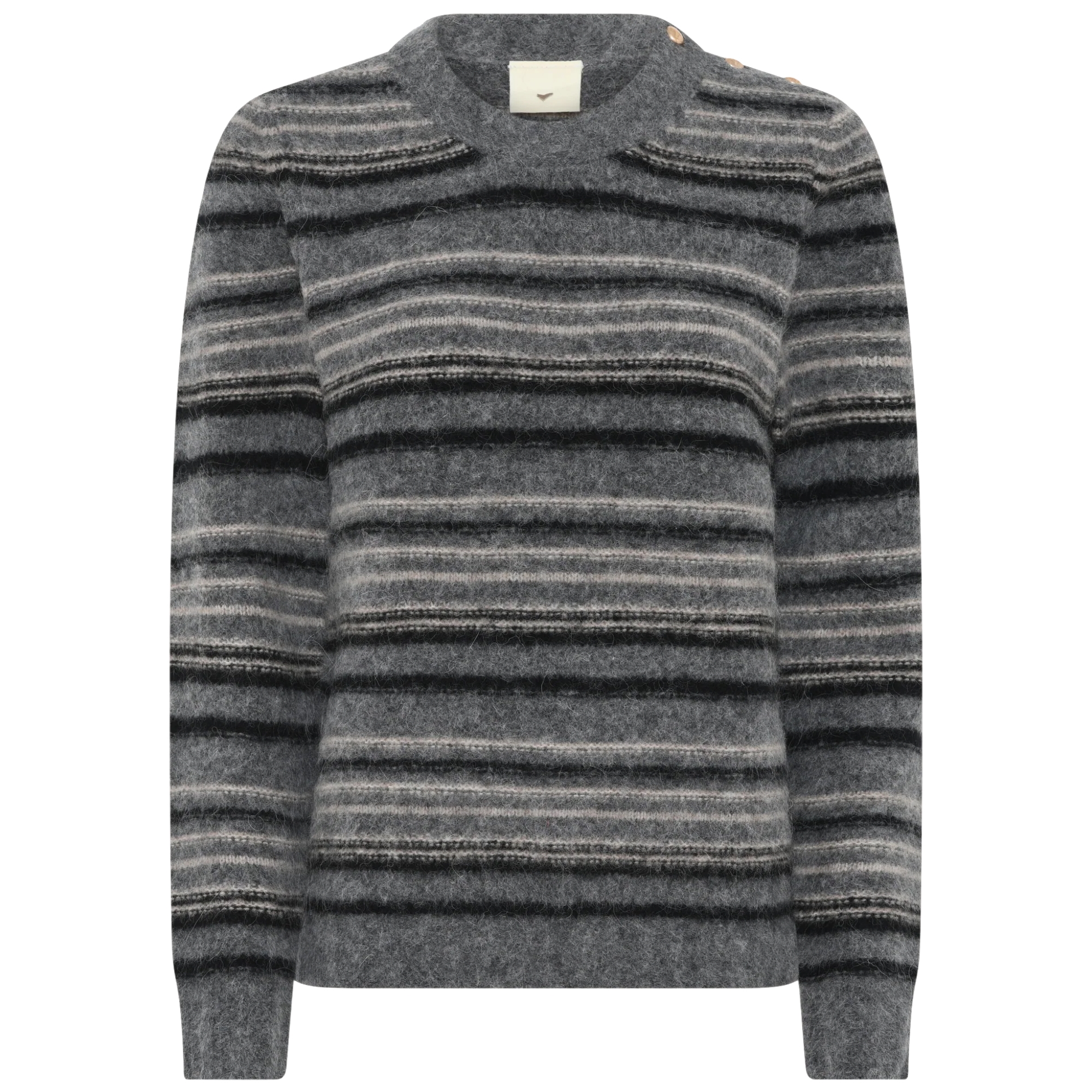 Lækker, blød og tidløs - Kinea strikken fra Heartmade er indbegrebet af luksuriøs hverdagskomfort. Strikken er designet i en smuk gråmeleret base med elegante striber i kontrastnuancer, der giver et moderne og sofistikeret udtryk. De fine knapdetaljer på skulderen tilfører et eksklusivt twist, som gør strikken ekstra særlig.