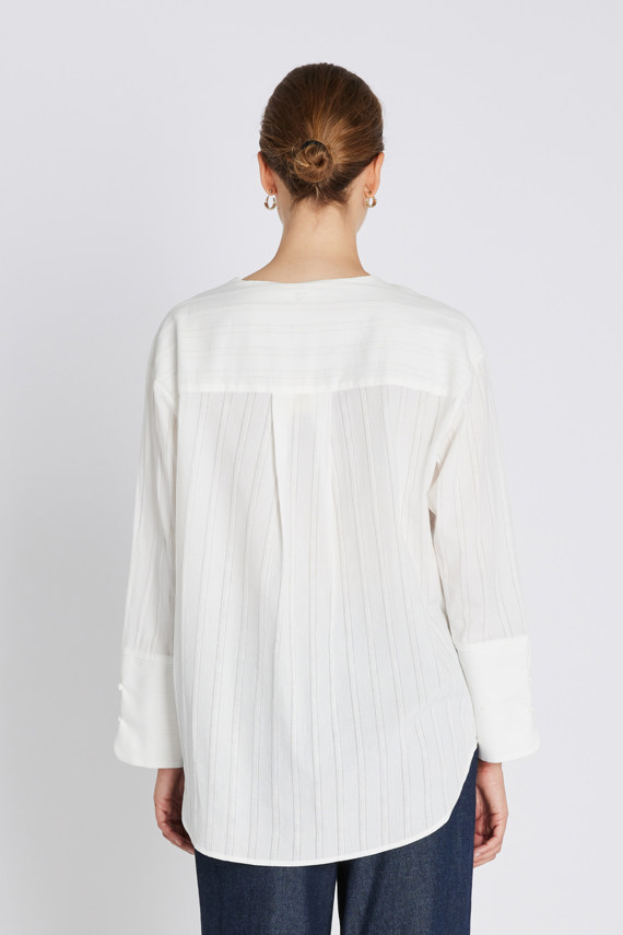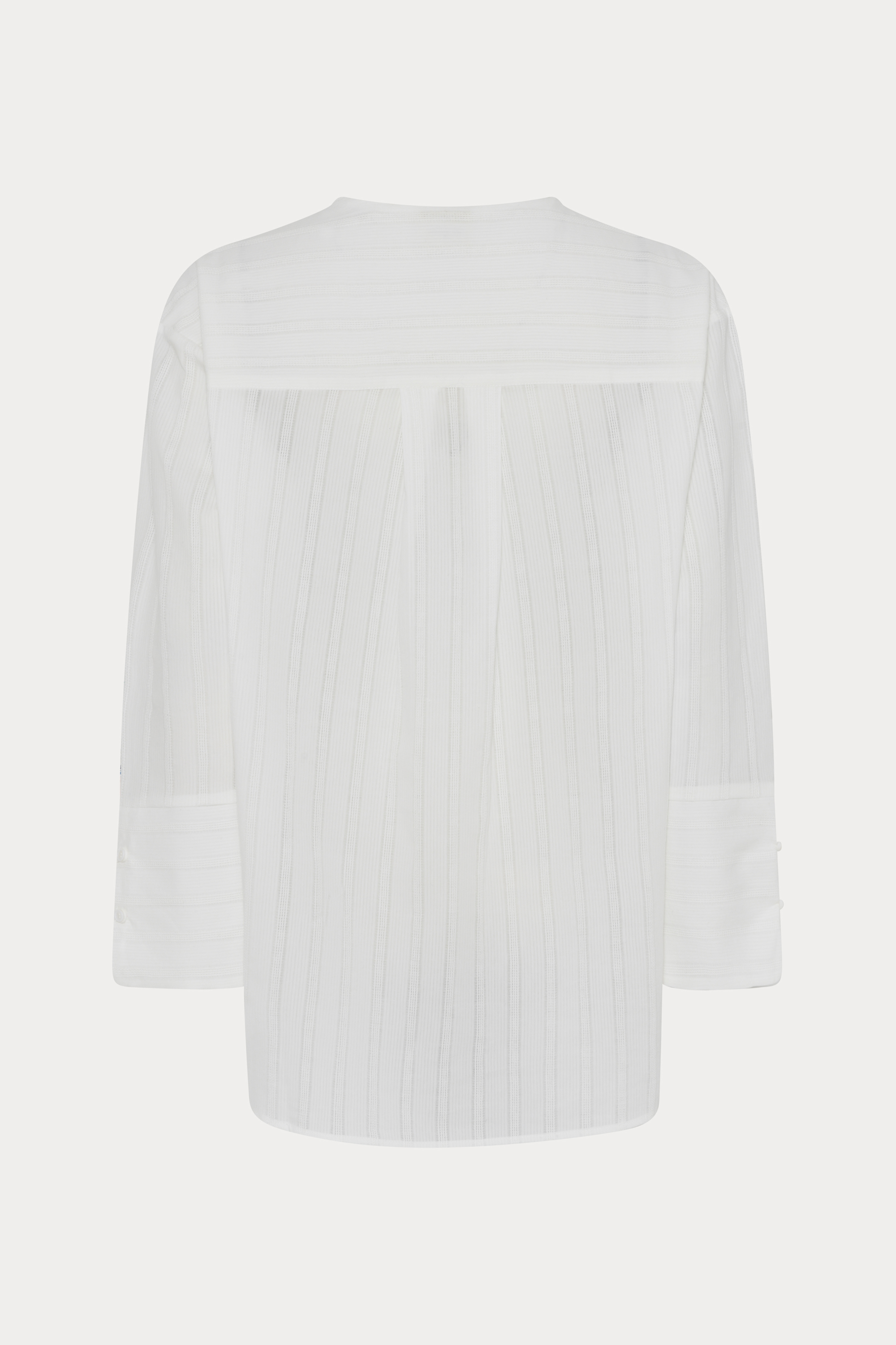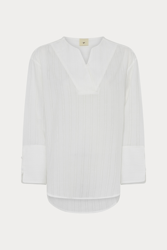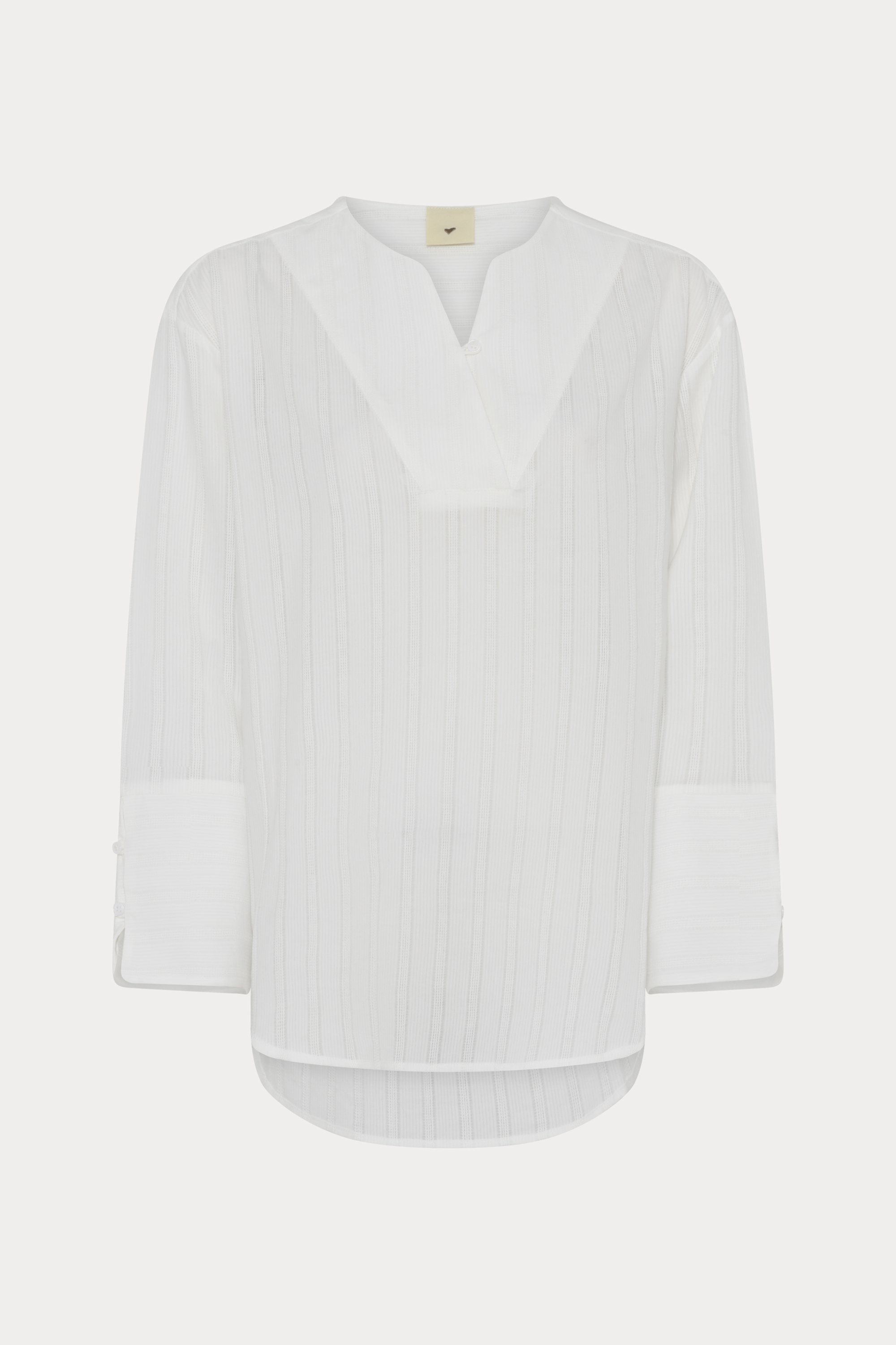 Opgrader din garderobe med denne elegante Metan skjorte fra Heartmade. Skjorten er designet i en let og eksklusiv kvalitet med fine, diskrete striber, der giver et sofistikeret udtryk. Den har en flatterende V-udskæring, lange ærmer med brede manchetter og et løst fald, som giver et feminint og tidløst look. Metan skjorten er en klassiker, du kan bruge sæson efter sæson - perfekt til både kontoret og til mere afslappede lejligheder. Style den med jeans for et chic hverdagsoutfit eller med elegante bukser og hæle til festlige anledninger.
