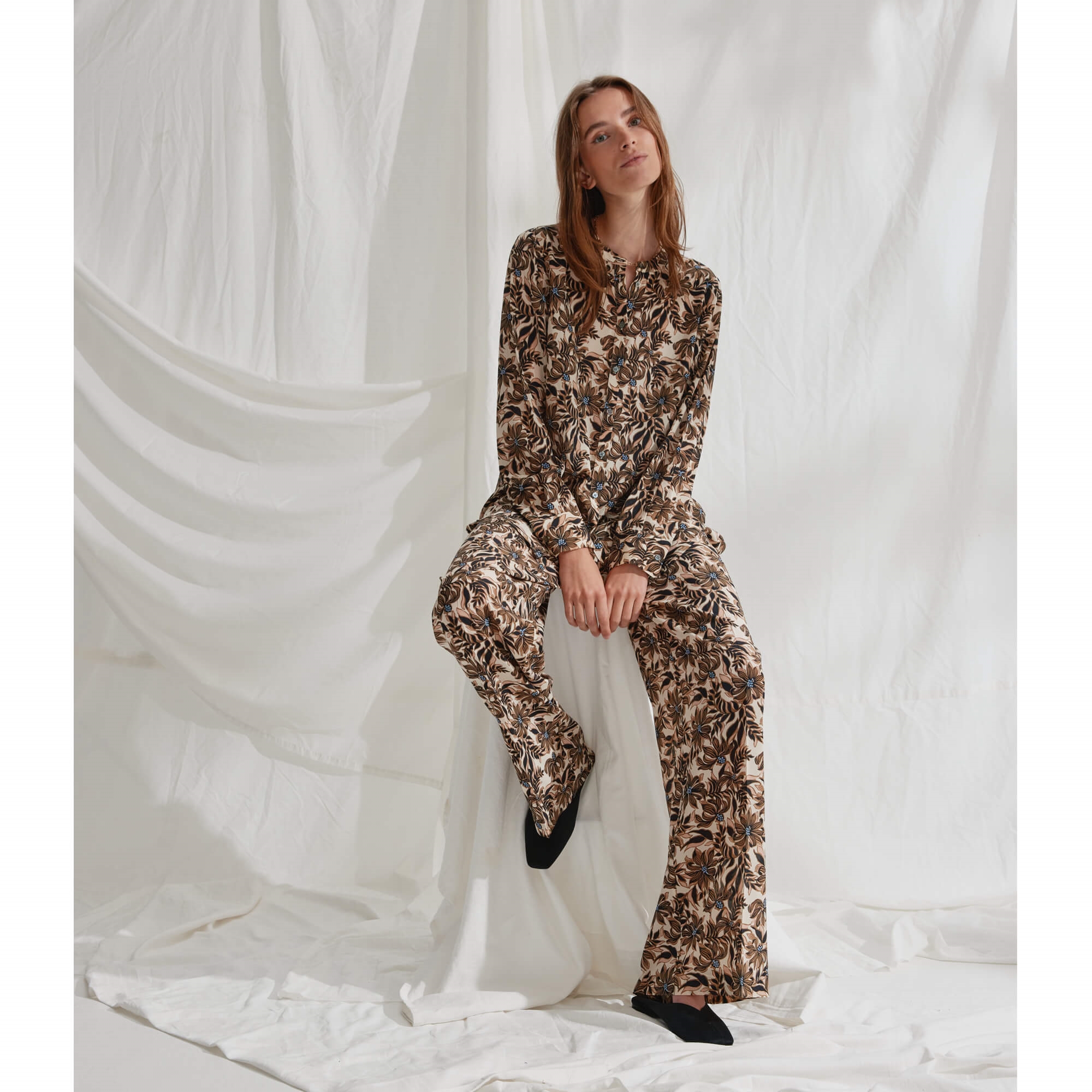 Noran bukserne kommer med brede ben og elastik i taljen samt et let, flydende fald, der fremhæver det smukke print og skaber en rolig, afrundet silhuet. Style dem med den matchende Maple skjorte for et sammenhængende og harmonisk sæt, eller kombiner dem med en enkel mørk top for at lade printet stå i fokus. De fungerer også smukt sammen med en afslappet blazer for et mere cool udtryk.