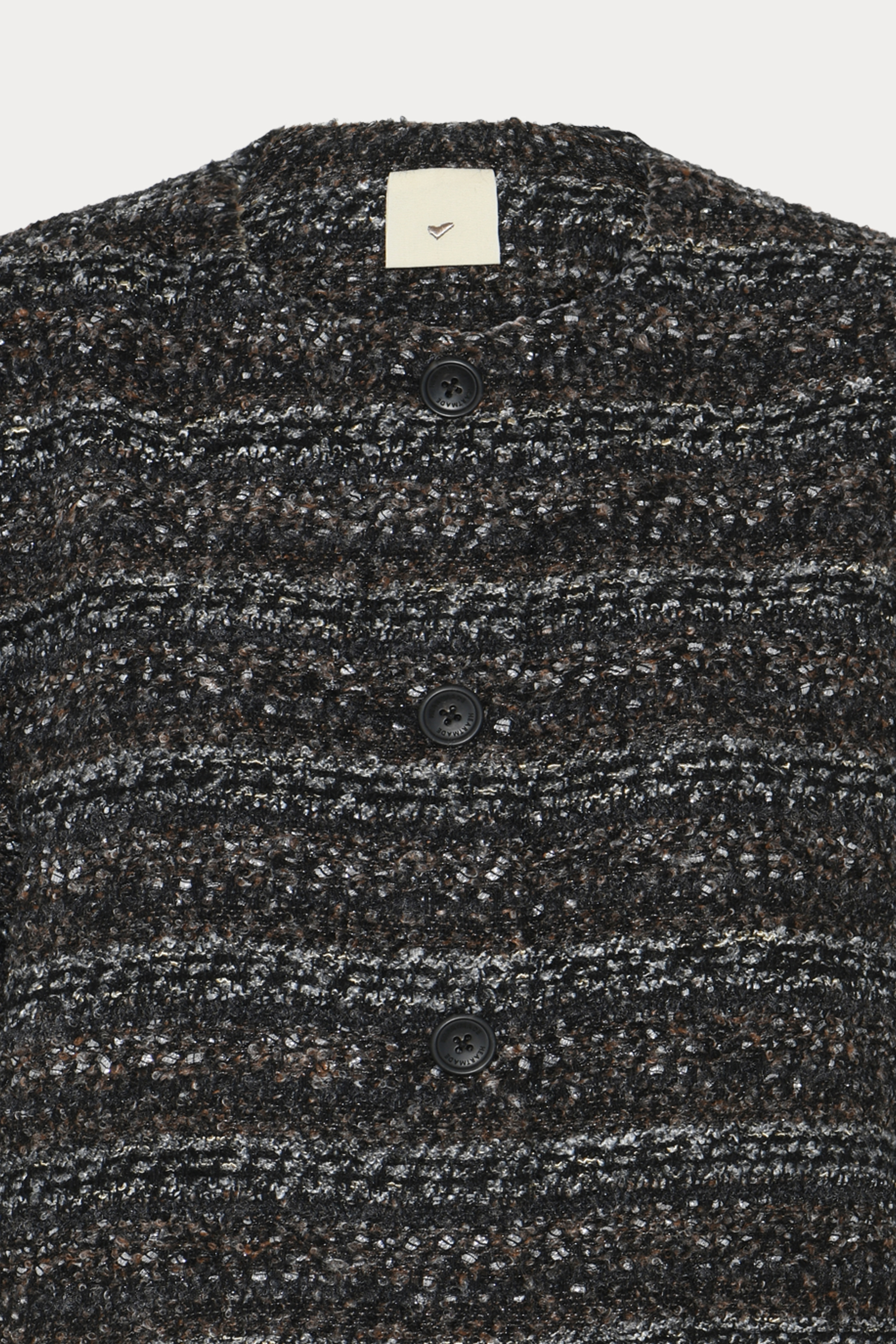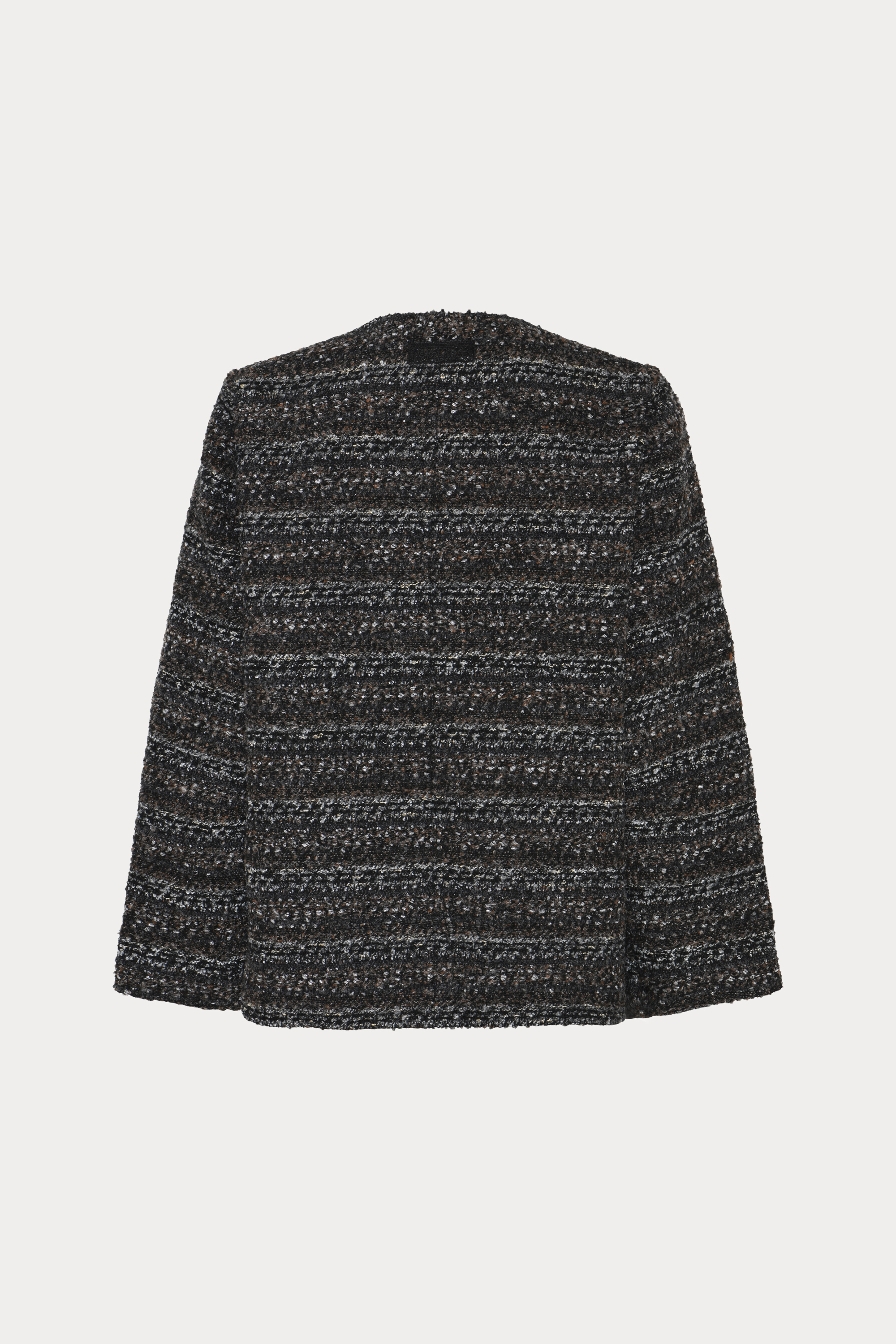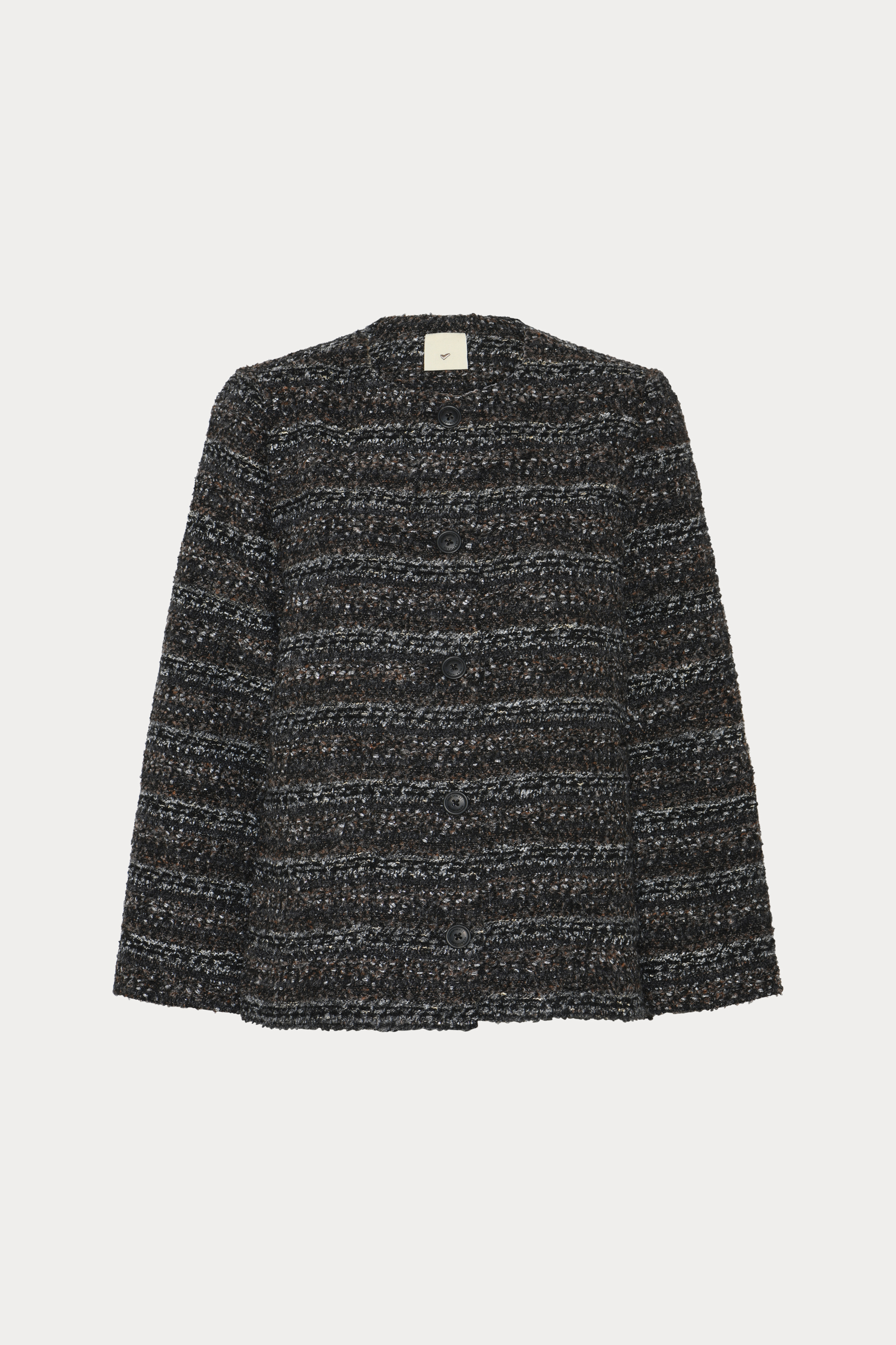 regular fit og en ren silhuet, løftet af den karakteristiske bouclé-overflade, der tilføjer dybde og dimension. Den runde halsudskæring og enkle frontlukning med knapper giver et minimalistisk udtryk, der gør jakken nem at style til både hverdags- og festgarderoben.