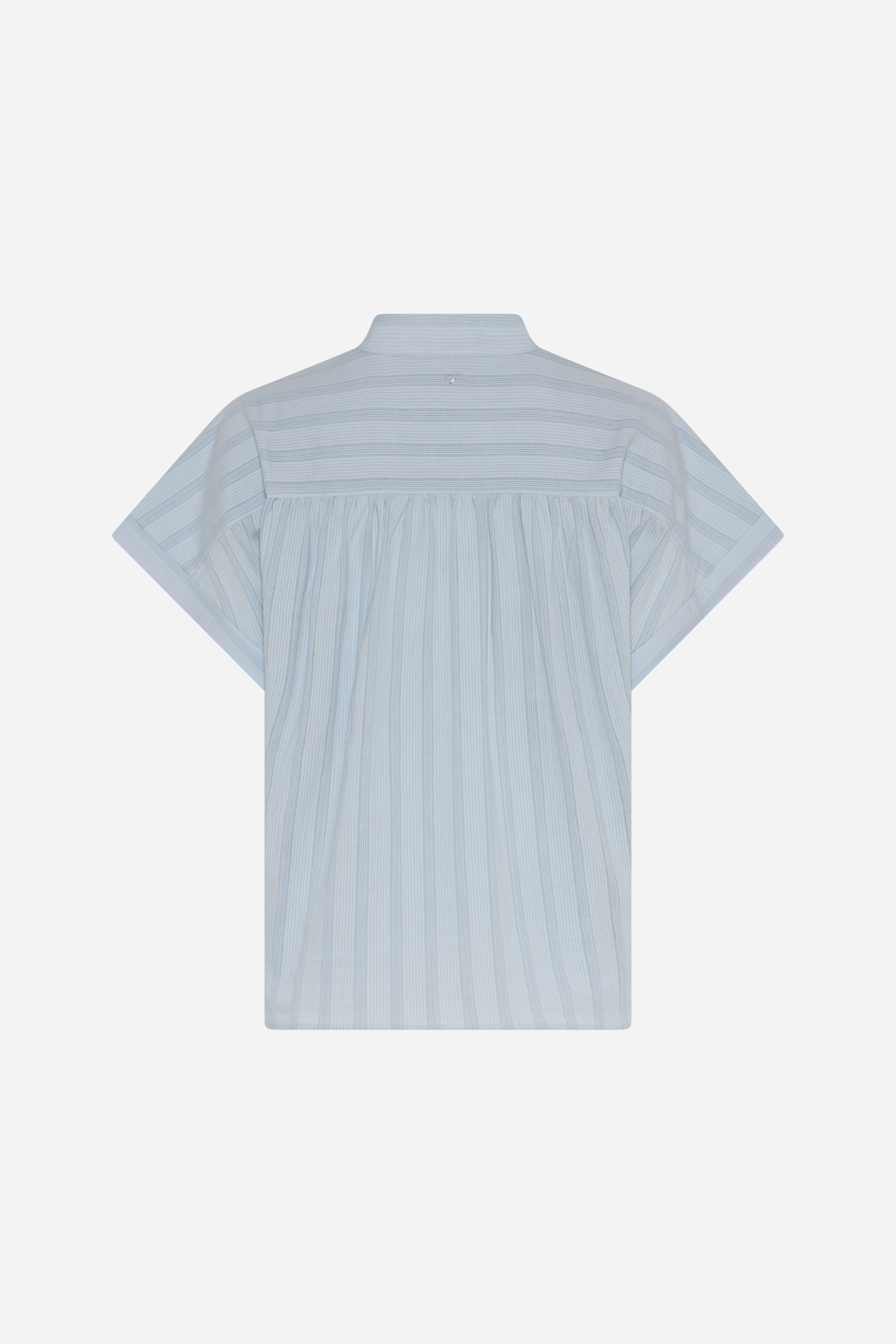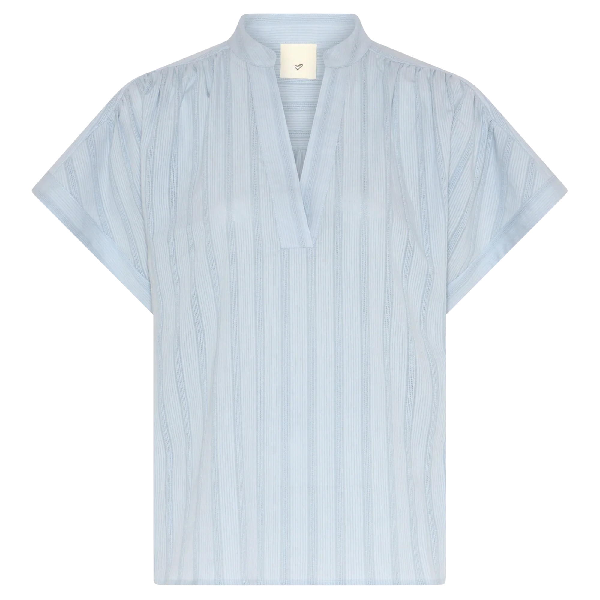 441HMTavis fra Heartmade er en let, kortærmet bluse med dyb V-udskæring, brede ærmer og en afslappet silhuet, hvor de tonale striber fremhæver det rolige, luftige udtryk.