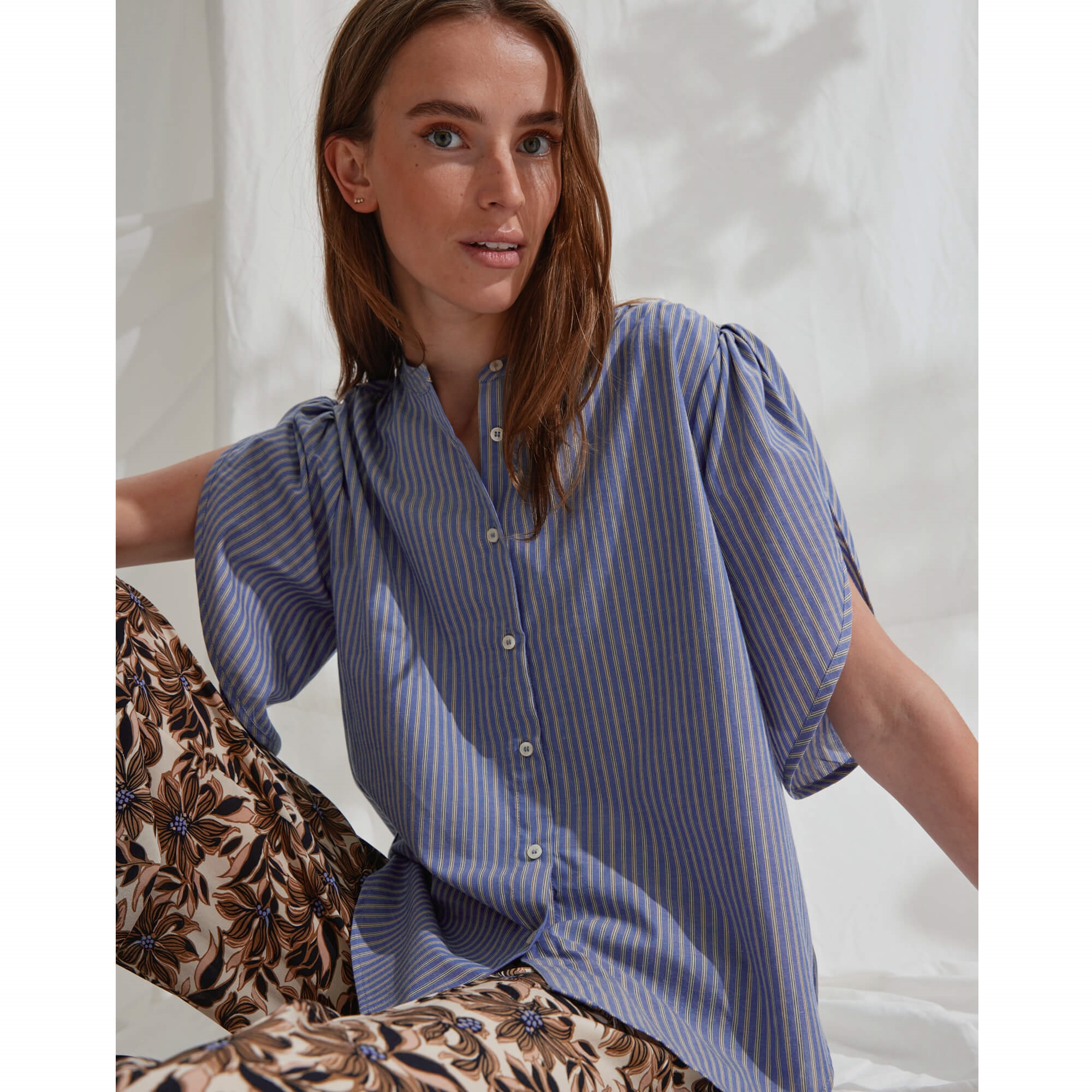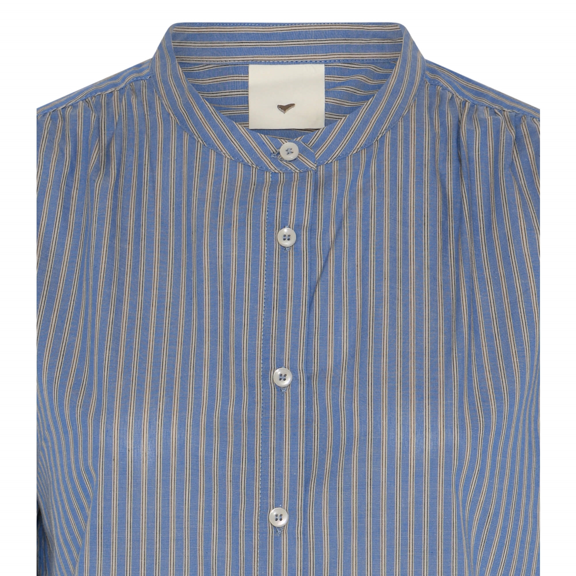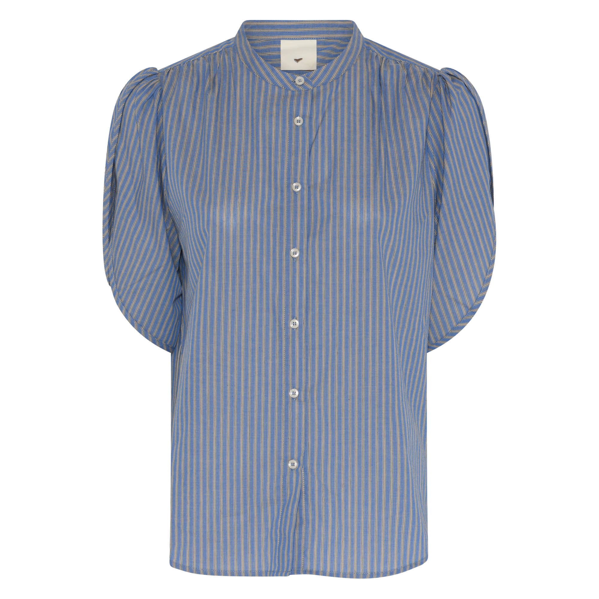 Tulin skjorten er en let bomuldsskjorte med rund hals, knaplukning og voluminøse ærmer med åbne slidser. De fine striber tilfører et frisk og feminint udtryk.