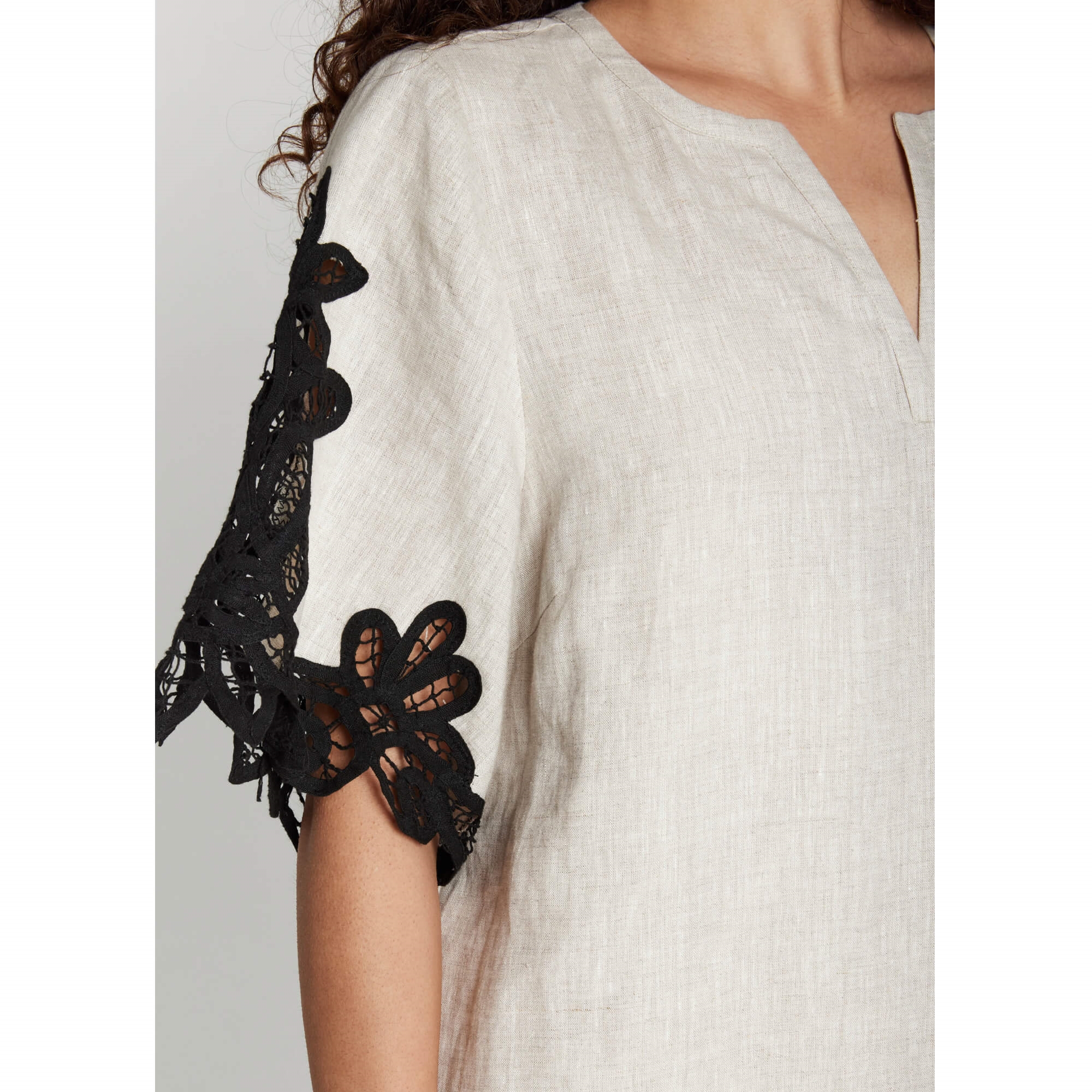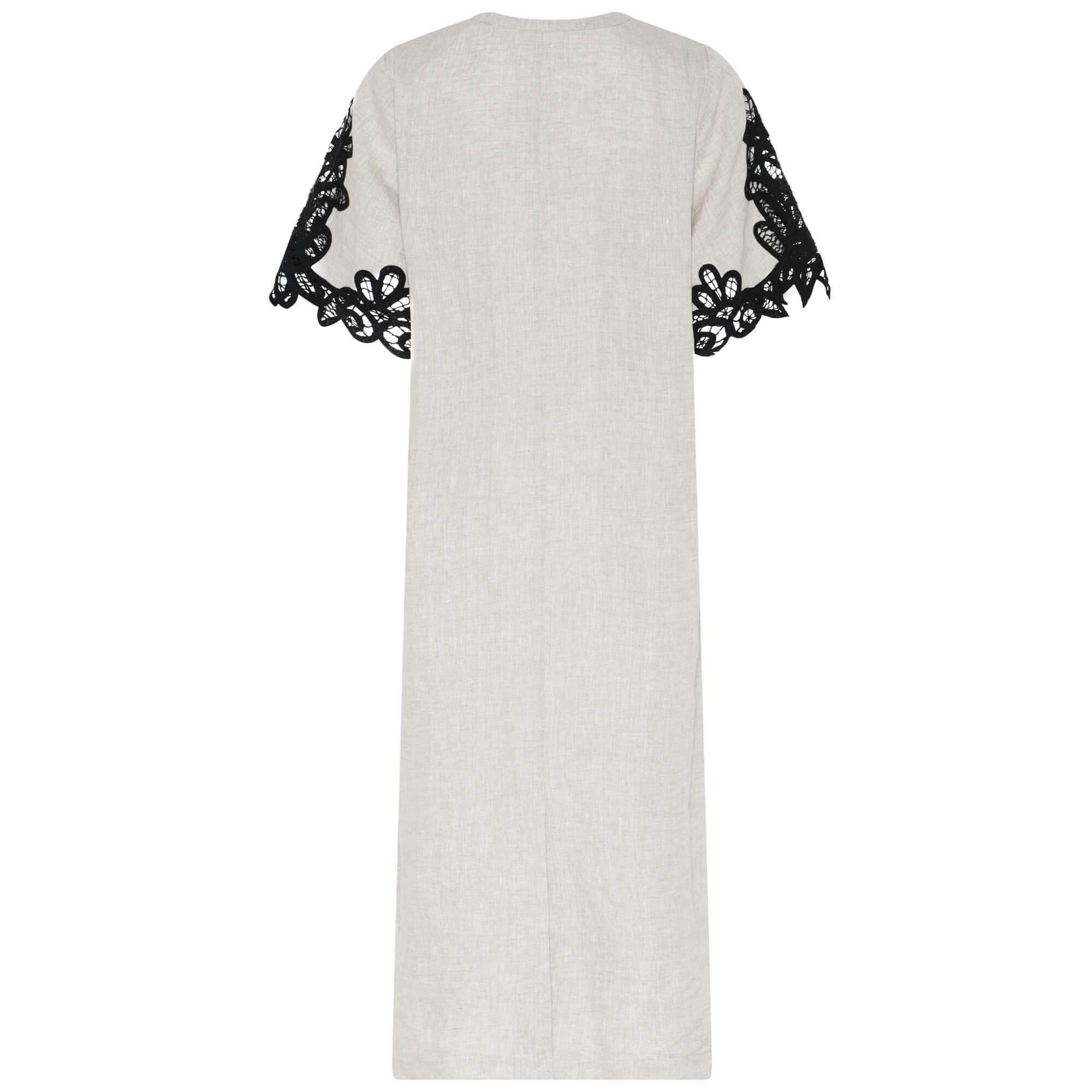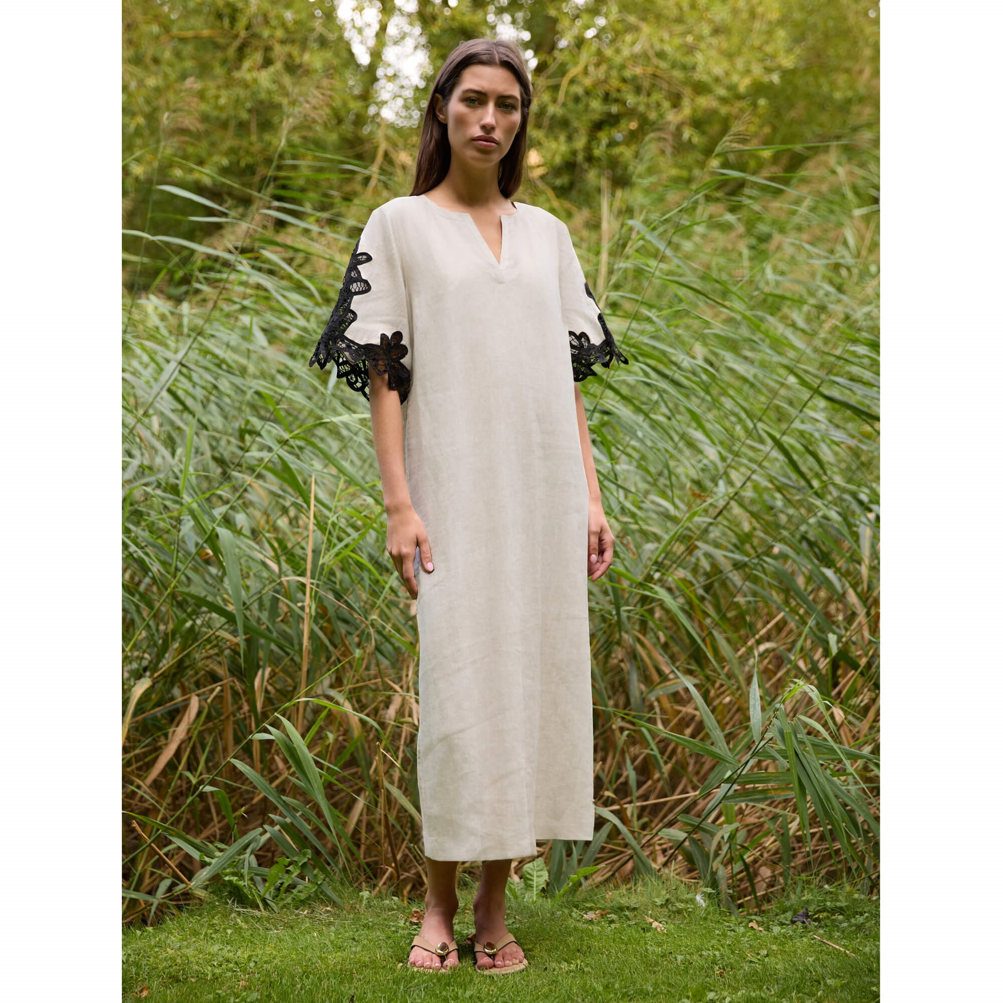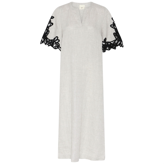 V-udskæringen og de korte ærmer med fine kontrastblonder giver kjolen et feminint og elegant touch uden at blive for meget.