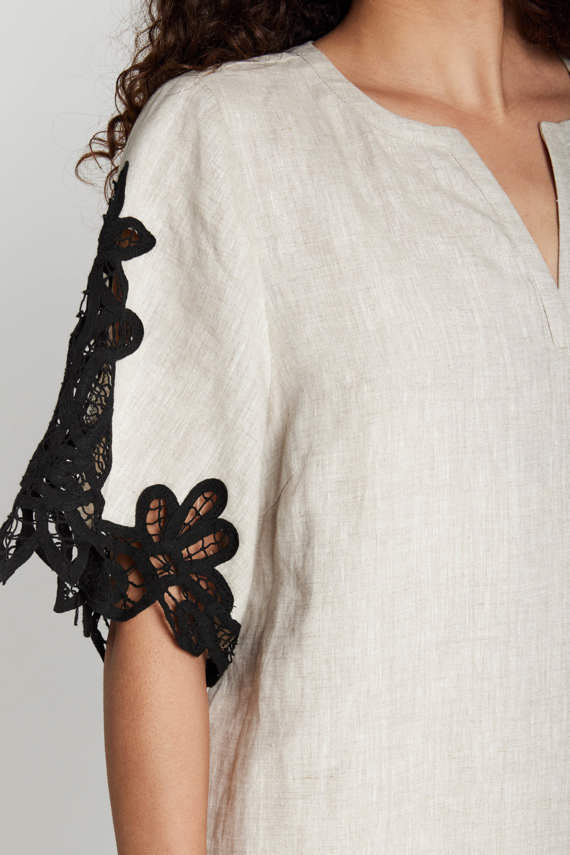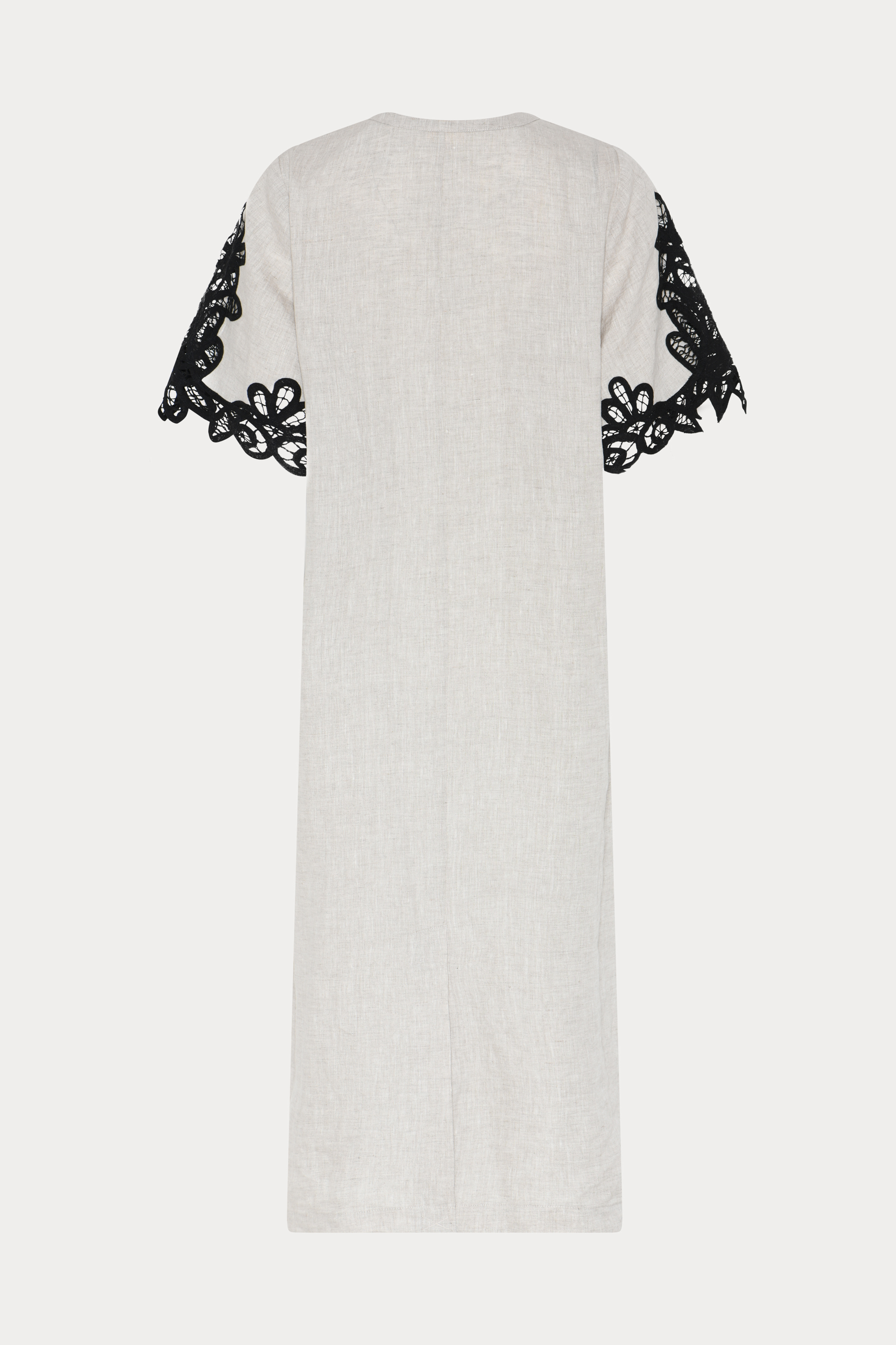 V-udskæringen og de korte ærmer med fine kontrastblonder giver kjolen et feminint og elegant touch uden at blive for meget.