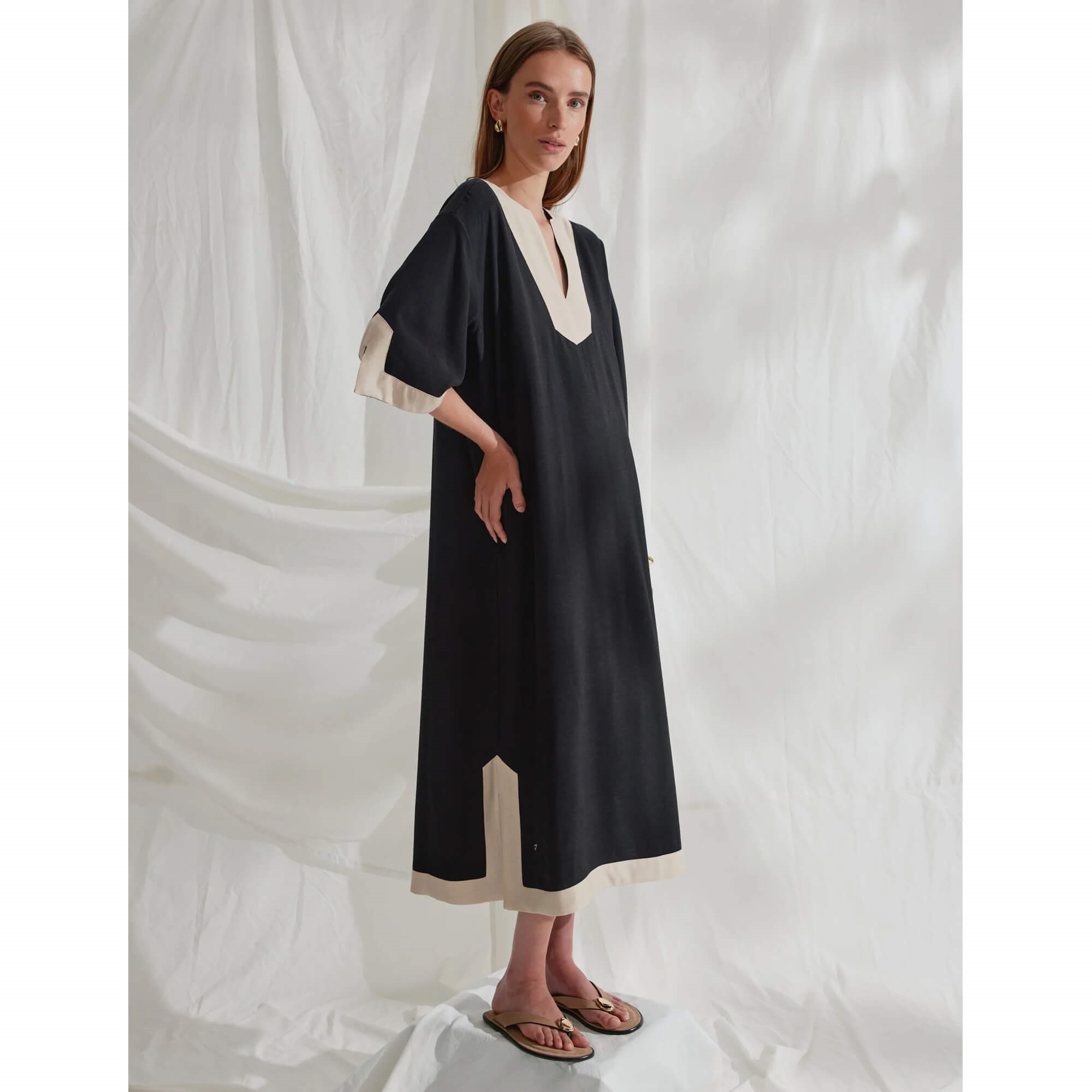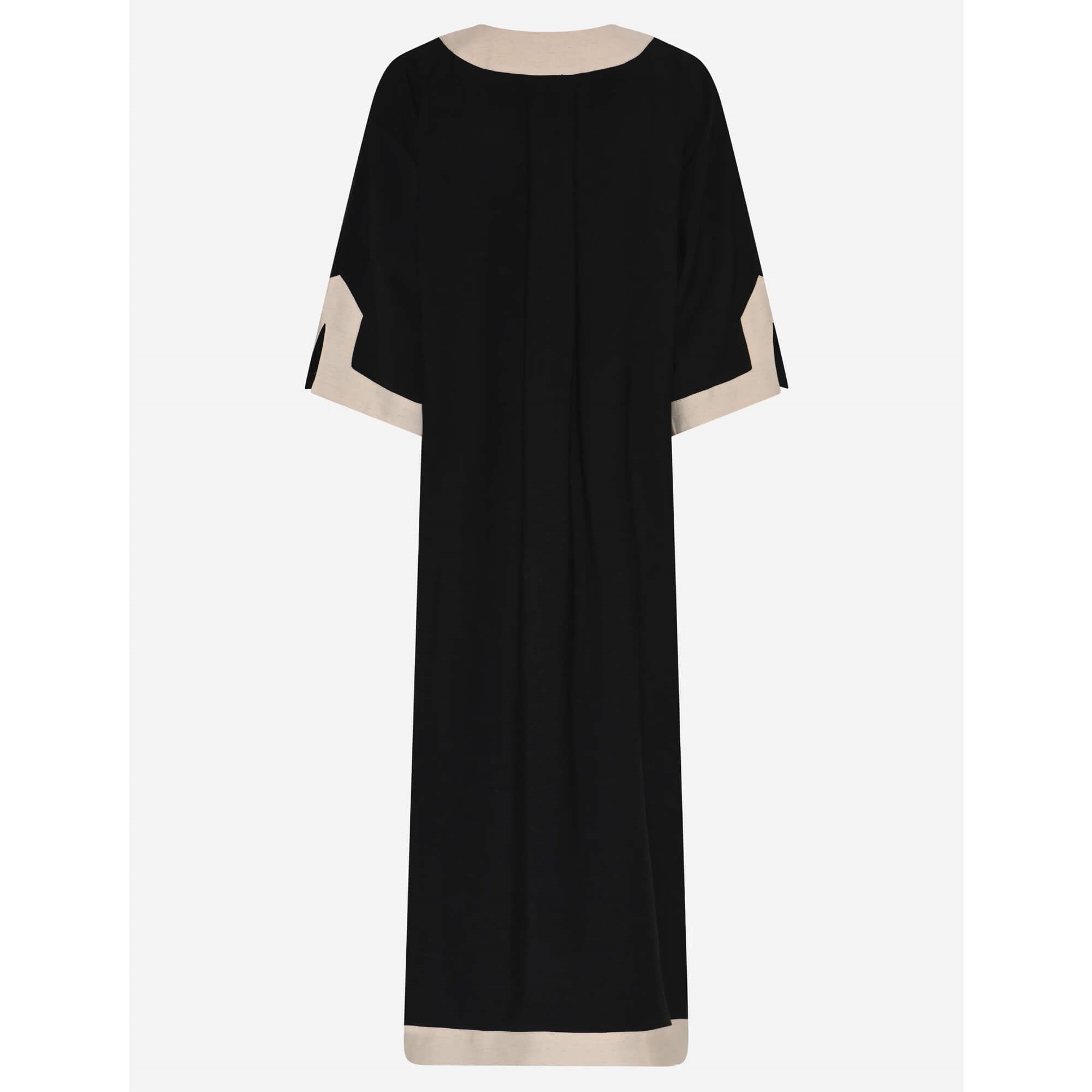 Vigdis kjole er en lang kjole med markante kontrastkanter og en dyb V-udskæring, der tilfører et grafisk og sofistikeret udtryk. Den løse, afrundede silhuet skaber en rolig og skulpturel form, mens de korte, brede ærmer understreger det afslappede og moderne look.