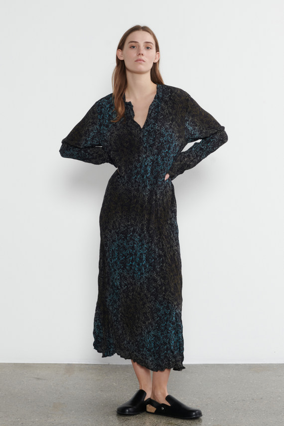 HISANA kjolen er en lang, løstsiddende kjole med droppede skuldre, der kombinerer stil med komfort. Den har en særlig twist-teknik, der tilføjer et unikt og raffineret udtryk til designet.