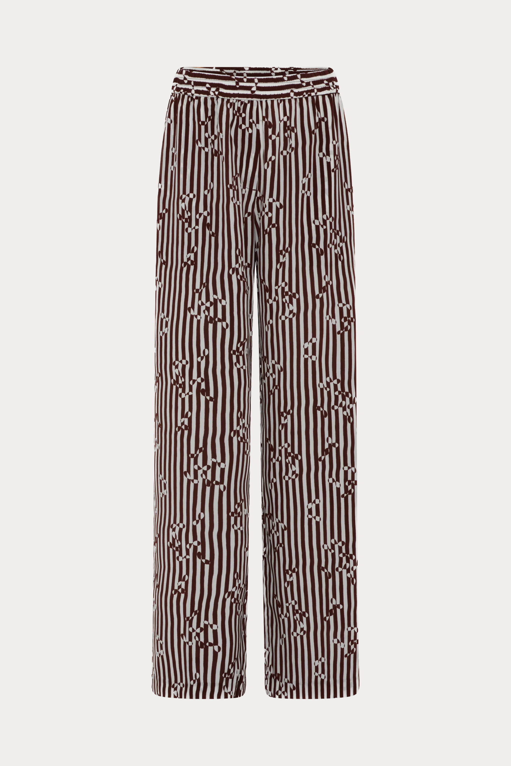 HM670Noran bukser er løstsiddende bukser med brede ben, elastisk talje og stribet mønster med diskrete blomsterdetaljer. Perfekte til et afslappet men stilfuldt look.