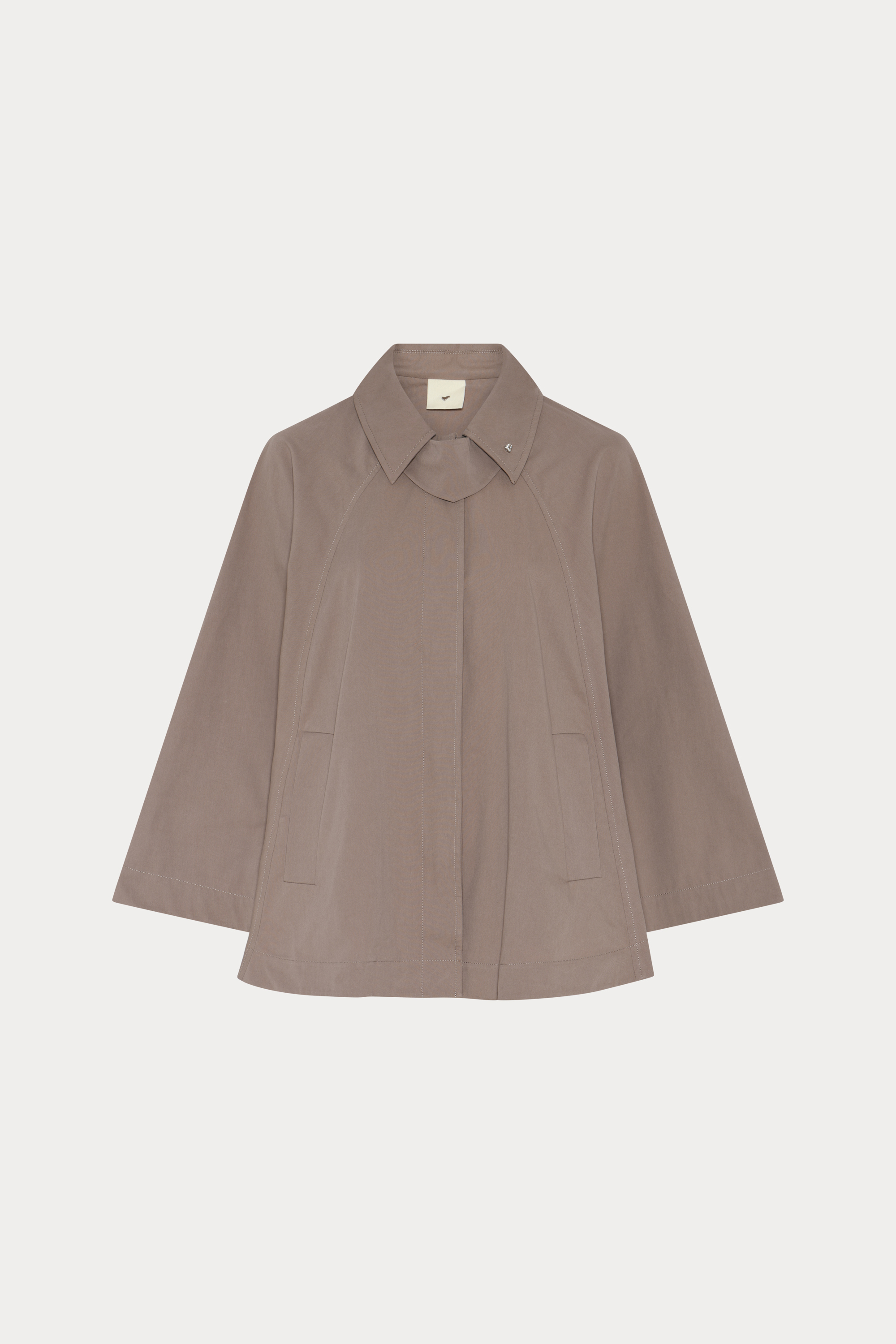 415HMBarber cape jacket is a lightweight, short jacket with a cape-inspired silhouette, wide sleeves, and a concealed closure, creating a clean, sculptural expression. Style it over a simple shirt and slim trousers for a modern, balanced look, or let it add calm structure to a printed set. It also works beautifully as a light transitional layer paired with soft knitwear. - Cape-inspired silhouette - Concealed closure - Wide sleeves - Light, structured fabric