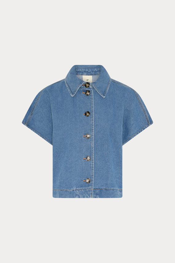 252HMBinca denim cape is a short, straight denim cape with a sharp collar, defined stitching, and a structured, boxy silhouette. Style it with dark trousers for a graphic contrast, or layer it over a simple T-shirt for a light, relaxed balance in the proportions. - Short, boxy fit - Front button closure - Defined contrast stitching - Sharp classic denim collar