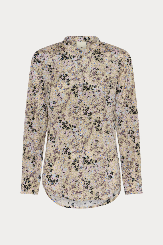 651HMMaple shirt is a light, straight shirt with a stand collar, rounded hem, and a delicate, detailed floral print that creates a calm, nuanced expression.