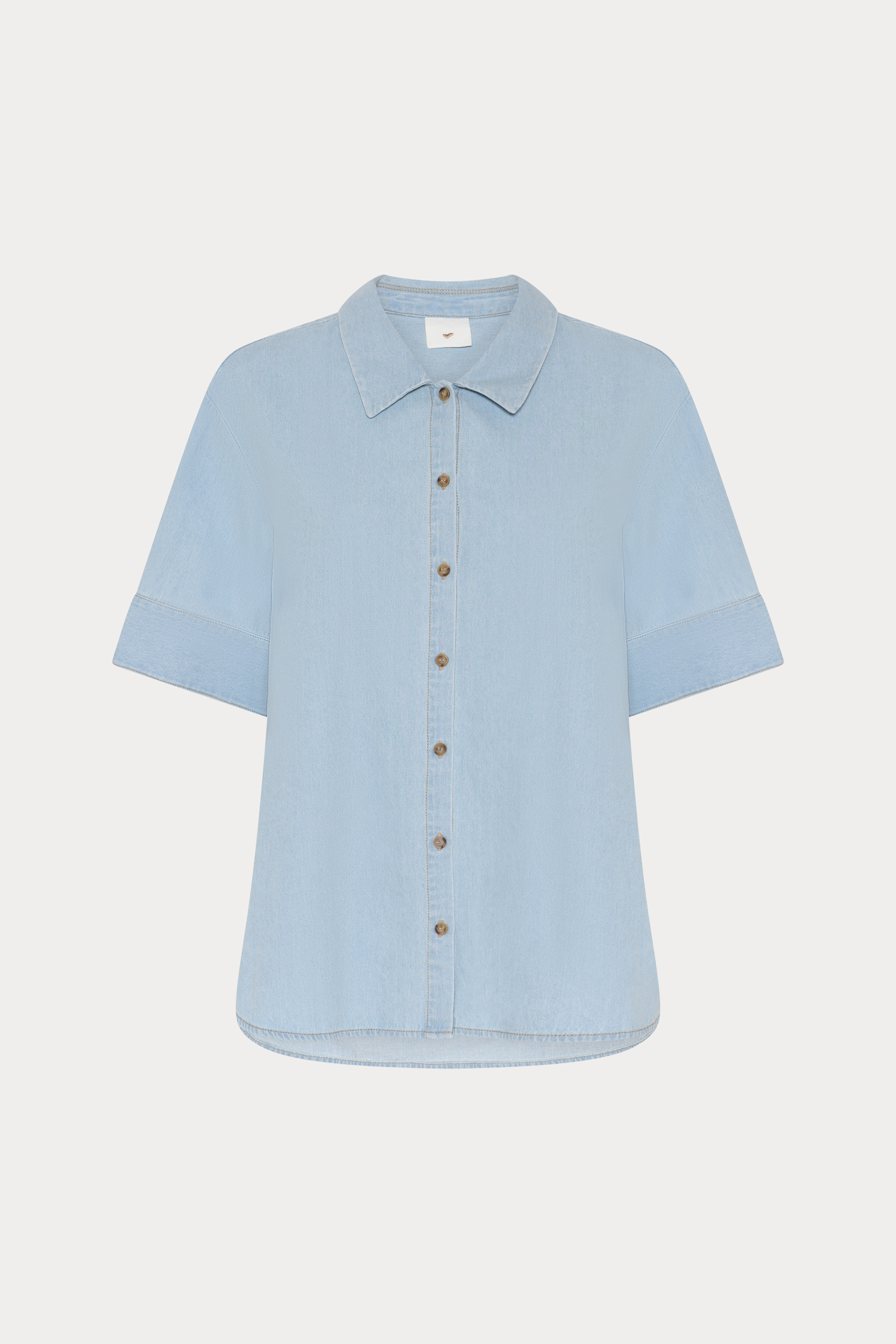 469HMMatea shirt is a relaxed denim shirt with a wide collar, short sleeves, and a rounded hem that creates a light, effortless expression.