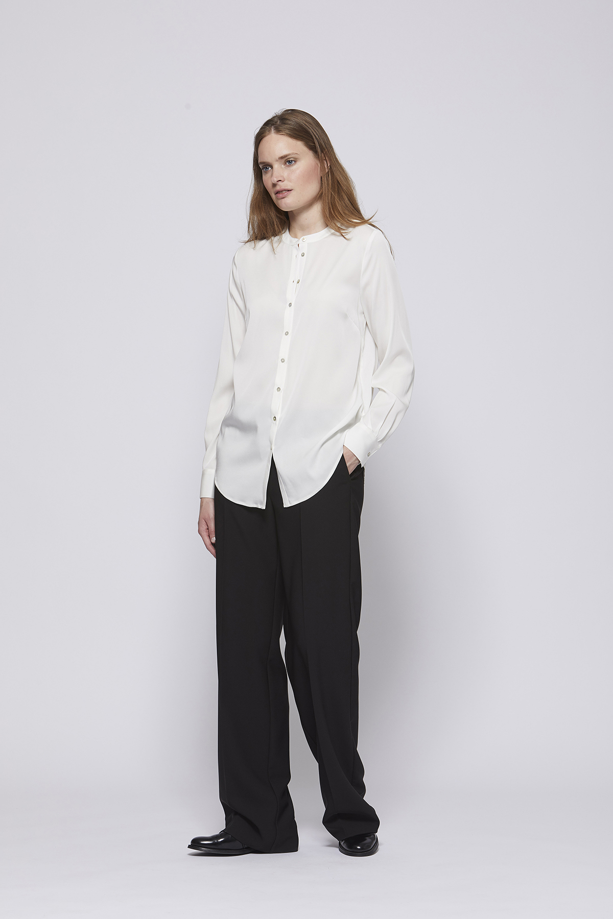 HMNeta bukser er lavtaljede bukser med skarpt pressefoldet ben og en lige, ren silhuet. Et minimalistisk grundelement med strukturel tyngde.