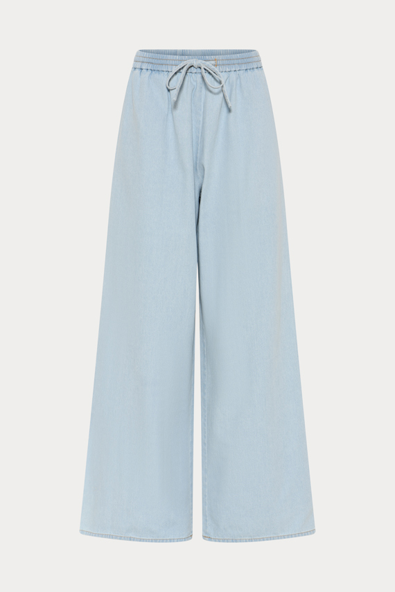 469HMNitan pants are wide, straight denim trousers with an elastic waistband and drawstring, creating a relaxed, clean silhouette with gentle drape. Style them with a light denim shirt like Matea for a harmonious tone-on-tone look, or pair them with a simple top for a calm, effortless expression. - Wide, straight legs - Full length - Elastic waist with drawstring - Light denim texture