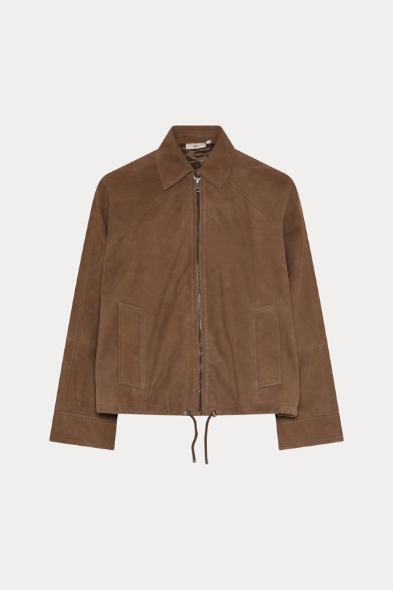 180HMRihan suede jacket is a short, straight suede jacket with a concealed zip, shaped raglan sleeves, and an adjustable drawstring hem that creates a rounded, sculptural expression. Style it with light wide trousers for a soft contrast, or layer it over a fine knit for a clean layer within a balanced silhouette. - Short, straight fit - Concealed zip - Raglan sleeves - Adjustable drawstring hem
