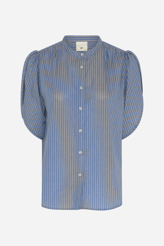463HMTulin shirt is a lightweight shirt with short rounded sleeves, a small stand collar, and a soft silhouette, where the fine stripes emphasize its calm expression. Style it with wide printed trousers for a modern contrast, or pair it with neutral trousers for a more balanced look. It also works beautifully under a light jacket for a sharp layered expression. - Relaxed silhouette - Front button closure - Short rounded sleeves - Striped weave
