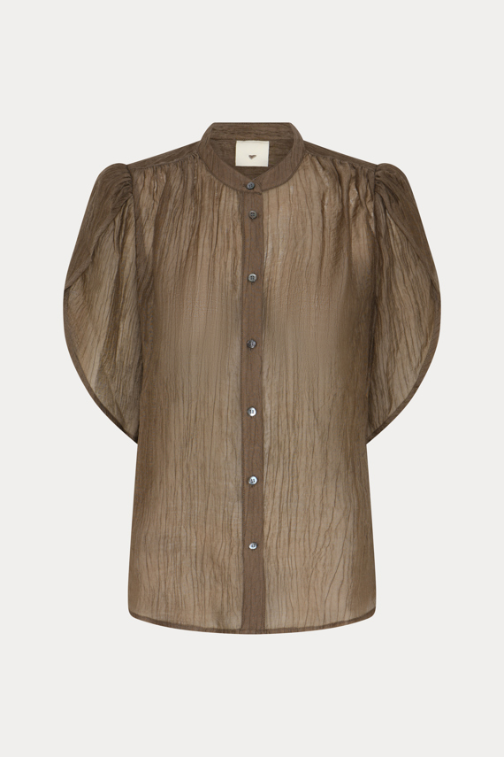 506HMTulin shirt is a lightweight, semi-sheer shirt with a relaxed fit, hip length, rounded neckline and buttoned front with softly shaped sleeves. Layer over a simple top with fluid trousers for a calm, layered look, or wear it loose over a skirt to emphasise a soft, gently moving silhouette. - Relaxed fit - Hip length - Buttoned front - Short, voluminous sleeves and rounded neckline