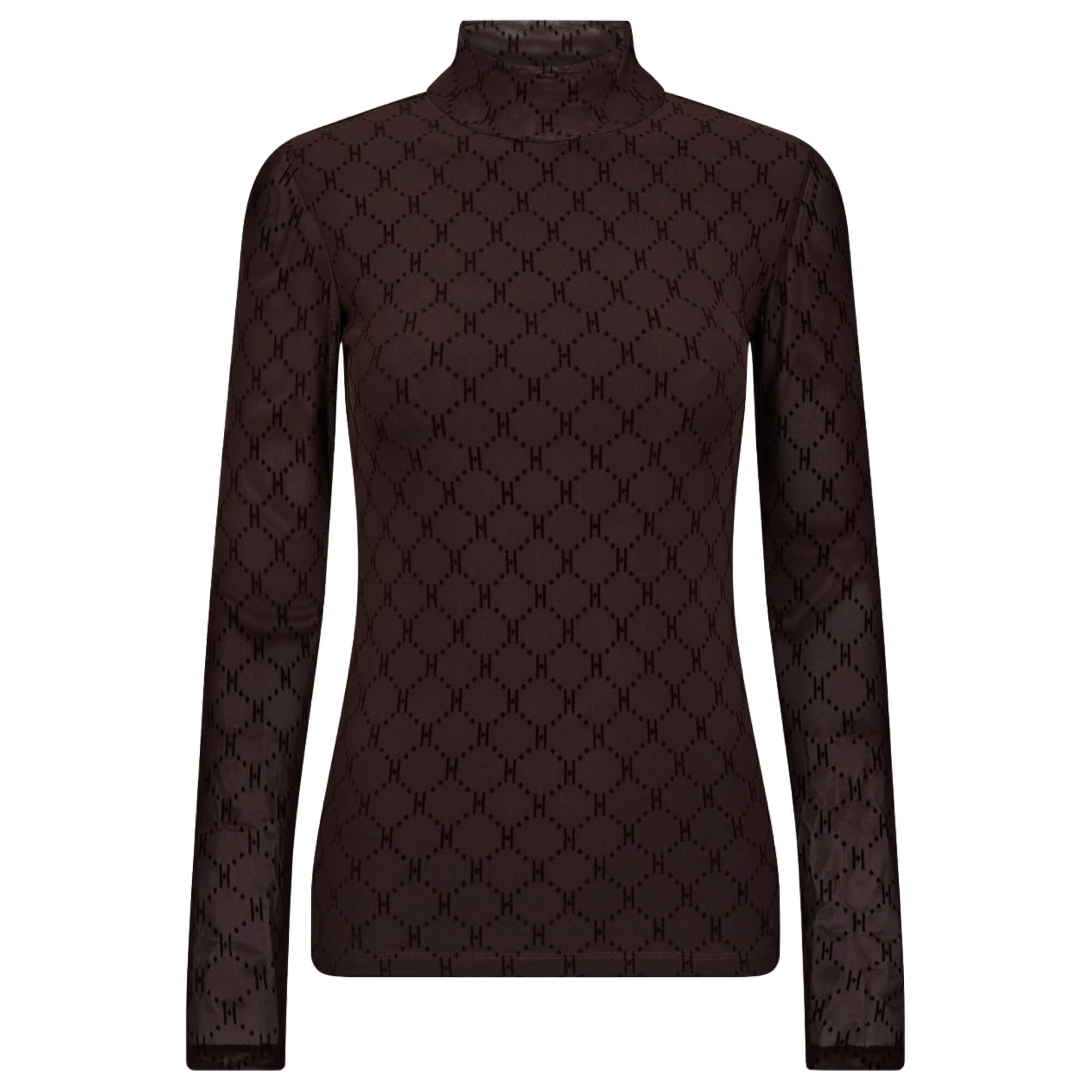 Elegant og tidløs meshbluse fra Hype The Detail i en smuk mørkebrun nuance. Blusen er designet i et let og blødt materiale med et diskret allover-logo. Den har lange ærmer og en høj hals, som tilfører et moderne og sofistikeret touch til ethvert outfit. Blusen er ikke gennemsigtig, da der er syet et ekstra lag stof i, og derved er den kun gennemsigtig på ærmerne.