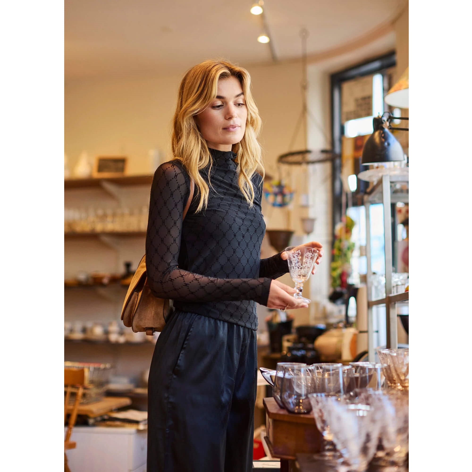 Pasformen er tætsiddende med stretch, der følger kroppens former og sikrer høj komfort. Den lette meshkvalitet gør blusen ideel til både hverdag og fest – brug den alene med en blazer udenover eller under en strik.