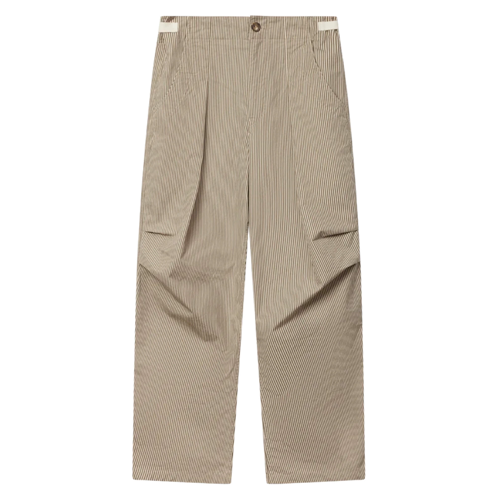 De fine Ceryne bukser er carrot-formede bukser i fin, stribet bomuldslærred. Den afslappede silhuet får et sofistikeret twist med præcise læg, afrundede sidelommer og skræddersyede detaljer som hornknap og paspolerede baglommer. Den justerbare talje med kontrastbindebånd giver et moderne touch og sikrer en behagelig pasform hele dagen.