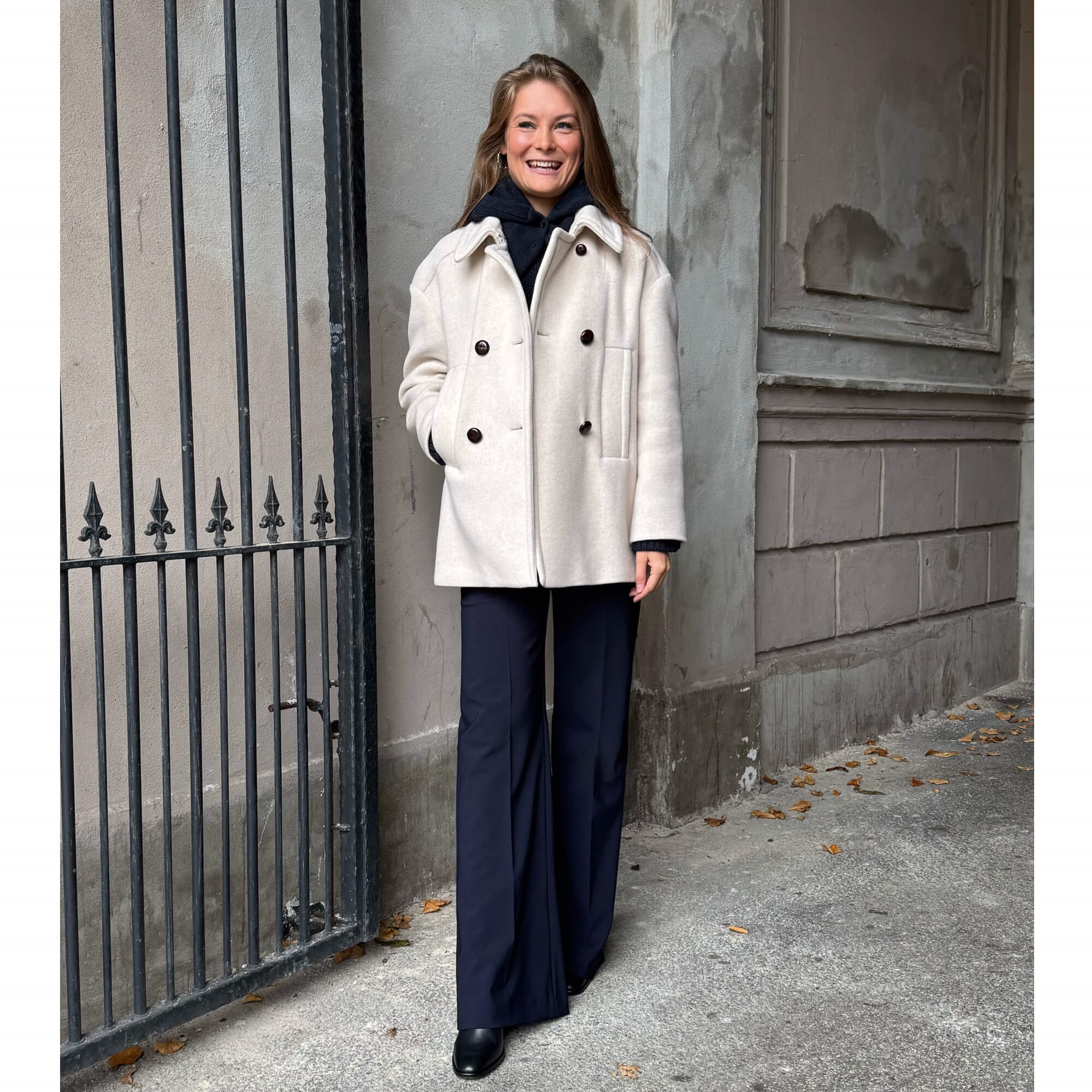 En stilren frakke i en ensfarvet uldblanding, perfekt til både hverdag og mere formelle lejligheder. Frakken har en klassisk skjortekrave og markante skulderstykker, der giver et elegant og struktureret udtryk. Den dobbeltradede front lukkes med knapper og fuldendes af lange ærmer og skrårpede forlommer med raglansnit, der tilfører et moderne twist.