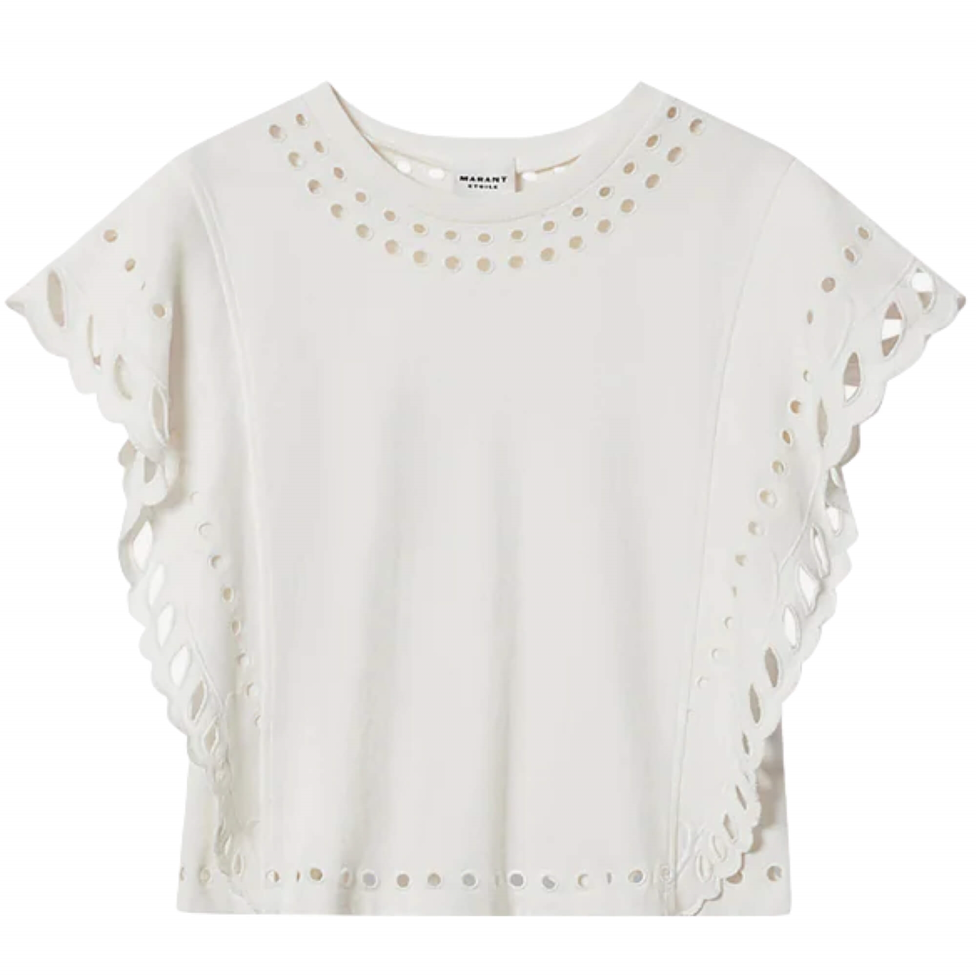 Odyle t-shirt har et enkelt udtryk med fine udskårne detaljer, der giver den lidt ekstra uden at blive for pyntet. Odyle er hvid og har en rund halsudskæring med små, runde udskæringer langs kanten, som går igen nederst på t-shirten.