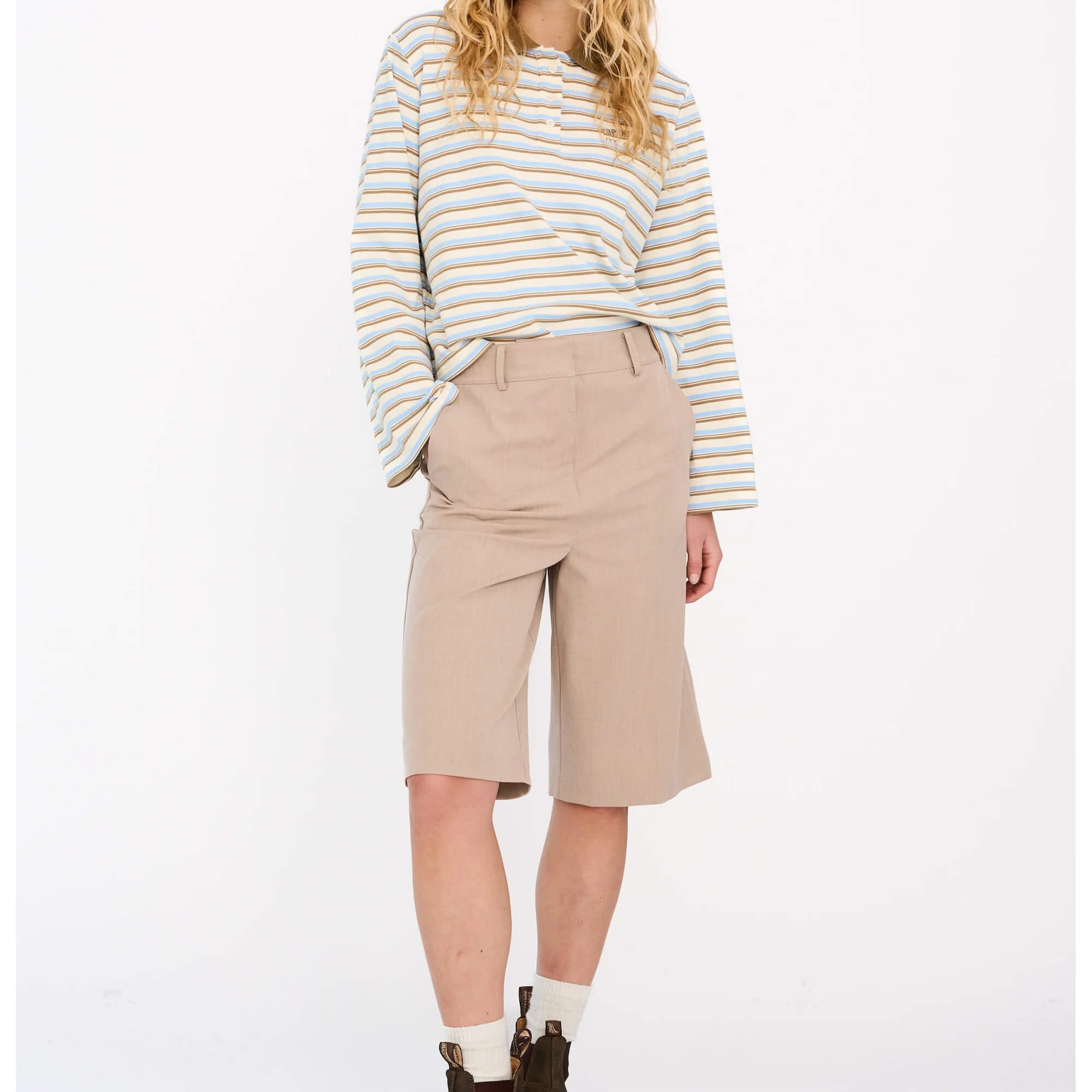 Andrea Long Shorts kombinerer skræddersyet elegance med sommerens lethed. Med høj talje, lang og afslappet benform skaber de en flatterende silhuet med blødt struktureret finish. Fremstillet i struktureret vævet stof i blød beige nuance, med diskret lynlås, skjult lukning, bæltestropper og sidelommer.