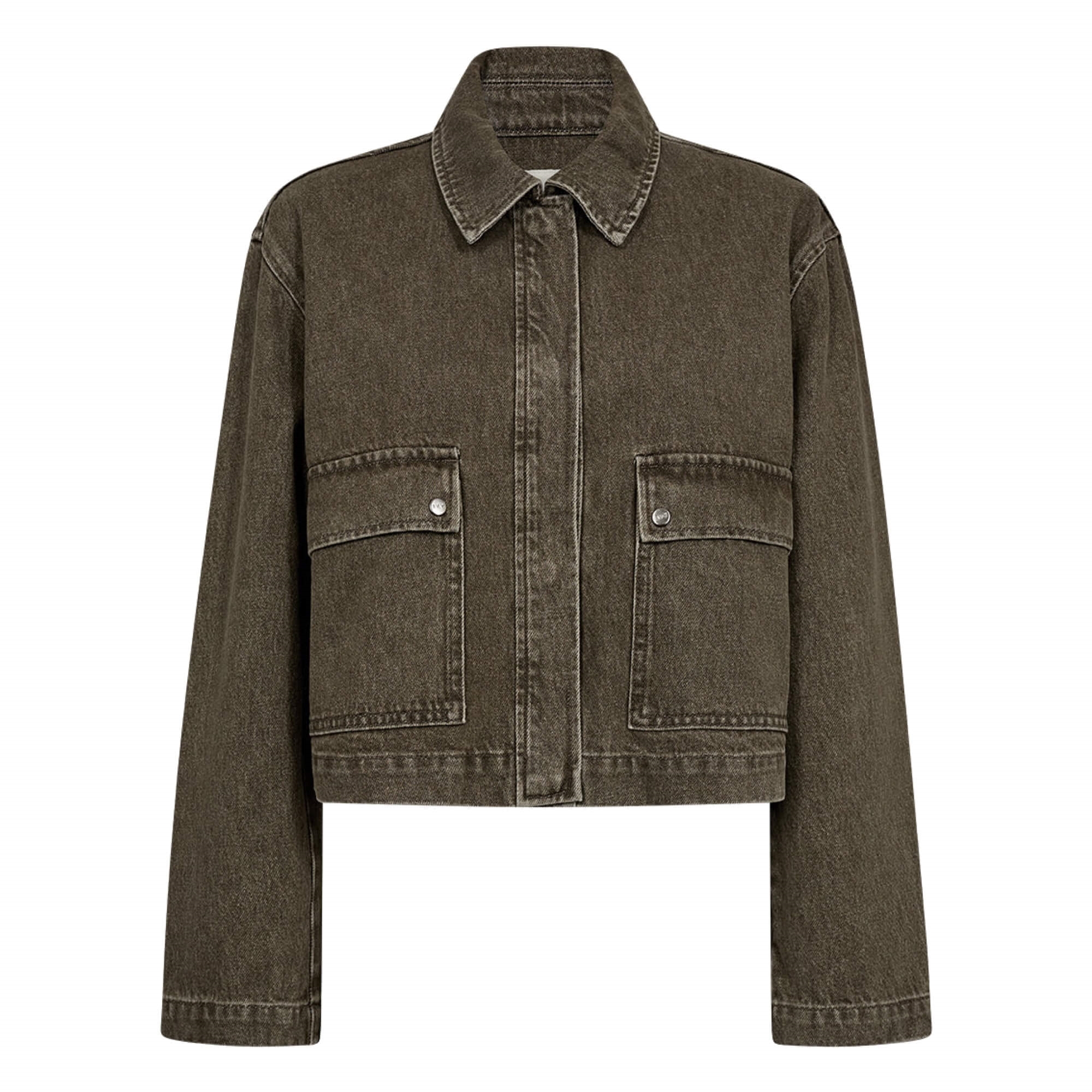 Den afdæmpede grøn-grå vask gør den let at kombinere – perfekt over strik, skjorter eller højtaljede jeans. En jakke, der giver enhver outfit et cool og tidssvarende twist.