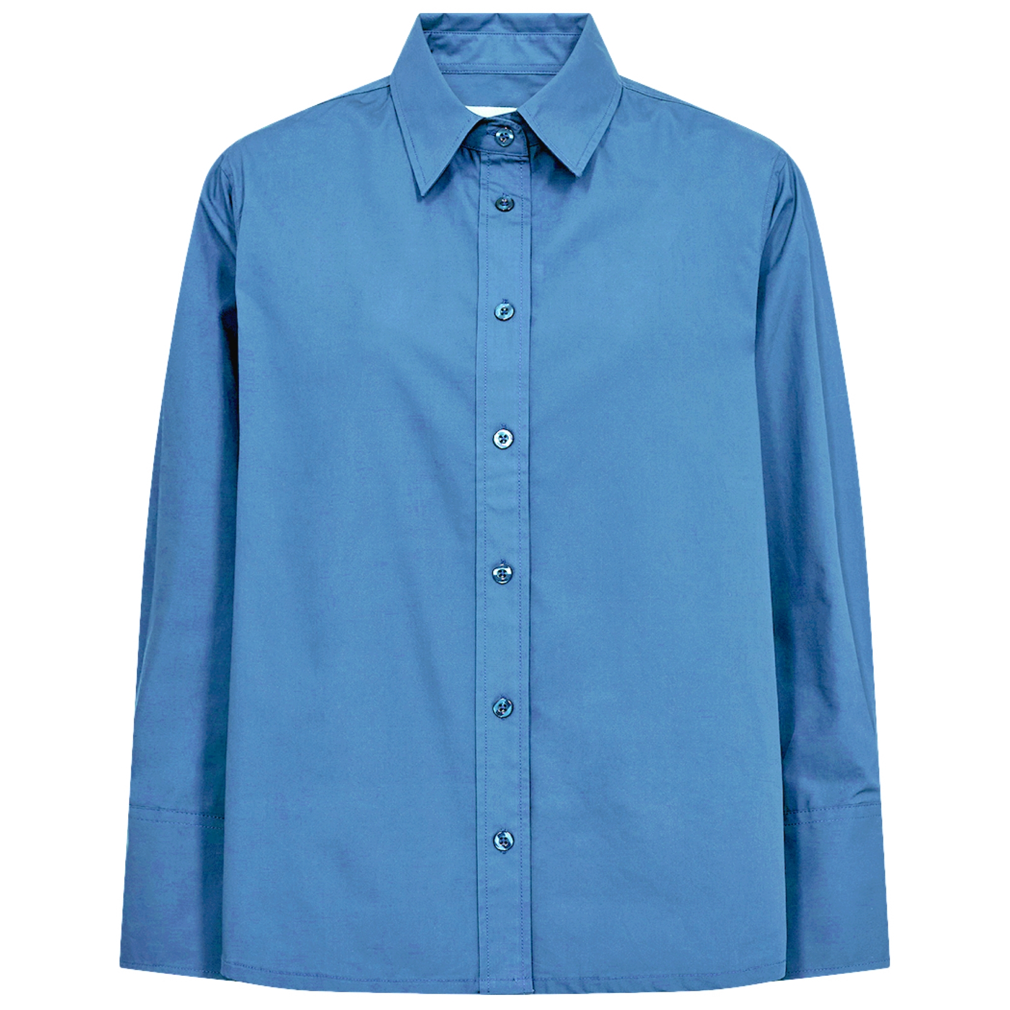 Den er skåret i en afslappet, let boxy pasform, som falder flot og giver en moderne silhuet. De lange ærmer afsluttes med brede manchetter, der understreger det rene og minimalistiske design. Stoffet fremstår glat og let, hvilket giver skjorten et eksklusivt og elegant udtryk.