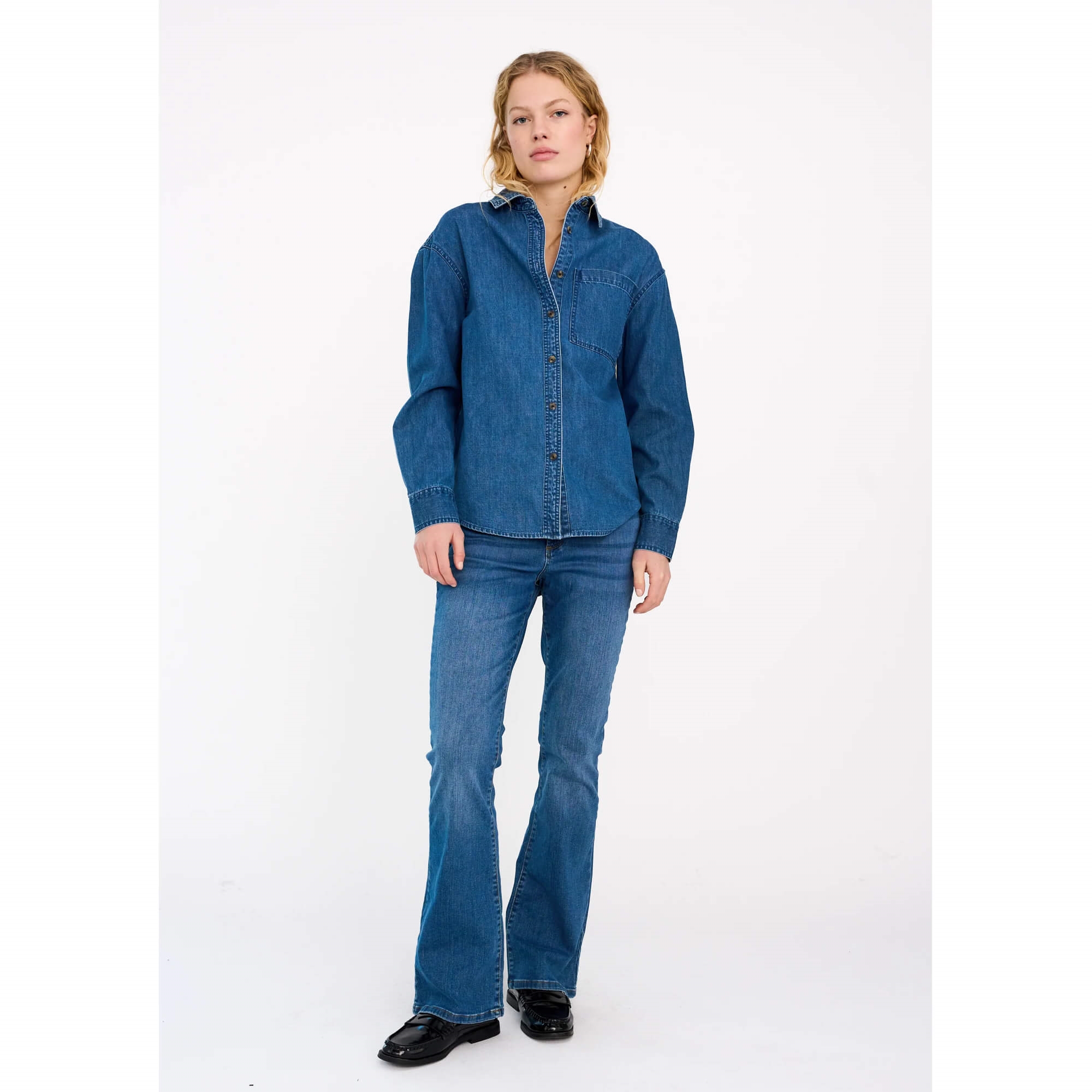 Tara Jeans fra Ivy Copenhagen giver et cool, retro-inspireret look med et moderne twist. Den mellemhøje talje kombineret med en smal pasform over låret og et markeret flare skaber en flatterende silhuet, der forlænger benene og giver det helt rigtige statement ved anklen. Vasken Medusa Indigo Blue tilfører et råt, vintage udtryk. Style dem med en denimskjorte for et gennemført denim-on-denim look, eller hold det enkelt og feminint med en klassisk hvid T-shirt. Et par jeans, der løfter enhver garderobe.