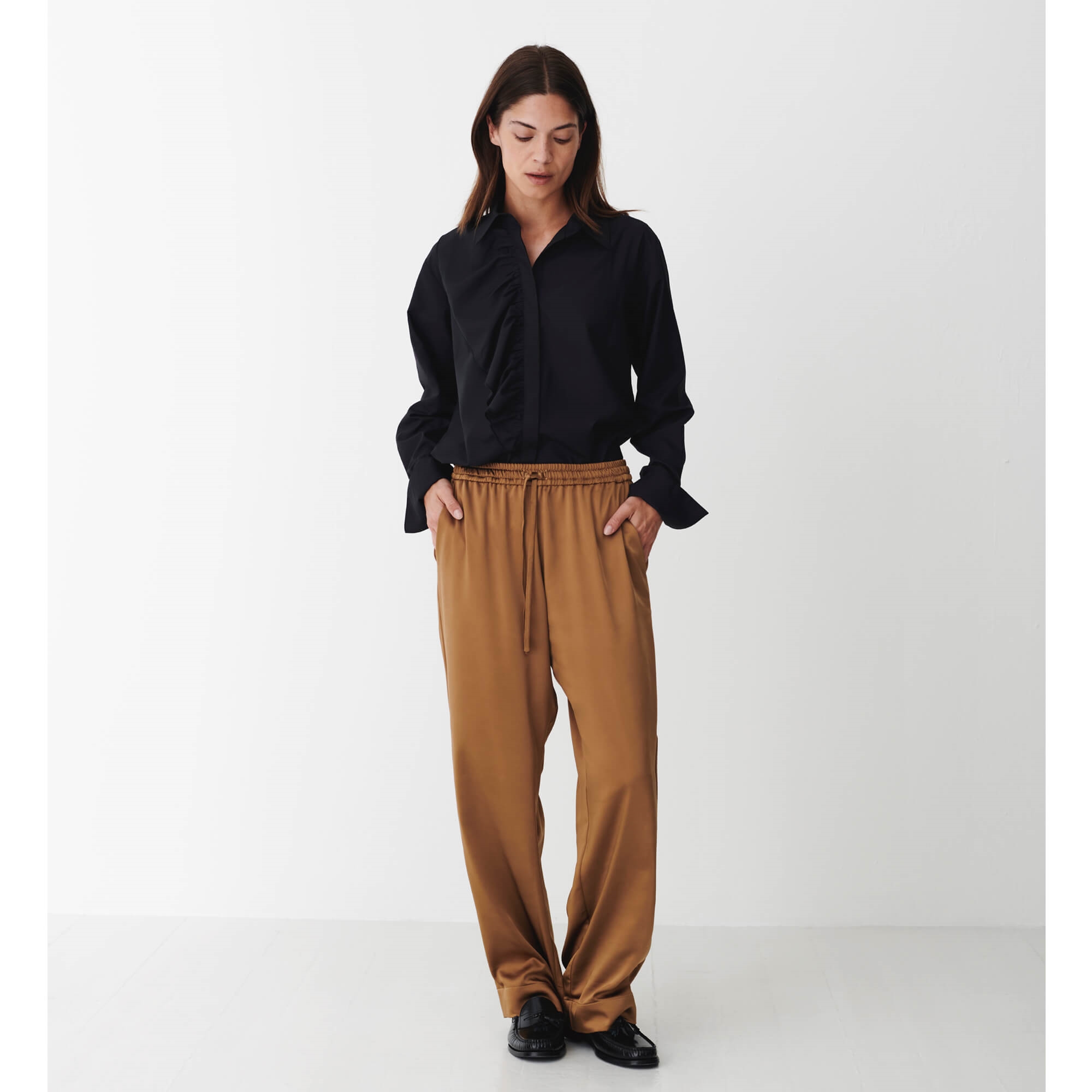 Garcia bukserne fra Karmamia er et par cool og afslappet satin bukser i den skønne farve Rich Golden Sand. Garcia bukserne er designet med en afslappet pasform, samt elastisk talje og vidde i benene. Style bukserne med den fine Ines Bluse i Semi Rich Brown.