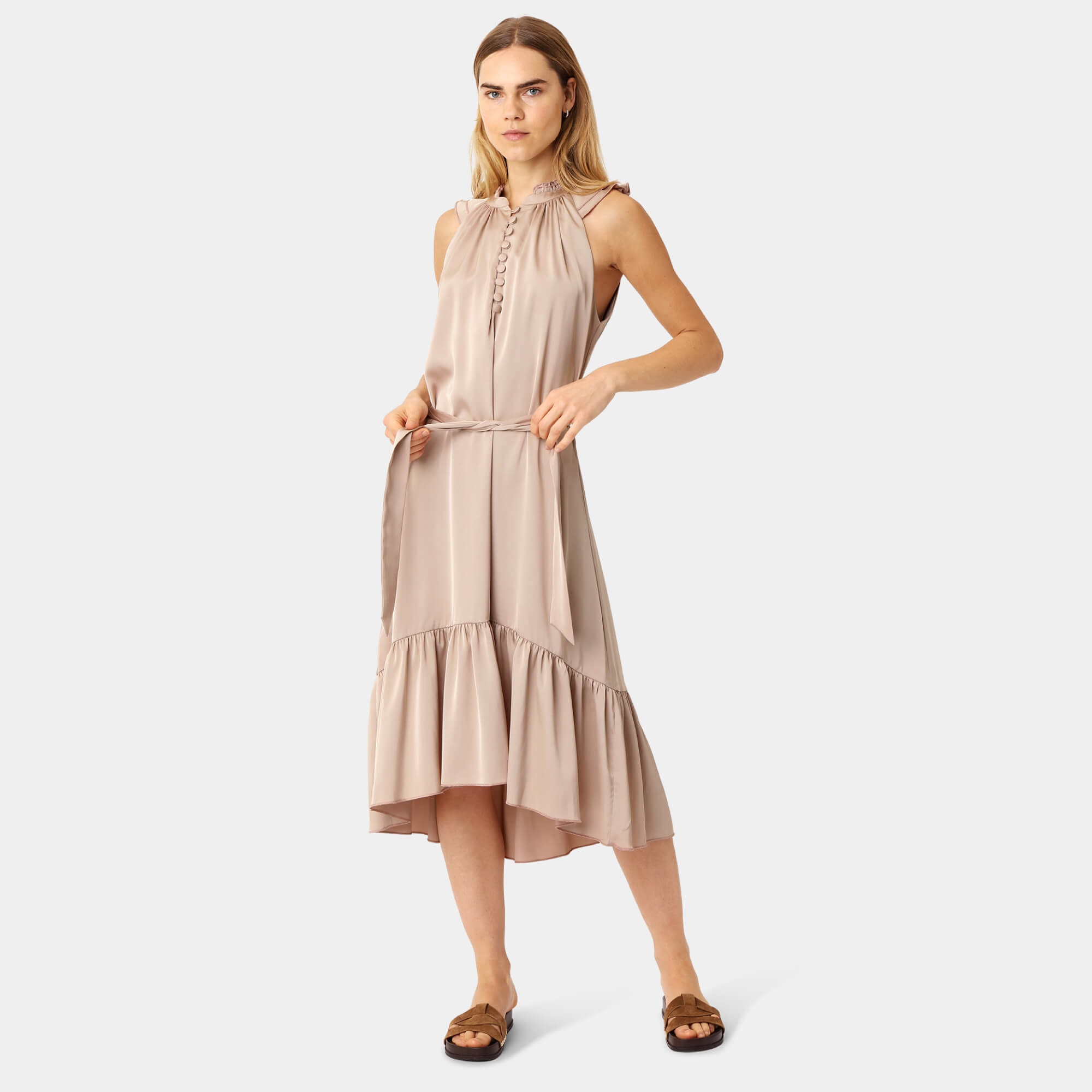 Den fine Anna kjole er en elegant og feminin midikjole med smukke flæsedetaljer langs kanten, der skaber et let og bevægeligt udtryk. Kjolen er ærmeløs og har fine, plisserede detaljer ved halsudskæringen.