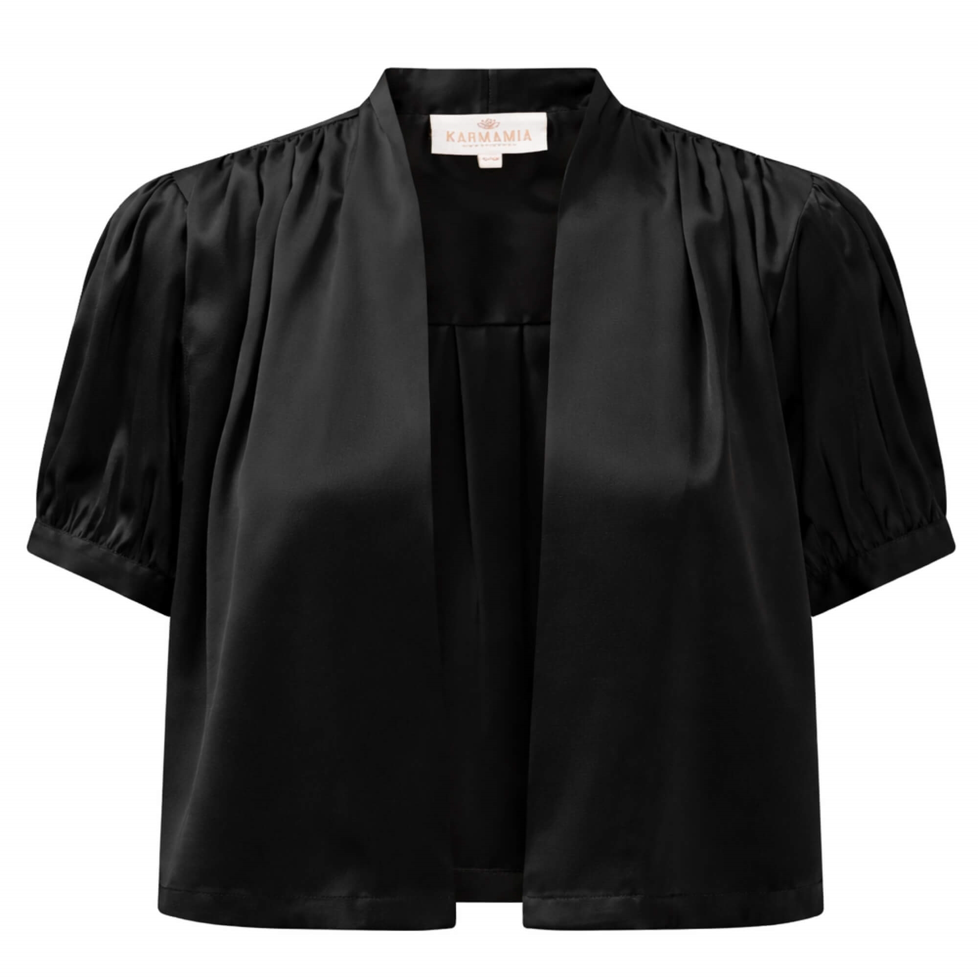 Den smukke Ellis jakke er en kort satinjakke i sort med elegante plisserede detaljer på ærmerne og ryggen. Perfekt som et let lag over enhver sommerkjole og ideel til både hverdag og særlige anledninger.