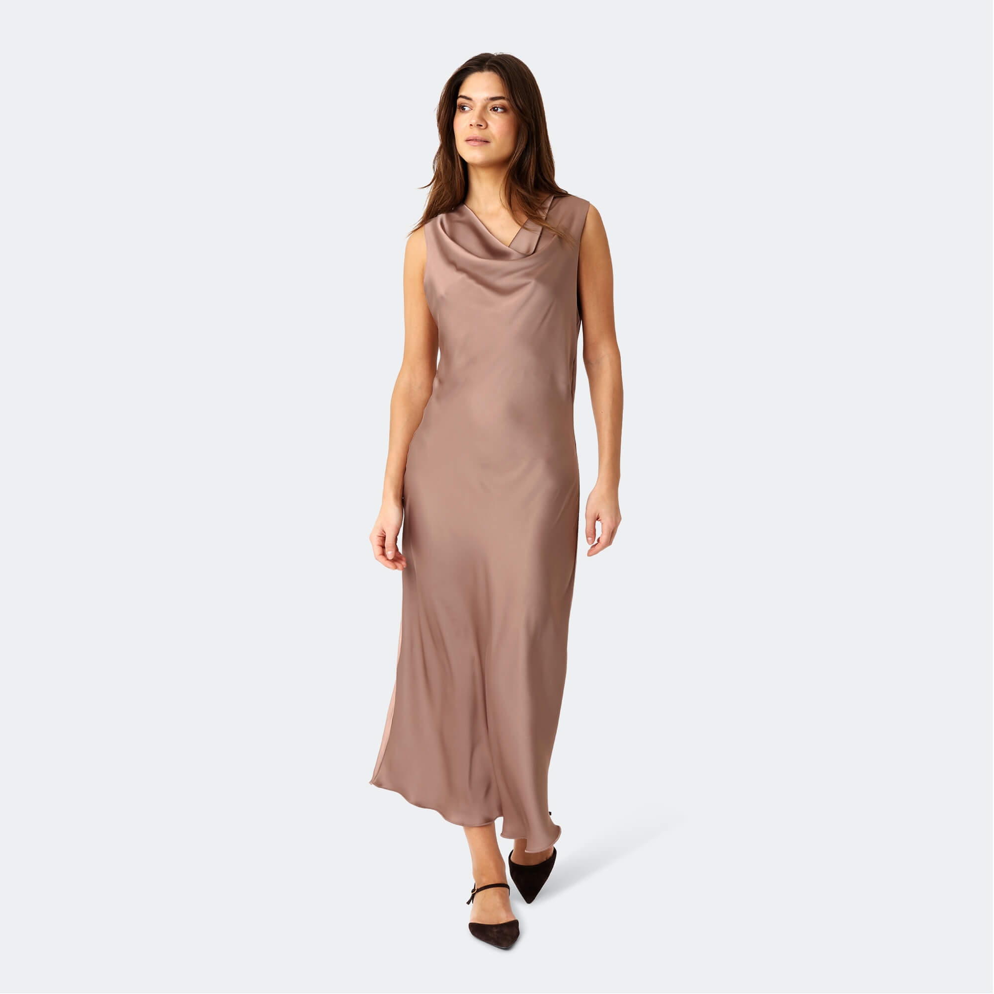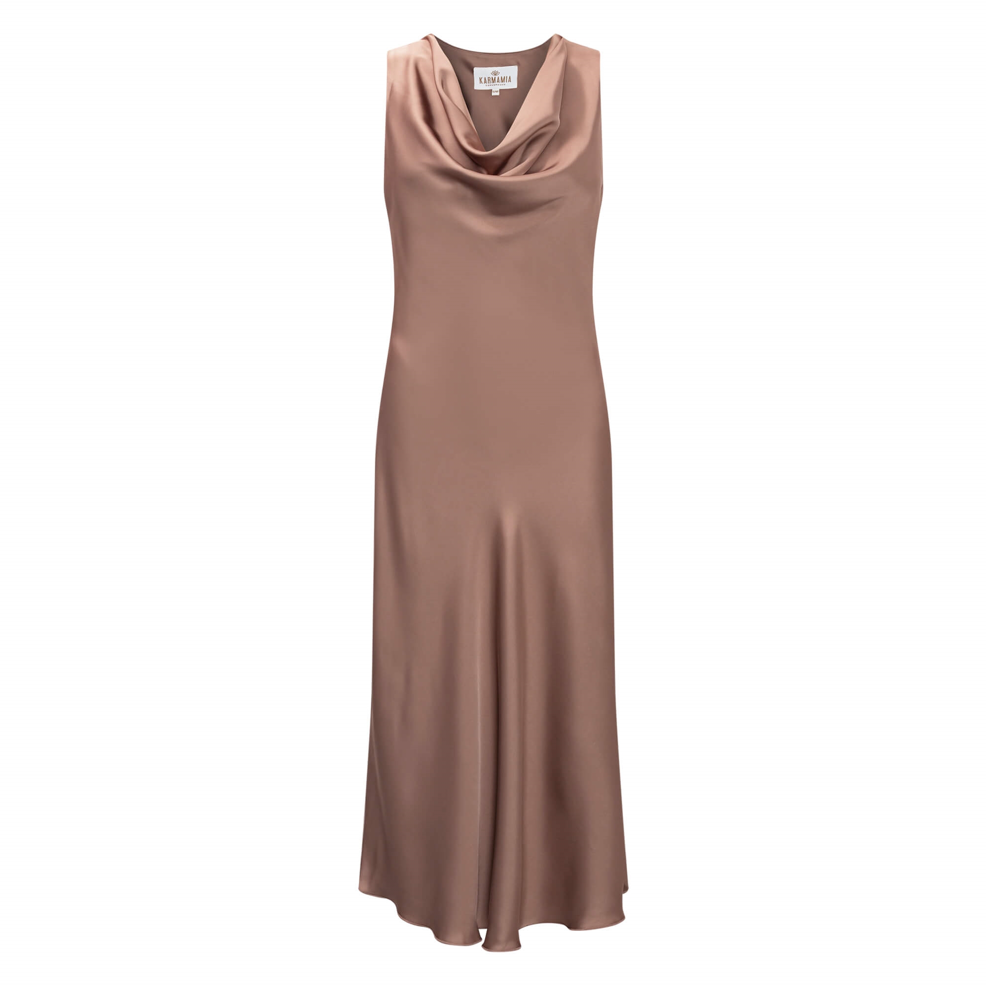 Den smukke Flow Kjole fra Karmamia i den skønne Semi Rich Tan farve. Karmamia kjolen draperer dig ubesværet fra top til tå; Intet tilbehør er nødvendigt for at fuldende et elegant look med denne skønne kjole - du vil helt sikkert være festens midtpunkt. Karmamia flow kjolen er designet med den skønneste draperede vandfalds-udskæring samt indsnævret talje og let asymmetriske forneden - som giver det smukkeste look og flatterende pasform.