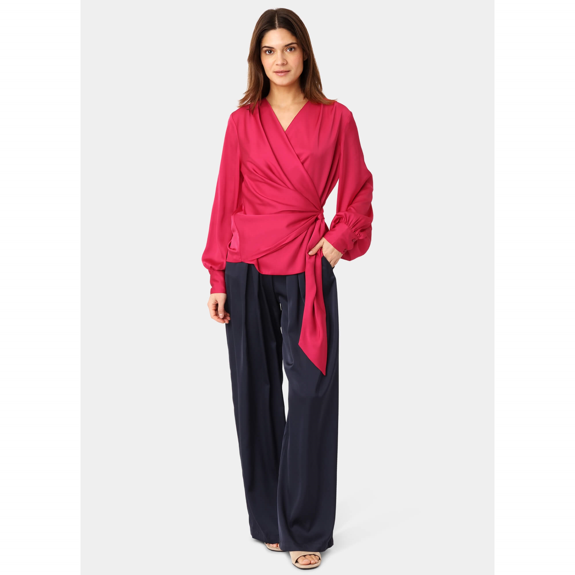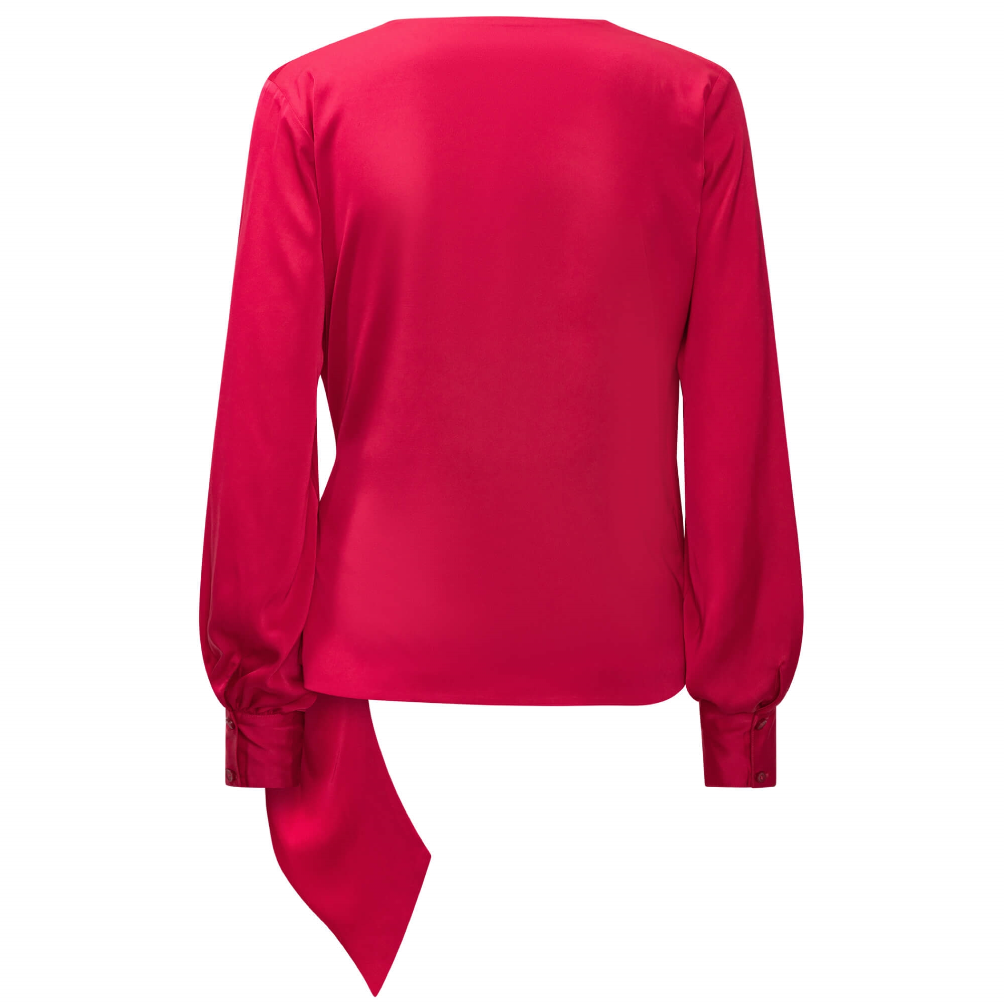 Den elegante Ines bluse er i en smuk raspberry pink farve med blød halsudskæring og satinbånd i taljen, der fremhæver figuren. Lange ærmer med brede manchetter giver et raffineret look. Fremstillet i jacquardvævet satin, der er maskinvaskbar og rynkeresistent - Perfekt til både fest og hverdag.