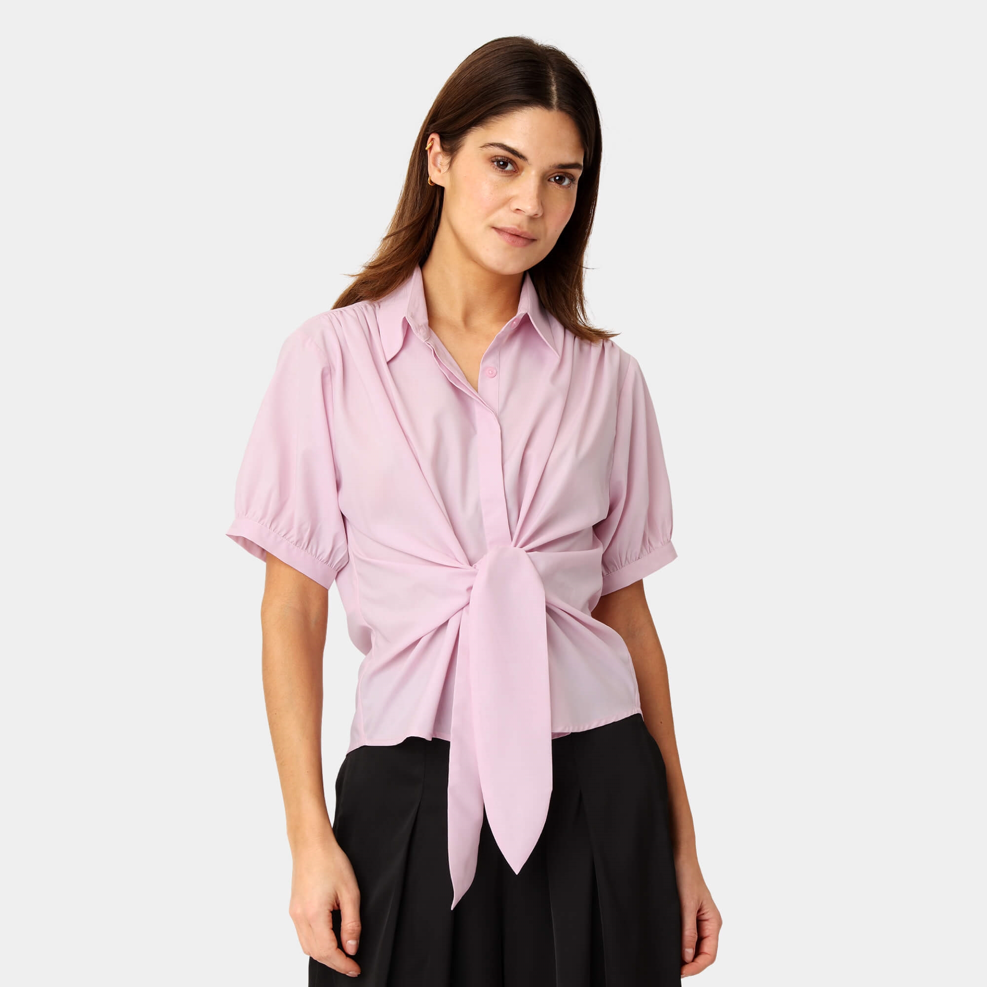 Lee skjorten bindes i en dekorativ knudedetalje i taljen, hvor stoffet samles og falder ned i et smalt bindebånd, hvilket fremhæver figuren og giver et moderne twist. Stoffet ser let og blødt ud, hvilket giver et flot, naturligt fald.